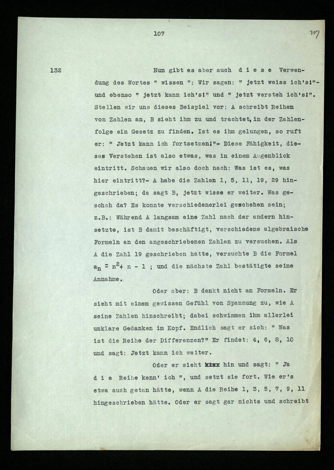 132 Nun gibt es aber auch diese Verwendung des Wortes “wissen”: Wir sagen: “jetzt weiß ich’s!” – und ebenso “jetzt kann ich’s!” und “jetzt versteh ich’s!”. Stellen wir uns dieses Beispiel vor: A schreibt Reihen von Zahlen an, B sieht ihm zu und trachtet, in der Zahlenfolge ein Gesetz zu finden. Ist es ihm gelungen, so ruft er: “Jetzt kann ich fortsetzen!” – Diese Fähigkeit, dieses Verstehen ist also etwas, was in einem Augenblick eintritt. Schauen wir also doch nach: Was ist es, was hier eintritt? – A habe die Zahlen 1, 5, 11, 19, 29 hingeschrieben; da sagt B, jetzt wisse er weiter. Was geschah da? Es konnte verschiedenerlei geschehen sein; z.B.: Während A langsam eine Zahl nach der andern hinsetzte, ist B damit beschäftigt, verschiedene algebraische Formeln an den angeschriebenen Zahlen zu versuchen. Als A die Zahl 19 geschrieben hatte, versuchte B die Formel ; und die nächste Zahl bestätigte seine Annahme. Oder aber: B denkt nicht an Formeln. Er sieht mit einem gewissen Gefühl von Spannung zu, wie A seine Zahlen hinschreibt; dabei schwimmen ihm allerlei unklare Gedanken im Kopf. Endlich sagt er sich: “Was ist die Reihe der Differenzen?” Er findet: 4, 6, 8, 10 und sagt: Jetzt kann ich weiter. Oder er sieht hin und sagt: “Ja die Reihe kenn’ ich”, und setzt sie fort. Wie er’s etwa auch getan hätte, wenn A die Reihe 1, 3, 5, 7, 9, 11 hingeschrieben hätte. Oder er sagt gar nichts und schreibt bloß in der Reihe weiter. Vielleicht hatte er eine Empfindung, die man die Empfindung “das ist leicht!” nennen kann. (Eine solche Empfindung ist z.B. die eines leichten, schnellen Einziehens des Atems, ähnlich wie bei einem gelinden Schreck.)