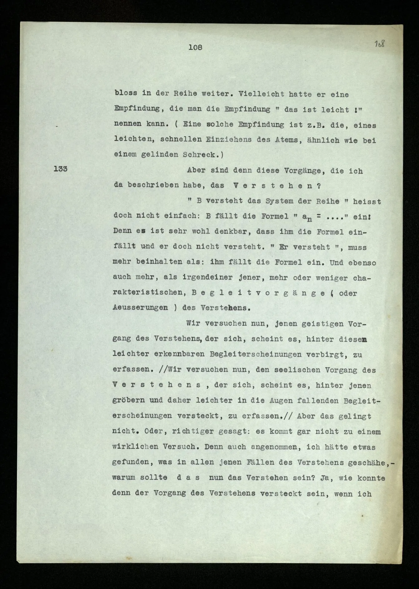 133 Aber sind denn diese Vorgänge, die ich da beschrieben habe, das Verstehen? “B versteht das System der Reihe” heißt doch nicht einfach: B fällt die Formel “” ein! Denn es ist sehr wohl denkbar, daß ihm die Formel einfällt und er doch nicht versteht. “Er versteht”, muß mehr beinhalten als: ihm fällt die Formel ein. Und ebenso auch mehr, als irgendeiner jener, mehr oder weniger charakteristischen, Begleitvorgänge (oder Äußerungen) des Verstehens. Wir versuchen nun, jenen geistigen Vorgang des Verstehens, der sich, scheint es, hinter diesen leichter erkennbaren Begleiterscheinungen verbirgt, zu erfassen. Aber das gelingt nicht. Oder, richtiger gesagt: es kommt gar nicht zu einem wirklichen Versuch. Denn auch angenommen, ich hätte etwas gefunden, was in allen jenen Fällen des Verstehens geschähe, – warum sollte das nun das Verstehen sein? Ja wie konnte denn der Vorgang des Verstehens versteckt sein, wenn ich doch sagte, “jetzt verstehe ich”, weil ich verstand?! Und wenn ich sage, er ist versteckt, – wie weiß ich denn, wonach ich zu suchen habe? – Ich bin in einem Wirrwarr.