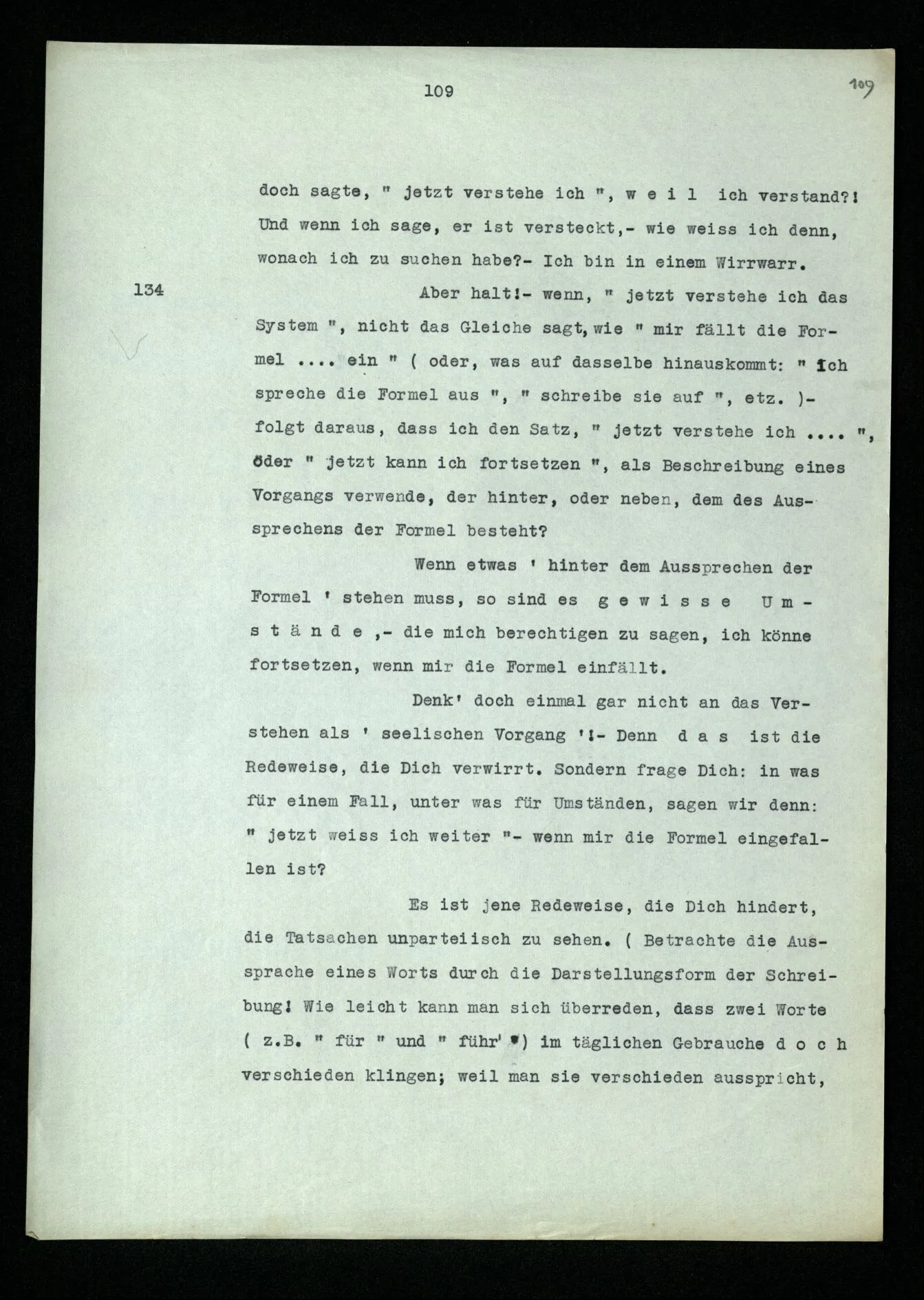 134 Aber halt: wenn, “jetzt verstehe ich das System”, nicht das Gleiche sagt, wie “mir fällt die Formel … ein”(oder, was auf dasselbe hinauskommt: “ich spreche die Formel aus”, “schreibe sie auf”, etc.) – folgt daraus, daß ich den Satz, “jetzt verstehe ich …”, oder “jetzt kann ich fortsetzen”, als Beschreibung eines Vorgangs verwende, der hinter, oder neben, dem des Aussprechens der Formel besteht? Wenn etwas ‘hinter dem Aussprechen der Formel’ stehen muß, so sind es gewisse Umstände, – die mich berechtigen zu sagen, ich könne fortsetzen, wenn mir die Formel einfällt. Denk’ doch einmal gar nicht an das Verstehen als ‘seelischen Vorgang’! – Denn das ist die Redeweise, die Dich verwirrt. Sondern frage Dich: in was für einem Fall, unter was für Umständen, sagen wir denn: “jetzt weiß ich weiter”– wenn mir die Formel eingefallen ist? Es ist jene Redeweise, die Dich hindert, die Tatsachen unparteiisch zu sehen. (Betrachte die Aussprache eines Worts durch die Darstellungsform der Schreibung! Wie leicht kann man sich überreden, daß zwei Worte (z.B. “für” und “führ’”) im täglichen Gebrauche doch verschieden klingen; weil man sie verschieden ausspricht, wenn man sein Augenmerk gerade auf den Unterschied ihrer Schreibung richtet. Damit zu vergleichen: die Meinung, ein Violinspieler mit feinem Gehör greife f immer etwas höher als eis. Überlege Dir solche Fälle! So kann das Darstellungsmittel eine Einbildung erzeugen.) Also denk’ nicht, Du müßtest einen spezifischen seelischen Vorgang finden, weil das Tätigkeitswort “verstehen” dasteht und weil man sagt: Verstehen sei eine seelische Tätigkeit. Ich wollte also sagen: Wenn er plötzlich weiter wußte, das System verstand, so hatte er allerdings ein besonderes Erlebnis – welches er etwa beschreiben wird, wenn man ihn fragt: “wie war das, was ging da vor, als Du das System plötzlich begriffst?”, ähnlich, wie wir es in (132) beschrieben haben – das aber, was ihn für uns berechtigt, in so einem Fall zu sagen, er verstehe, er wisse weiter, sind die Umstände, unter denen er ein solches Erlebnis hatte. Dies wird aber klarer werden, wenn ich die Betrachtung der Worte “verstehen” und “wissen” hier unterbreche und die eines andern Wortes einschalte, nämlich des Wortes “lesen”.