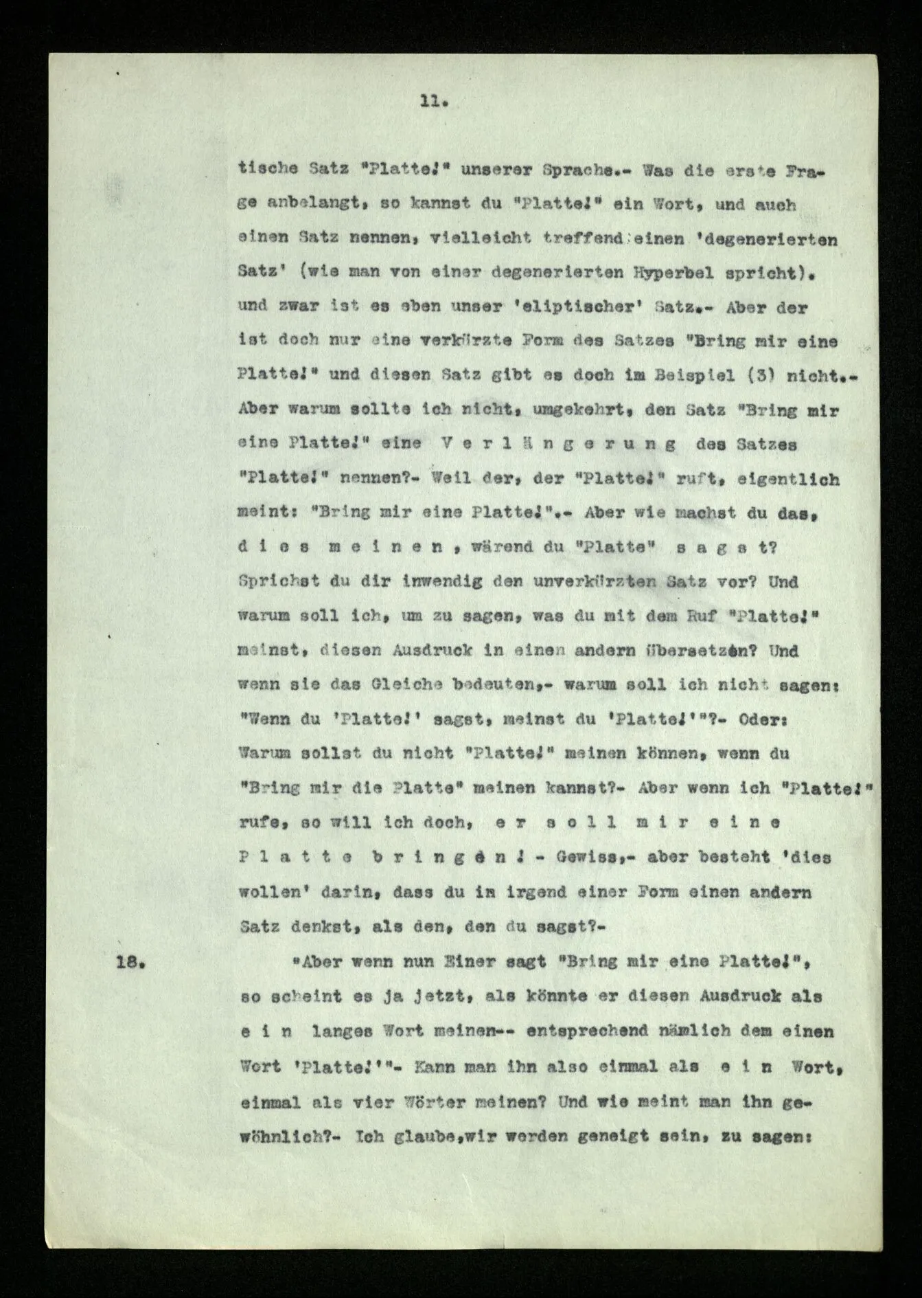 17. Wie ist es aber, – ist der Ruf “Platte!” im Beispiel (3) ein Satz, oder ein Wort? – Wenn ein Wort, so hat es doch nicht dieselbe Bedeutung, wie das gleichlautende unserer gewöhnlichen Sprache, denn in der Sprache (3) ist es ja ein Ruf; wenn aber ein Satz, so ist es doch nicht der elliptische Satz “Platte!” unserer Sprache. – Was die erste Frage anbelangt, so kannst du “Platte!” ein Wort, und auch einen Satz nennen, vielleicht treffend: einen ‘degenerierten Satz’ (wie man von einer degenerierten Hyperbel spricht). und zwar ist es eben unser ‘elliptischer’ Satz. – Aber der ist doch nur eine verkürzte Form des Satzes “Bring mir eine Platte!” und diesen Satz gibt es doch im Beispiel (3) nicht. – Aber warum sollte ich nicht, umgekehrt, den Satz “Bring mir eine Platte!” eine Verlängerung des Satzes “Platte!” nennen? – Weil der, der “Platte!” ruft, eigentlich meint: “Bring mir eine Platte!”. – Aber wie machst du das, dies meinen, während du “Platte” sagst? Sprichst du dir inwendig den unverkürzten Satz vor? Und warum soll ich, um zu sagen, was du mit dem Ruf “Platte!” meinst, diesen Ausdruck in einen andern übersetzen? Und wenn sie das Gleiche bedeuten, – warum soll ich nicht sagen: “Wenn du ‘Platte!’ sagst, meinst du ‘Platte!’”? – Oder: Warum sollst du nicht “Platte!” meinen können, wenn du “Bring mir die Platte!” meinen kannst? – Aber wenn ich “Platte!” rufe, so will ich doch, er soll mir eine Platte bringen! – Gewiß, – aber besteht ‘dies wollen’ darin, daß du in irgend einer Form einen andern Satz denkst, als den, den du sagst? –