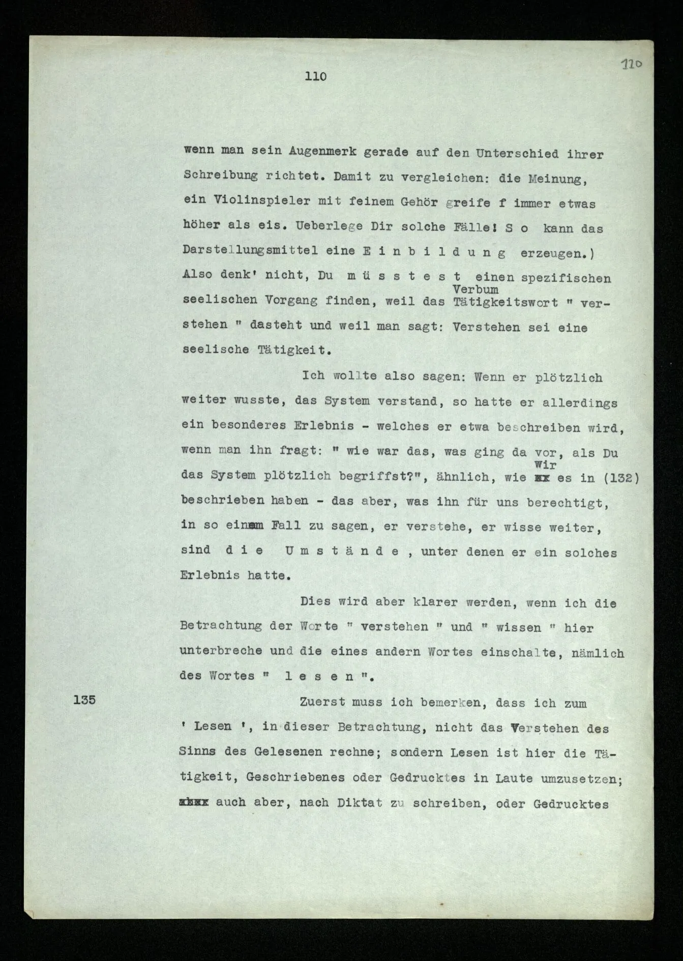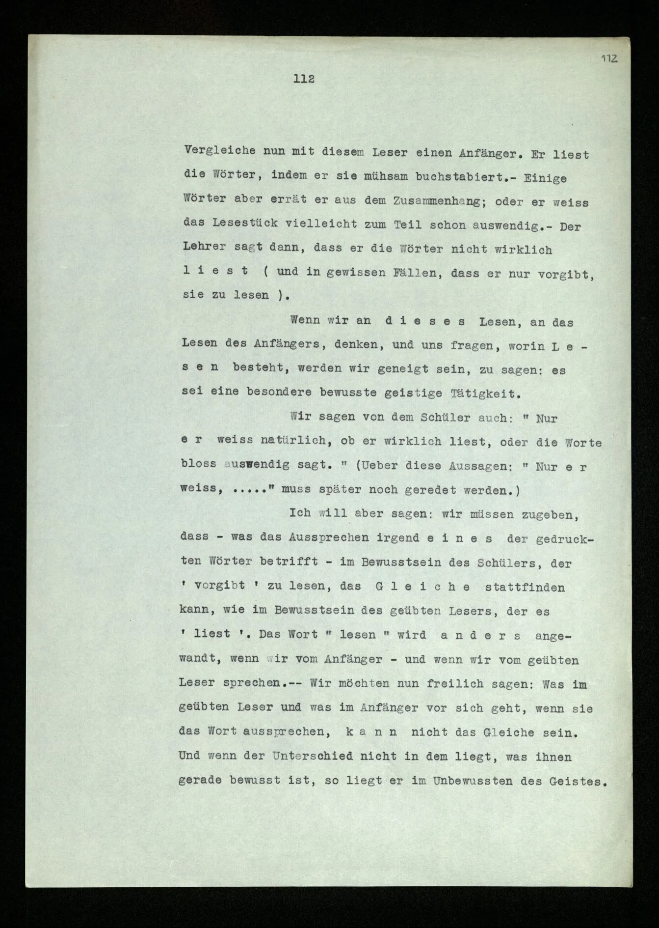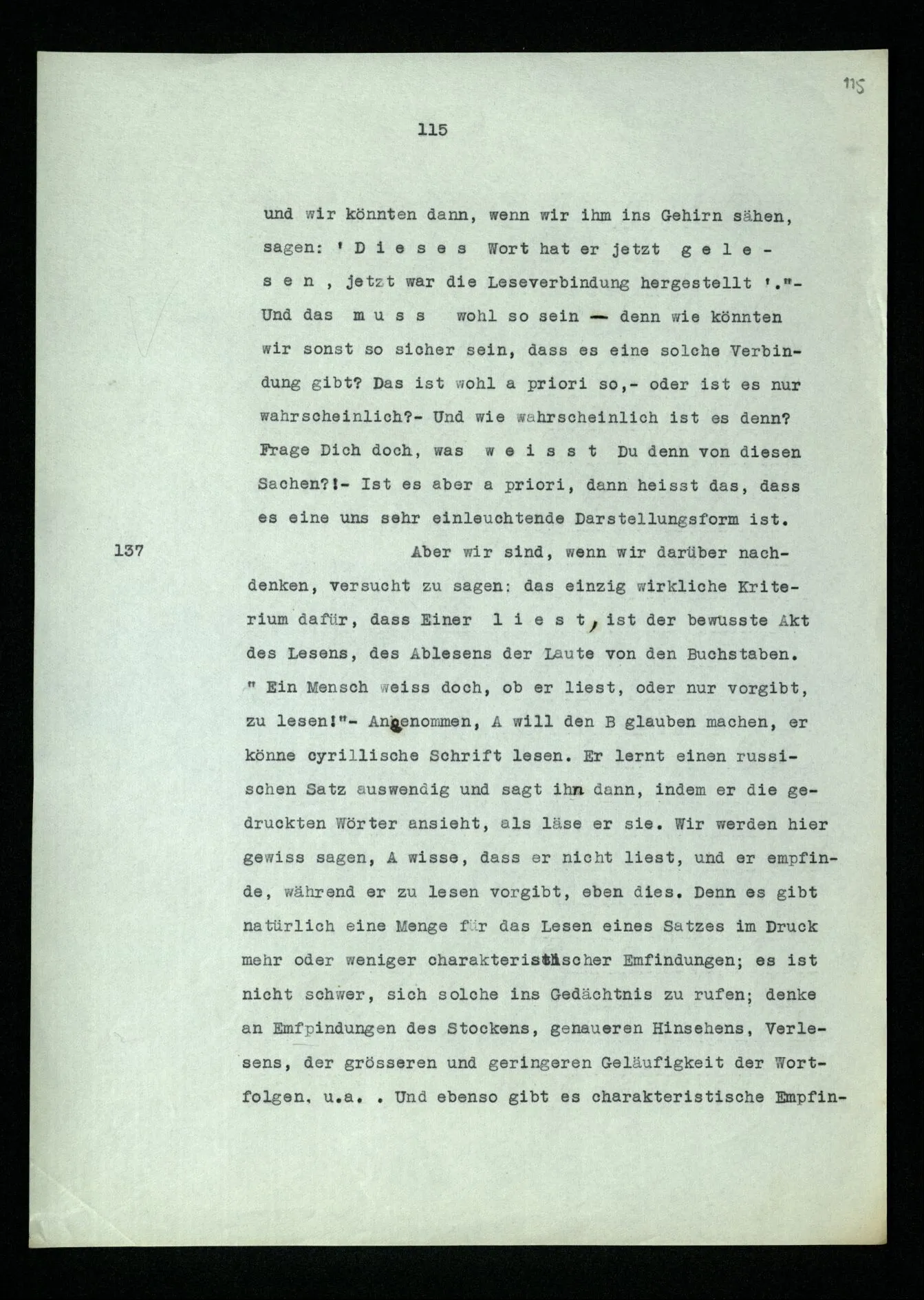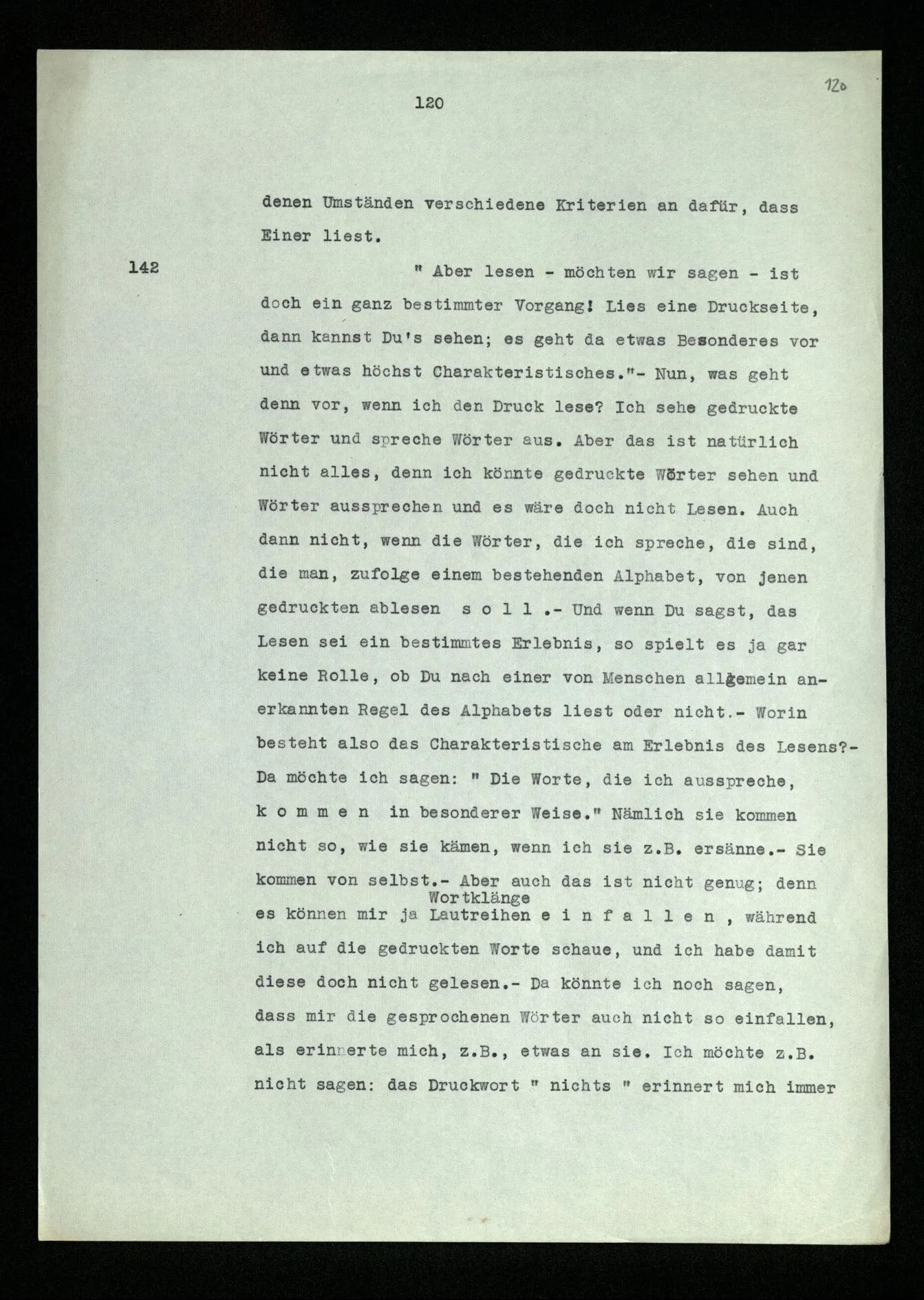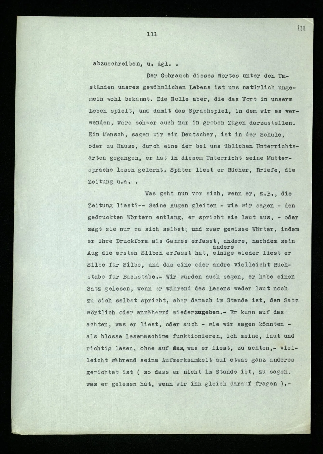 142 “Aber lesen – möchten wir sagen – ist doch ein ganz bestimmter Vorgang! Lies eine Druckseite, dann kannst Du’s sehen, es geht da etwas Besonderes vor und etwas höchst Charakteristisches.” – Nun, was geht denn vor, wenn ich den Druck lese? Ich sehe gedruckte Wörter und spreche Wörter aus. Aber das ist natürlich nicht alles, denn ich könnte gedruckte Wörter sehen und Wörter aussprechen und es wäre doch nicht Lesen. Auch dann nicht, wenn die Wörter, die ich spreche, die sind, die man, zufolge einem bestehenden Alphabet, von jenen gedruckten ablesen soll. – Und wenn Du sagst, das Lesen sei ein bestimmtes Erlebnis, so spielt es ja gar keine Rolle, ob Du nach einer von Menschen allgemein anerkannten Regel des Alphabets liest oder nicht. – Worin besteht also das Charakteristische am Erlebnis des Lesens? – Da möchte ich sagen: “Die Worte, die ich ausspreche, kommen in besonderer Weise.” Nämlich sie kommen nicht so, wie sie kämen, wenn ich sie z.B. ersänne. – Sie kommen von selbst. – Aber auch das ist nicht genug; denn es können mir ja Lautreihen einfallen, während ich auf die gedruckten Worte schaue, und ich habe damit diese doch nicht gelesen. – Da könnte ich noch sagen, daß mir die gesprochenen Wörter auch nicht so einfallen, als erinnerte mich, z.B., etwas an sie. Ich möchte z.B. nicht sagen: das Druckwort “nichts” erinnert mich immer an den Laut “nichts”. – Sondern die gesprochenen Wörter schlüpfen beim Lesen gleichsam herein. Ja, ich kann ein deutsches gedrucktes Wort gar nicht ansehen, ohne einen eigentümlichen Vorgang des innern Hörens des Wortklangs.