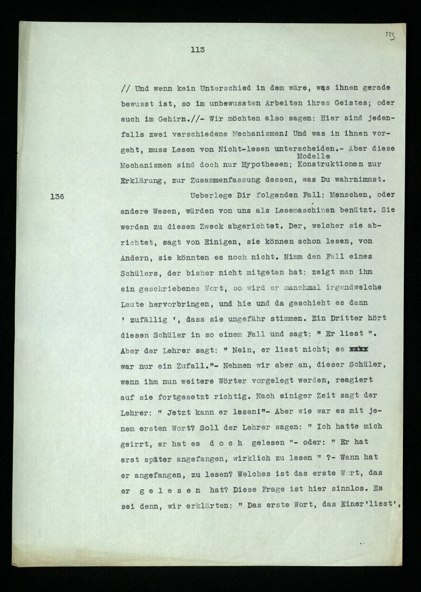 135 Zuerst muß ich bemerken, daß ich zum ‘Lesen’, in dieser Betrachtung, nicht das Verstehen des Sinns des Gelesenen rechne; sondern Lesen ist hier die Tätigkeit, Geschriebenes oder Gedrucktes in Laute umzusetzen; auch aber, nach Diktat zu schreiben, oder Gedrucktes abzuschreiben, und dergleichen. Der Gebrauch dieses Wortes unter den Umständen unsres gewöhnlichen Lebens ist uns natürlich ungemein wohl bekannt. Die Rolle aber, die das Wort in unserm Leben spielt, und damit das Sprachspiel, in dem wir es verwenden, wäre schwer auch nur in groben Zügen darzustellen. Ein Mensch, sagen wir ein Deutscher, ist in der Schule, oder zu Hause, durch eine der bei uns üblichen Unterrichtsarten gegangen, er hat in diesem Unterricht seine Muttersprache lesen gelernt. Später liest er Bücher, Briefe, die Zeitung u.a.. Was geht nun vor sich, wenn er, z.B., die Zeitung liest? – – – Seine Augen gleiten – wie wir sagen – den gedruckten Wörtern entlang, er spricht sie laut aus, – oder sagt sie nur zu sich selbst; und zwar gewisse Wörter, indem er ihre Druckform als Ganzes erfaßt, andere, nachdem sein Auge die ersten Silben erfaßt hat, einige wieder liest er Silbe für Silbe, und das eine oder andre vielleicht Buchstabe für Buchstabe. – Wir würden auch sagen, er habe einen Satz gelesen, wenn er während des Lesens weder laut noch zu sich selbst spricht, aber danach im Stande ist, den Satz wörtlich oder annähernd wiederzugeben. – Er kann auf das achten, was er liest, oder auch – wie wir sagen könnten – als bloße Lesemaschine funktionieren, ich meine, laut und richtig lesen, ohne auf das, was er liest, zu achten, – vielleicht während seine Aufmerksamkeit auf etwas ganz anderes gerichtet ist (so daß er nicht im Stande ist, zu sagen, was er gelesen hat, wenn wir ihn gleich darauf fragen). – Vergleiche nun mit diesem Leser einen Anfänger. Er liest die Wörter, indem er sie mühsam buchstabiert. – Einige Wörter aber errät er aus dem Zusammenhang; oder er weiß das Lesestück vielleicht zum Teil schon auswendig. – Der Lehrer sagt dann, daß er die Wörter nicht wirklich liest (und in gewissen Fällen, daß er nur vorgibt, sie zu lesen). Wenn wir an dieses Lesen, an das Lesen des Anfängers, denken, und uns fragen, worin Lesen besteht, werden wir geneigt sein, zu sagen: es sei eine besondere bewußte geistige Tätigkeit. Wir sagen von dem Schüler auch: “Nur er weiß natürlich, ob er wirklich liest, oder die Worte bloß auswendig sagt.” (Über diese Aussagen: “Nur er weiß, …” muß später noch geredet werden.) Ich will aber sagen: wir müssen zugeben, daß – was das Aussprechen irgend eines der gedruckten Wörter betrifft – im Bewußtsein des Schülers, der ‘vorgibt’ zu lesen, das Gleiche stattfinden kann, wie im Bewußtsein des geübten Lesers, der es liest. Das Wort “lesen” wird anders angewandt, wenn wir vom Anfänger – und wenn wir vom geübten Leser sprechen. – – – Wir möchten nun freilich sagen: Was im geübten Leser und was im Anfänger vor sich geht, wenn sie das Wort aussprechen, kann nicht das Gleiche sein. Und wenn der Unterschied nicht in dem liegt, was ihnen gerade bewußt ist, so liegt er im Unbewußten des Geistes. Wir möchten also sagen: Hier sind jedenfalls zwei verschiedene Mechanismen! Und was in ihnen vorgeht, muß Lesen von Nicht-lesen unterscheiden. – Aber diese Mechanismen sind doch nur Hypothesen; Konstruktionen zur Erklärung, zur Zusammenfassung dessen, was Du wahrnimmst.