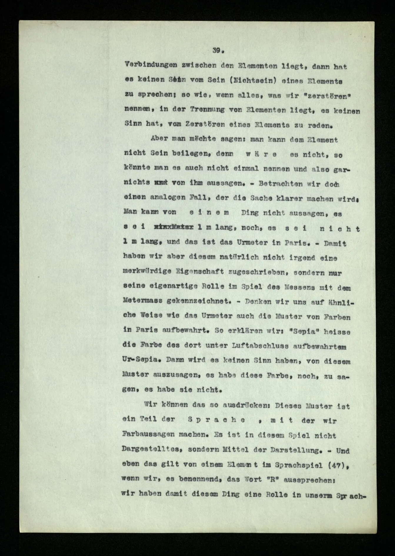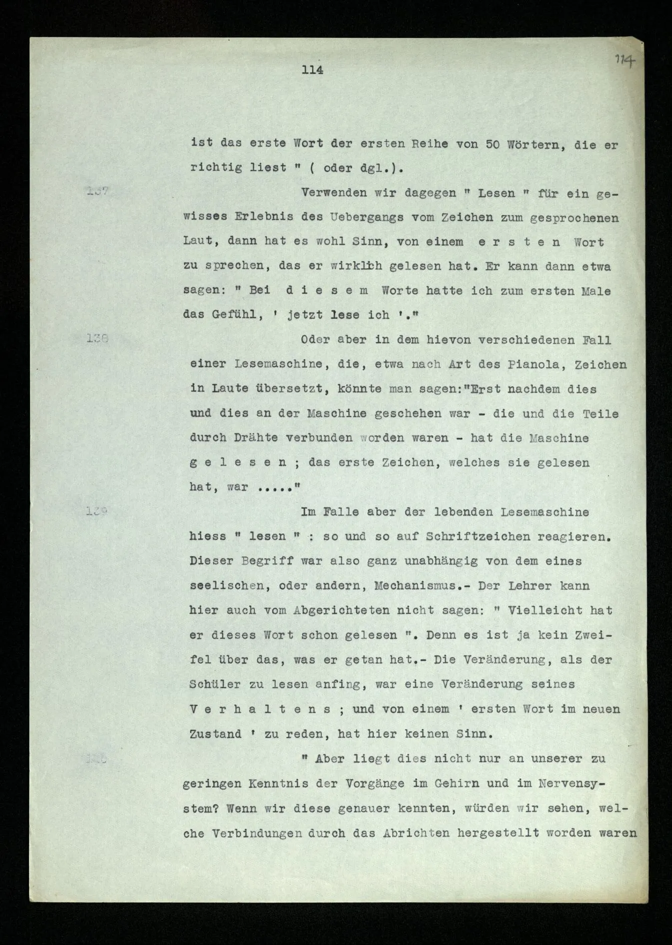 138 Oder aber in dem hievon verschiedenen Fall einer Lesemaschine, die, etwa nach Art des Pianola, Zeichen in Laute übersetzt, könnte man sagen: “Erst nachdem dies und dies an der Maschine geschehen war – die Teile durch Drähte verbunden worden waren – hat die Maschine gelesen; das erste Zeichen, welches sie gelesen hat, war ….”