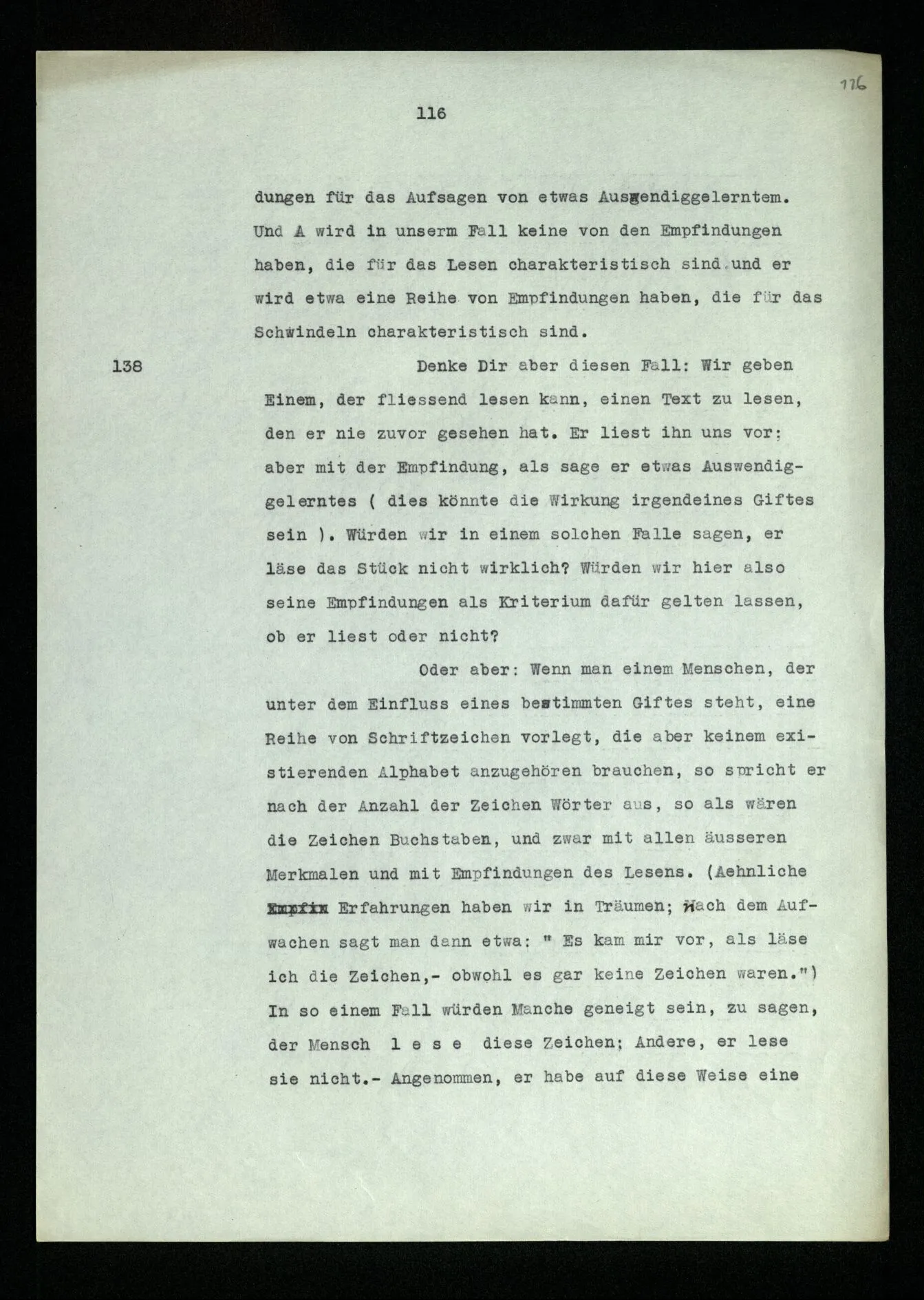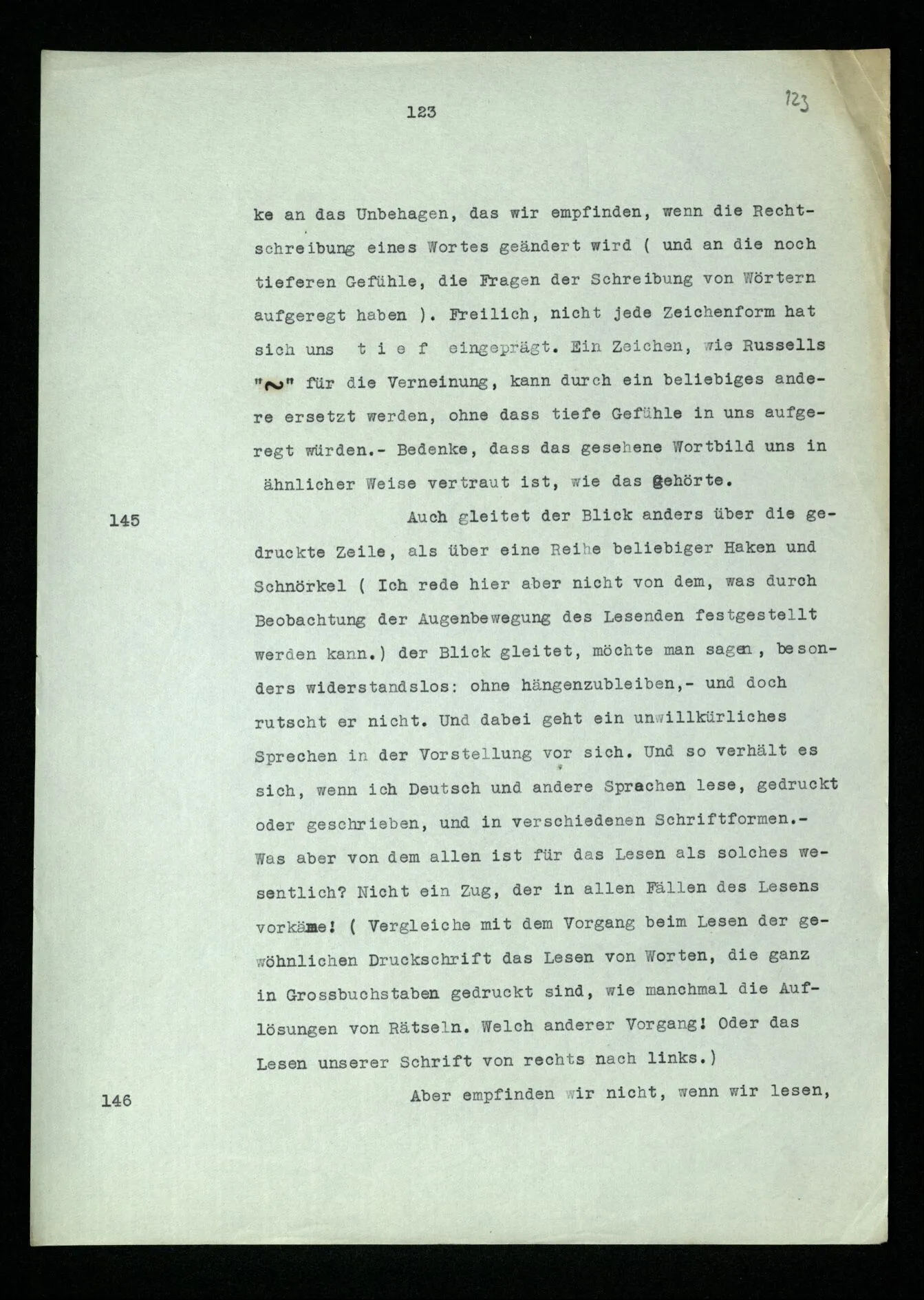 145 Auch gleitet der Blick anders über die gedruckte Zeile, als über eine Reihe beliebiger Haken und Schnörkel (Ich rede hier aber nicht von dem, was durch Beobachtung der Augenbewegung des Lesenden festgestellt werden kann.) der Blick gleitet, möchte man sagen, besonders widerstandslos: ohne hängenzubleiben, – und doch rutscht er nicht. Und dabei geht ein unwillkürliches Sprechen in der Vorstellung vor sich. Und so verhält es sich, wenn ich Deutsch und andere Sprachen lese, gedruckt oder geschrieben, und in verschiedenen Schriftformen. – Was aber von dem allen ist für das Lesen als solches wesentlich? Nicht ein Zug, der in allen Fällen des Lesens vorkäme! (Vergleiche mit dem Vorgang beim Lesen der gewöhnlichen Druckschrift das Lesen von Worten, die ganz in Großbuchstaben gedruckt sind, wie manchmal die Auflösungen von Rätseln. Welch anderer Vorgang! Oder das Lesen unserer Schrift von rechts nach links.)