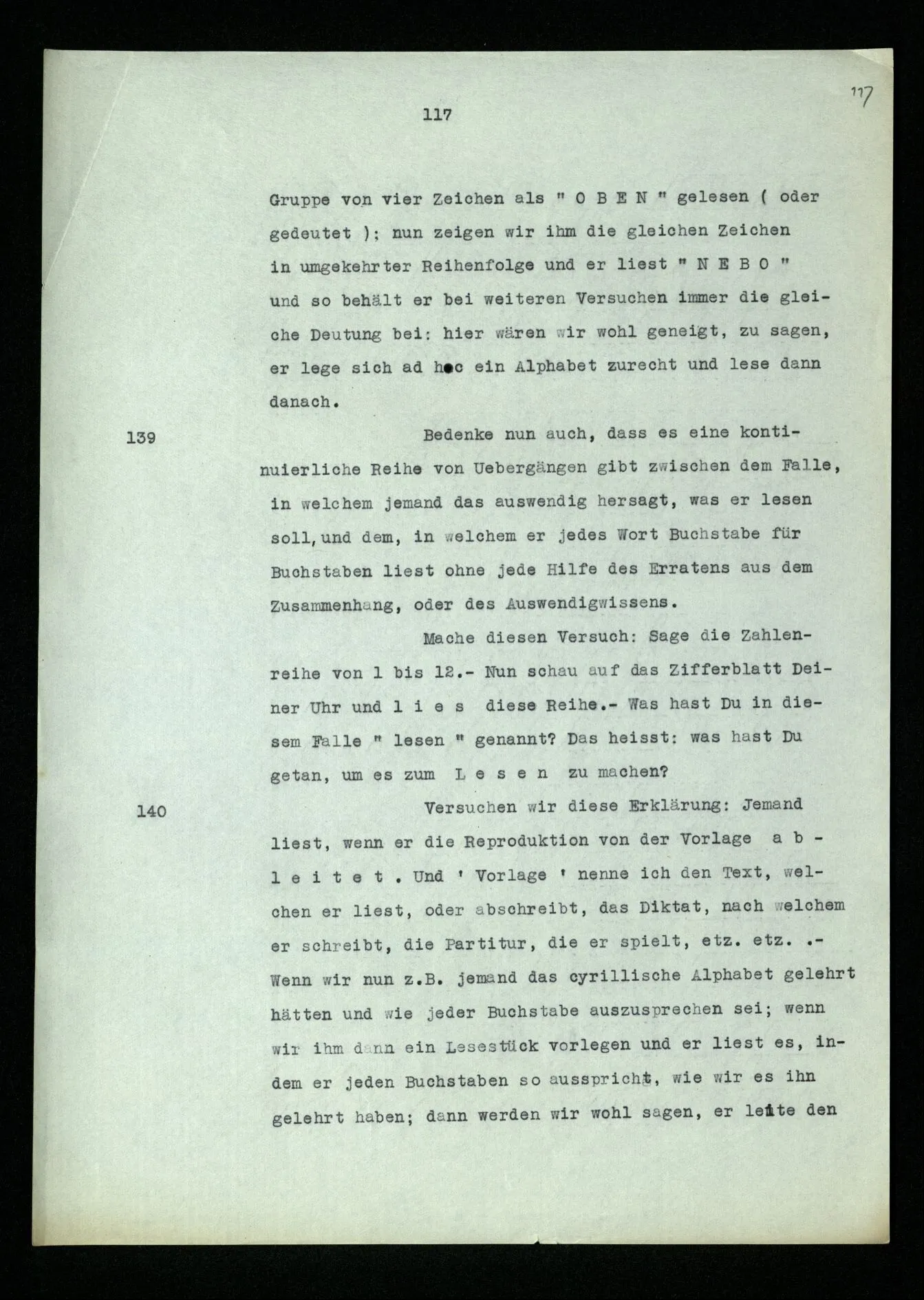 139 Bedenke nun auch, daß es eine kontinuierliche Reihe von Übergängen gibt zwischen dem Falle, in welchem jemand das auswendig hersagt, was er lesen soll, und dem, in welchem er jedes Wort Buchstabe für Buchstaben liest ohne jede Hilfe des Erratens aus dem Zusammenhang, oder des Auswendigwissens. Mache diesen Versuch: Sage die Zahlenreihe von 1 bis 12. – Nun schau auf das Zifferblatt Deiner Uhr und lies diese Reihe. – Was hast Du in diesem Falle “lesen” genannt? Das heißt: was hast Du getan, um es zum Lesen zu machen?