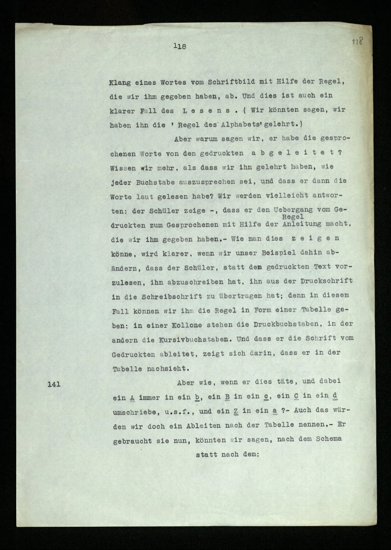 140 Versuchen wir diese Erklärung: Jemand liest, wenn er die Reproduktion von der Vorlage ableitet. Und ‘Vorlage’ nenne ich den Text, welchen er liest, oder abschreibt, das Diktat, nach welchem er schreibt, die Partitur, die er spielt, etc. etc. – Wenn wir nun z.B. jemand das kyrillische Alphabet gelehrt hätten und wie jeder Buchstabe auszusprechen sei; wenn wir ihm dann ein Lesestück vorlegen und er liest es, indem er jeden Buchstaben so ausspricht, wie wir es ihn gelehrt haben; dann werden wir wohl sagen, er leite den Klang eines Wortes vom Schriftbild mit Hilfe der Regel, die wir ihm gegeben haben, ab. Und dies ist auch ein klarer Fall des Lesens. (Wir könnten sagen, wir haben ihn die ‘Regel des Alphabets’ gelehrt.) Aber warum sagen wir, er habe die gesprochenen Worte von den gedruckten abgeleitet? Wissen wir mehr, als daß wir ihn gelehrt haben, wie jeder Buchstabe auszusprechen sei, und daß er dann die Worte laut gelesen habe? Wir werden vielleicht antworten: der Schüler zeige –, daß er den Übergang vom Gedruckten zum Gesprochenen mit Hilfe der Anleitung macht, die wir ihm gegeben haben. – Wie man dies zeigen könne, wird klarer, wenn wir unser Beispiel dahin abändern, daß der Schüler, statt den gedruckten Text vorzulesen, ihn abzuschreiben hat, ihn aus der Druckschrift in die Schreibschrift zu übertragen hat; denn in diesem Fall können wir ihm die Regel in Form einer Tabelle geben: in einer Kolonne stehen die Druckbuchstaben, in der andern die Kursivbuchstaben. Und daß er die Schrift vom Gedruckten ableitet, zeigt sich darin, daß er in der Tabelle nachsieht.