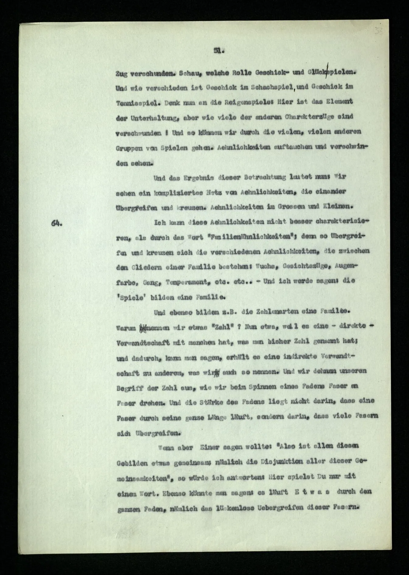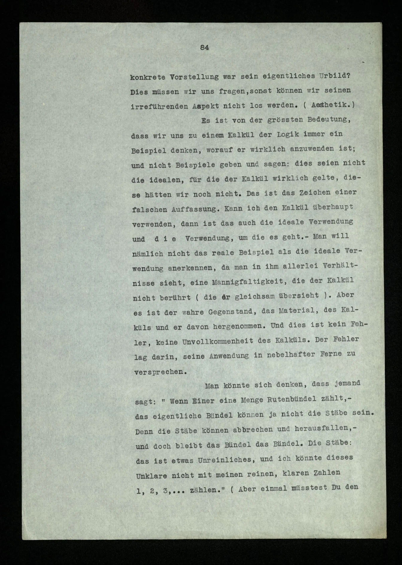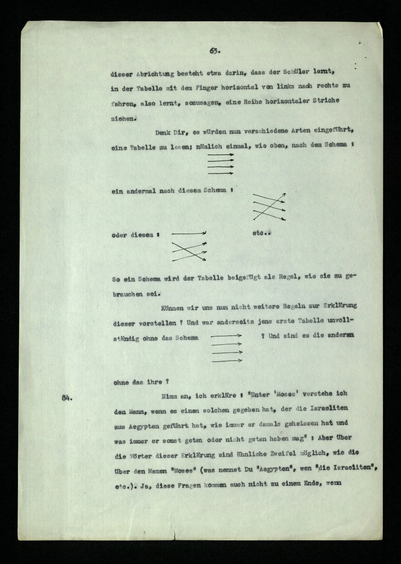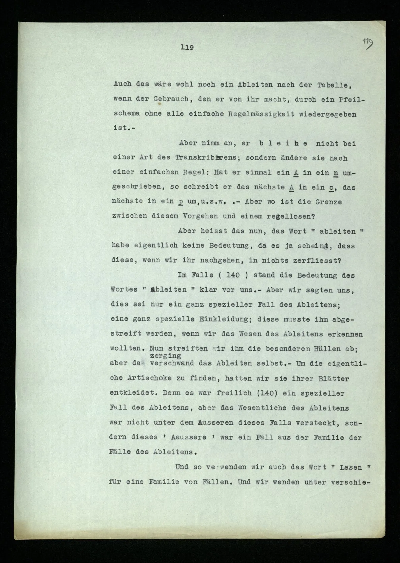 141 Aber wie, wenn er dies täte, und dabei ein A immer in ein b, ein B in ein c, ein C in ein d umschriebe, u.s.f., und ein z in ein a? – Auch das würden wir doch ein Ableiten nach der Tabelle nennen. – Er gebraucht sie nun, könnten wir sagen, nach dem Schema statt nach dem: Auch das wäre wohl noch ein Ableiten nach der Tabelle, wenn der Gebrauch, den er von ihr macht, durch ein Pfeilschema ohne alle einfache Regelmäßigkeit wiedergegeben ist. – Aber nimm an, er bleibe nicht bei einer Art des Transkribierens; sondern ändere sie nach einer einfachen Regel: Hat er einmal ein A in ein n umgeschrieben, so schreibt er das nächste A in ein o, das nächste in ein p um, u.s.w..– Aber wo ist die Grenze zwischen diesem Vorgehen und dem eines regellosen? Aber heißt das nun, das Wort “ableiten” habe eigentlich keine Bedeutung, da es ja scheint, daß diese, wenn wir ihr nachgehen, in nichts zerfließt? Im Falle (140) stand die Bedeutung des Wortes “ableiten” klar vor uns. – Aber wir sagten uns, dies sei nur ein ganz spezieller Fall des Ableitens; eine ganz spezielle Einkleidung; diese mußte ihm abgestreift werden, wenn wir das Wesen des Ableitens erkennen wollten. Nun streiften wir ihm die besonderen Hüllen ab; aber da verschwand das Ableiten selbst. – Um die eigentliche Artischocke zu finden, hatten wir sie ihrer Blätter entkleidet. Denn es war freilich (140) ein spezieller Fall des Ableitens, aber das Wesentliche des Ableitens war nicht unter dem Äußeren dieses Falls versteckt, sondern dieses Äußere war ein Fall aus der Familie der Fälle des Ableitens. Und so verwenden wir auch das Wort “Lesen” für eine Familie von Fällen. Und wir wenden unter verschiedenen Umständen verschiedene Kriterien an dafür, daß Einer liest.