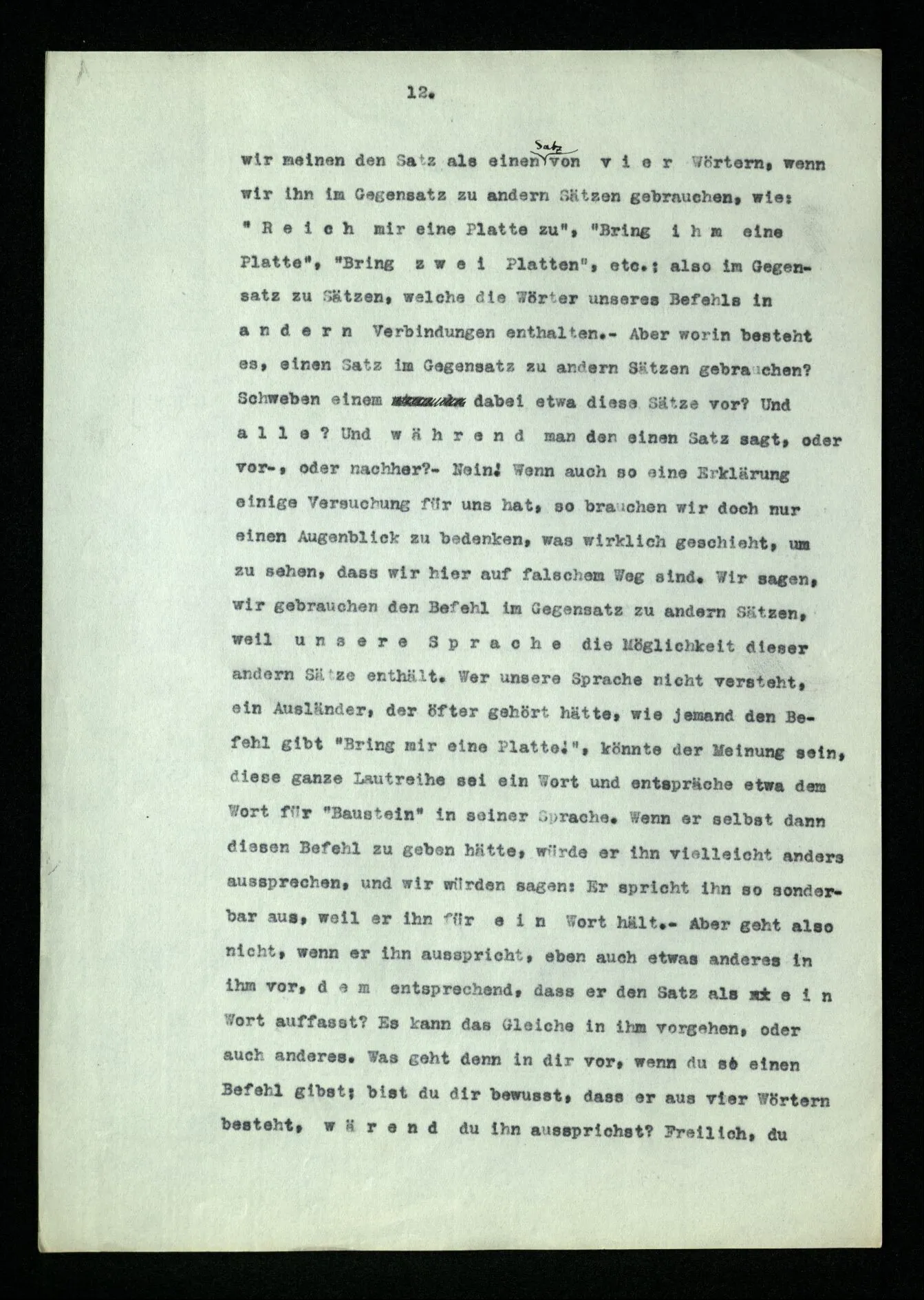 18. “Aber wenn nun Einer sagt “Bring mir eine Platte!”, so scheint es ja jetzt, als könnte er diesen Ausdruck als ein langes Wort meinen – – entsprechend nämlich dem einen Wort ‘Platte!’” – Kann man ihn also einmal als ein Wort, einmal als vier Wörter meinen? Und wie meint man ihn gewöhnlich? – Ich glaube, wir werden geneigt sein, zu sagen: wir meinen den Satz als einen Satz von vier Wörtern, wenn wir ihn im Gegensatz zu andern Sätzen gebrauchen, wie: “Reich mir eine Platte zu”, “Bring ihm eine Platte”, “Bring zwei Platten”, etc.; also im Gegensatz zu Sätzen, welche die Wörter unseres Befehls in andern Verbindungen enthalten. – Aber worin besteht es, einen Satz im Gegensatz zu andern Sätzen gebrauchen? Schweben einem dabei etwa diese Sätze vor? Und alle? Und während man den einen Satz sagt, oder vor –, oder nachher? – Nein! Wenn auch so eine Erklärung einige Versuchung für uns hat, so brauchen wir doch nur einen Augenblick zu bedenken, was wirklich geschieht, um zu sehen, daß wir hier auf falschem Weg sind. Wir sagen, wir gebrauchen den Befehl im Gegensatz zu andern Sätzen, weil unsere Sprache die Möglichkeit dieser andern Sätze enthält. Wer unsere Sprache nicht versteht, ein Ausländer, der öfter gehört hätte, wie jemand den Befehl gibt “Bring mir eine Platte!”, könnte der Meinung sein, diese ganze Lautreihe sei ein Wort und entspräche etwa dem Wort für “Baustein” in seiner Sprache. Wenn er selbst dann diesen Befehl zu geben hätte, würde er ihn vielleicht anders aussprechen, und wir würden sagen: Er spricht ihn so sonderbar aus, weil er ihn für ein Wort hält. – Aber geht also nicht, wenn er ihn ausspricht, eben auch etwas anderes in ihm vor, dem entsprechend, daß er den Satz als ein Wort auffaßt? Es kann das Gleiche in ihm vorgehen, oder auch anderes. Was geht denn in dir vor, wenn Du so einen Befehl gibst; bist Du dir bewußt, daß er aus vier Wörtern besteht, während du ihn aussprichst? Freilich, du beherrscht diese Sprache – in der es auch jene andern Sätze gibt – aber ist dieses Beherrschen etwas, was geschieht, während du den einen Satz ausspricht? – Und ich habe ja zugegeben: der Fremde wird den Satz, den er anders auffaßt, wahrscheinlich anders aussprechen; aber was wir die falsche Auffassung nennen muß nicht in irgend etwas liegen, was das Aussprechen des Befehls begleitet. (Davon später mehr.)