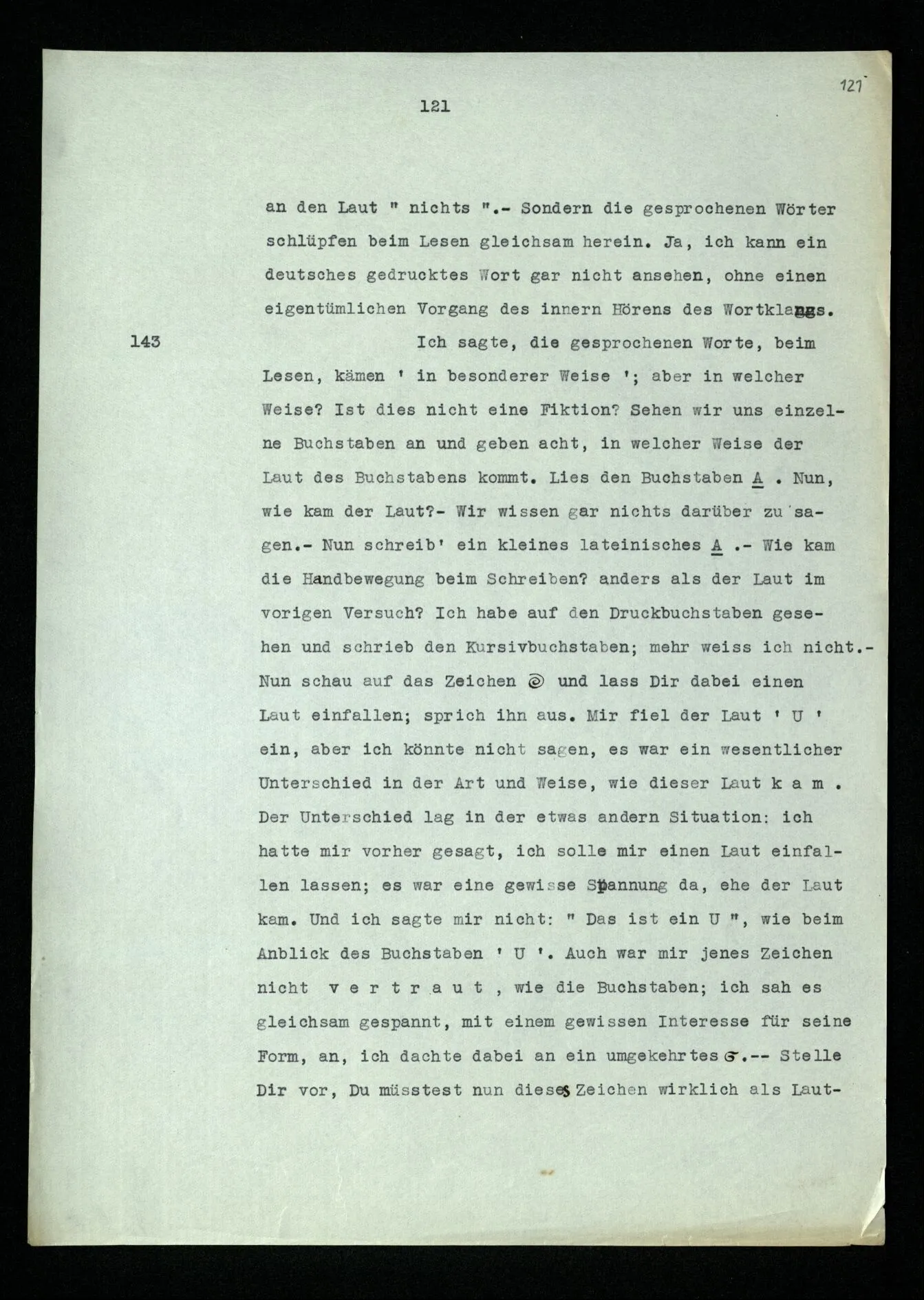 143 Ich sagte, die gesprochenen Worte, beim Lesen, kämen ‘in besonderer Weise’; aber in welcher Weise? Ist dies nicht eine Fiktion? Sehen wir uns einzelne Buchstaben an und geben acht, in welcher Weise der Laut des Buchstabens kommt. Lies den Buchstaben A. Nun, wie kam der Laut? – Wir wissen gar nichts darüber zu sagen. – Nun schreib’ ein kleines lateinisches A. – Wie kam die Handbewegung beim Schreiben? anders als der Laut im vorigen Versuch? Ich habe auf den Druckbuchstaben gesehen und schrieb den Kursivbuchstaben; mehr weiß ich nicht. – Nun schau auf das Zeichen
