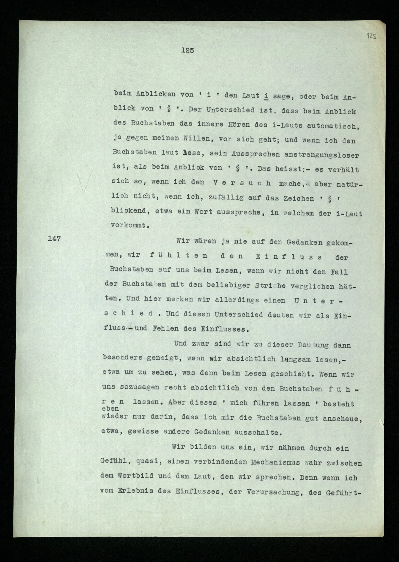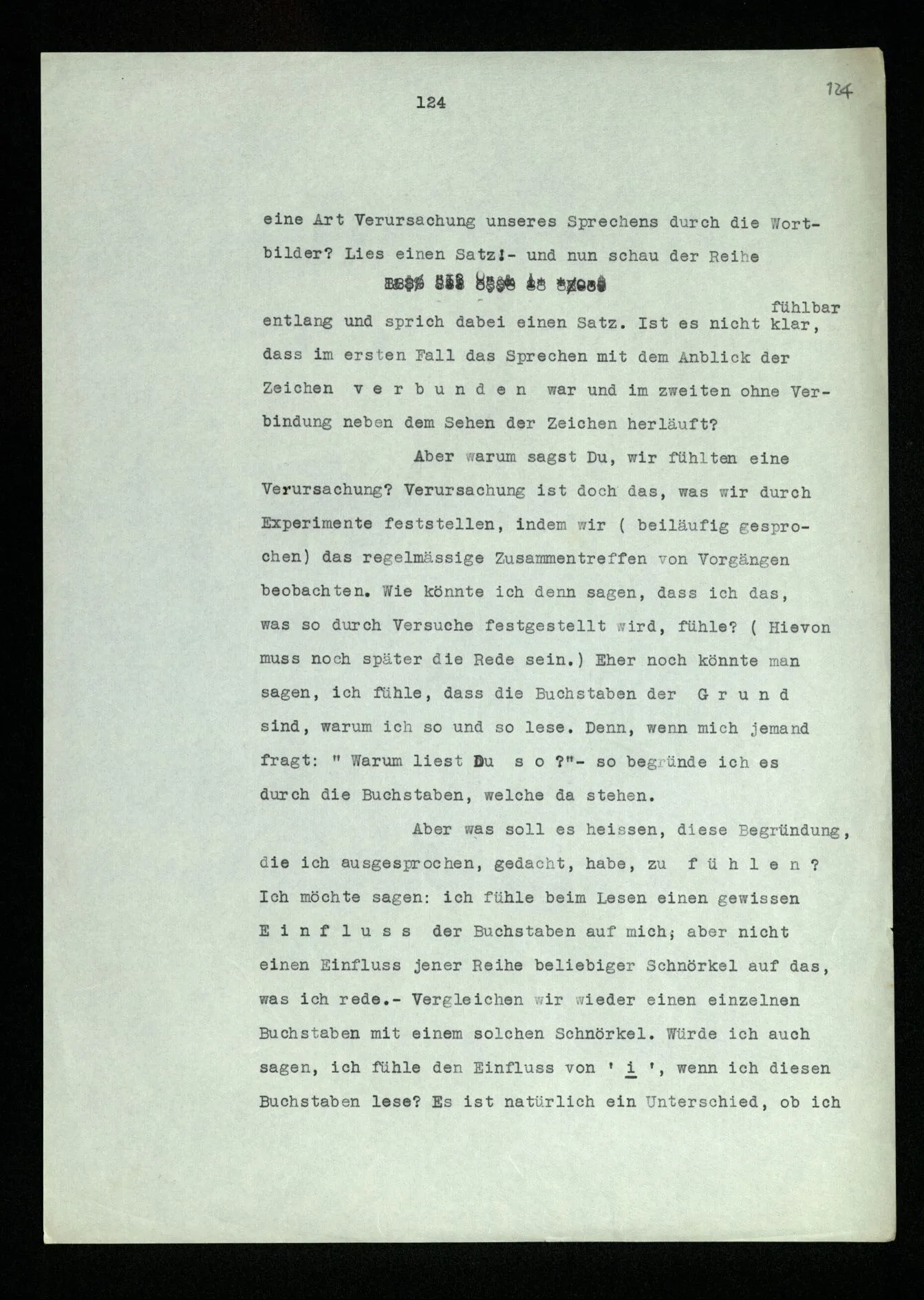 entlang und sprich dabei einen Satz. Ist es nicht klar, daß im ersten Fall das Sprechen mit dem Anblick der Zeichen verbunden war und im zweiten ohne Verbindung neben dem Sehen der Zeichen herläuft? Aber warum sagst Du, wir fühlten eine Verursachung? Verursachung ist doch das, was wir durch Experimente feststellen, indem wir (beiläufig gesprochen) das regelmäßige Zusammentreffen von Vorgängen beobachten. Wie könnte ich denn sagen, daß ich das, was so durch Versuche festgestellt wird, fühle? (Hievon muß noch später die Rede sein.) Eher noch könnte man sagen, ich fühle, daß die Buchstaben der Grund sind, warum ich so und so lese. Denn, wenn mich jemand fragt: “Warum liest Du so? – so begründe ich es durch die Buchstaben, welche da stehen. Aber was soll es heißen, diese Begründung, die ich ausgesprochen, gedacht, habe, zu fühlen? Ich möchte sagen: ich fühle beim Lesen einen gewissen Einfluß der Buchstaben auf mich; aber nicht einen Einfluß jener Reihe beliebiger Schnörkel auf das, was ich rede. – Vergleichen wir wieder einen einzelnen Buchstaben mit einem solchen Schnörkel. Würde ich auch sagen, ich fühle den Einfluß von i, wenn ich diesen Buchstaben lese? Es ist natürlich ein Unterschied, ob ich beim Anblicken von ‘i’ den Laut i sage, oder beim Anblick von ‘§’. Der Unterschied ist, daß beim Anblick des Buchstaben das innere Hören des i-Lauts automatisch, ja gegen meinen Willen, vor sich geht; und wenn ich den Buchstaben laut lese, sein Aussprechen anstrengungsloser ist, als beim Anblick von ‘§’. Das heißt: – es verhält sich so, wenn ich den Versuch mache, aber natürlich nicht, wenn ich, zufällig auf das Zeichen ‘§’ blickend, etwa ein Wort ausspreche, in welchem der i-Laut vorkommt.