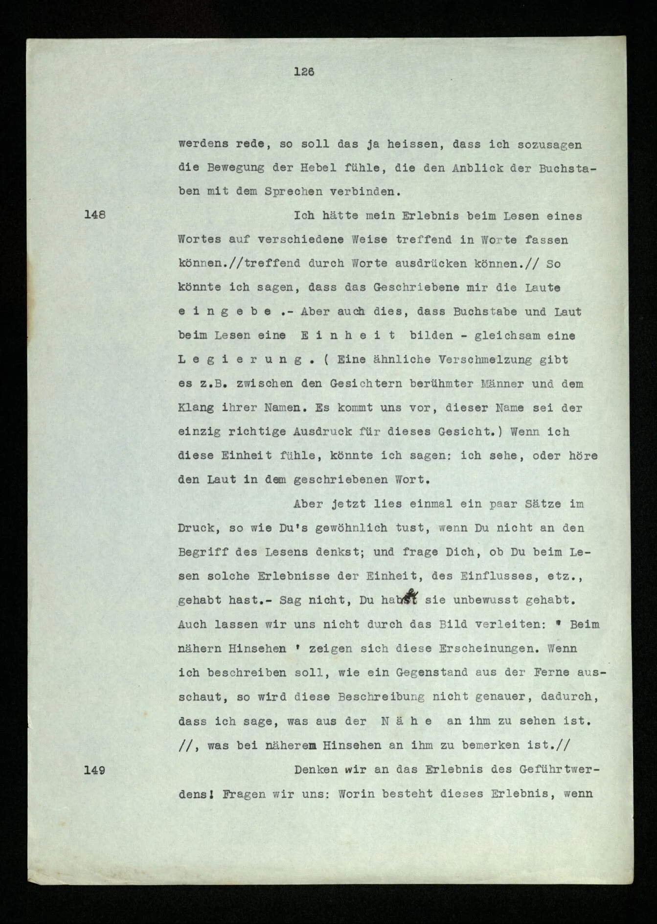 148 Ich hätte mein Erlebnis beim Lesen eines Wortes auf verschiedene Weise treffend in Worte fassen können. So könnte ich sagen, daß das Geschriebene mir die Laute eingebe. – Aber auch dies, daß Buchstabe und Laut beim Lesen eine Einheit bilden – gleichsam eine Legierung. (Eine ähnliche Verschmelzung gibt es z.B. zwischen den Gesichtern berühmter Männer und dem Klang ihrer Namen. Es kommt uns vor, dieser Name sei der einzig richtige Ausdruck für dieses Gesicht.) Wenn ich diese Einheit fühle, könnte ich sagen: ich sehe, oder höre den Laut in dem geschriebenen Wort. Aber jetzt lies einmal ein paar Sätze im Druck, so wie Du’s gewöhnlich tust, wenn Du nicht an den Begriff des Lesens denkst; und frage Dich, ob Du beim Lesen solche Erlebnisse der Einheit, des Einflusses, etc., gehabt hast. – Sag nicht, Du habest sie unbewußt gehabt. Auch lassen wir uns nicht durch das Bild verleiten: ‘Beim nähern Hinsehen’ zeigen sich diese Erscheinungen. Wenn ich beschreiben soll, wie ein Gegenstand aus der Ferne ausschaut, so wird diese Beschreibung nicht genauer, dadurch, daß ich sage, was aus der Nähe an ihm zu sehen ist.
