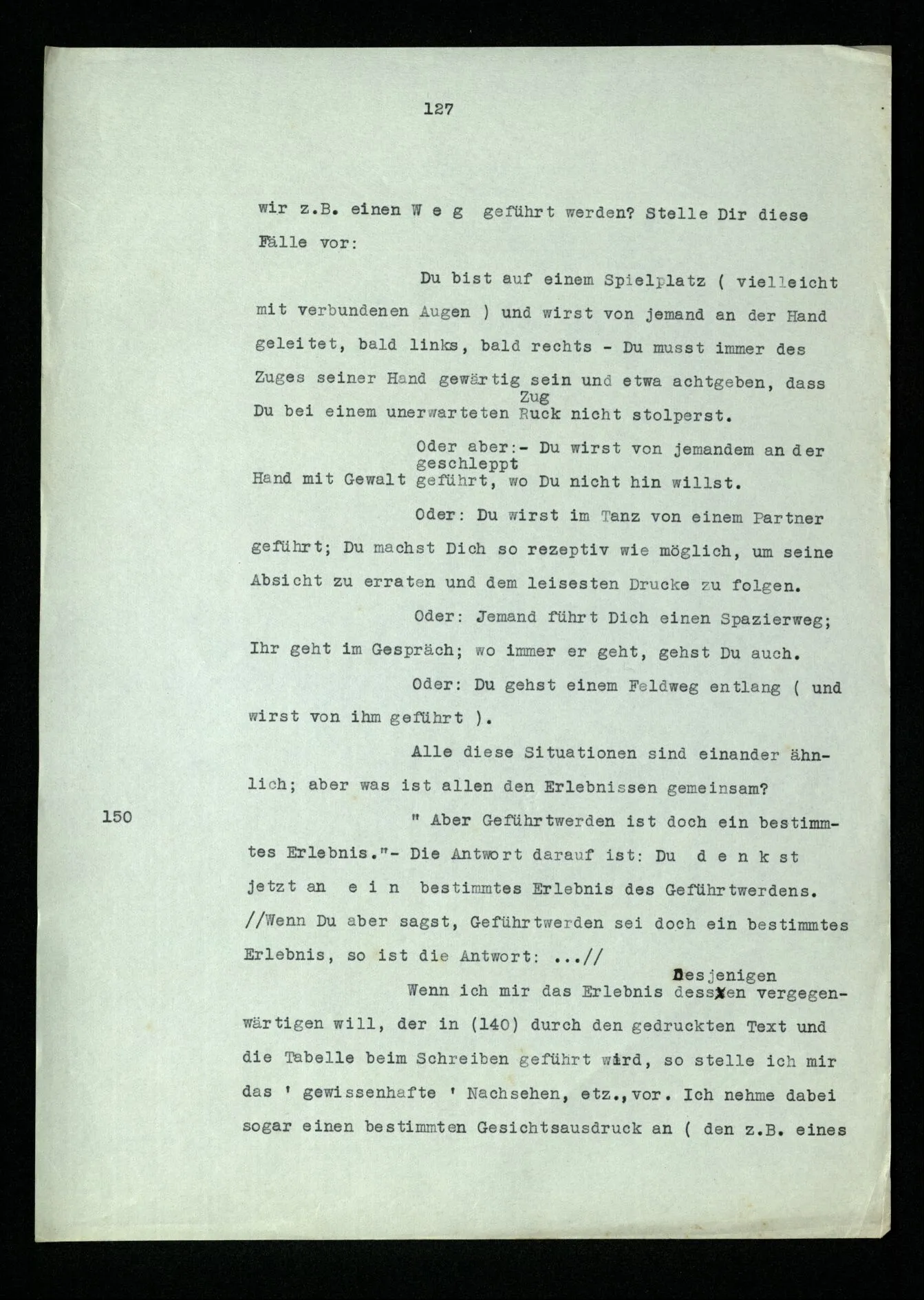 Du bist auf einem Spielplatz (vielleicht mit verbundenen Augen) und wirst von jemand an der Hand geleitet, bald links, bald rechts – Du mußt immer des Zuges seiner Hand gewärtig sein und etwa achtgeben, daß Du bei einem unerwarteten Ruck nicht stolperst. Oder aber: – Du wirst von jemandem an der Hand mit Gewalt geführt, wo Du nicht hin willst. Oder: Du wirst im Tanz von einem Partner geführt; Du machst Dich so rezeptiv wie möglich, um seine Absicht zu erraten und dem leisesten Drucke zu folgen. Oder: Jemand führt Dich einen Spazierweg; ihr geht im Gespräch; wo immer er geht, gehst Du auch. Oder: Du gehst einem Feldweg entlang (und wirst von ihm geführt). Alle diese Situationen sind einander ähnlich; aber was ist allen den Erlebnissen gemeinsam?