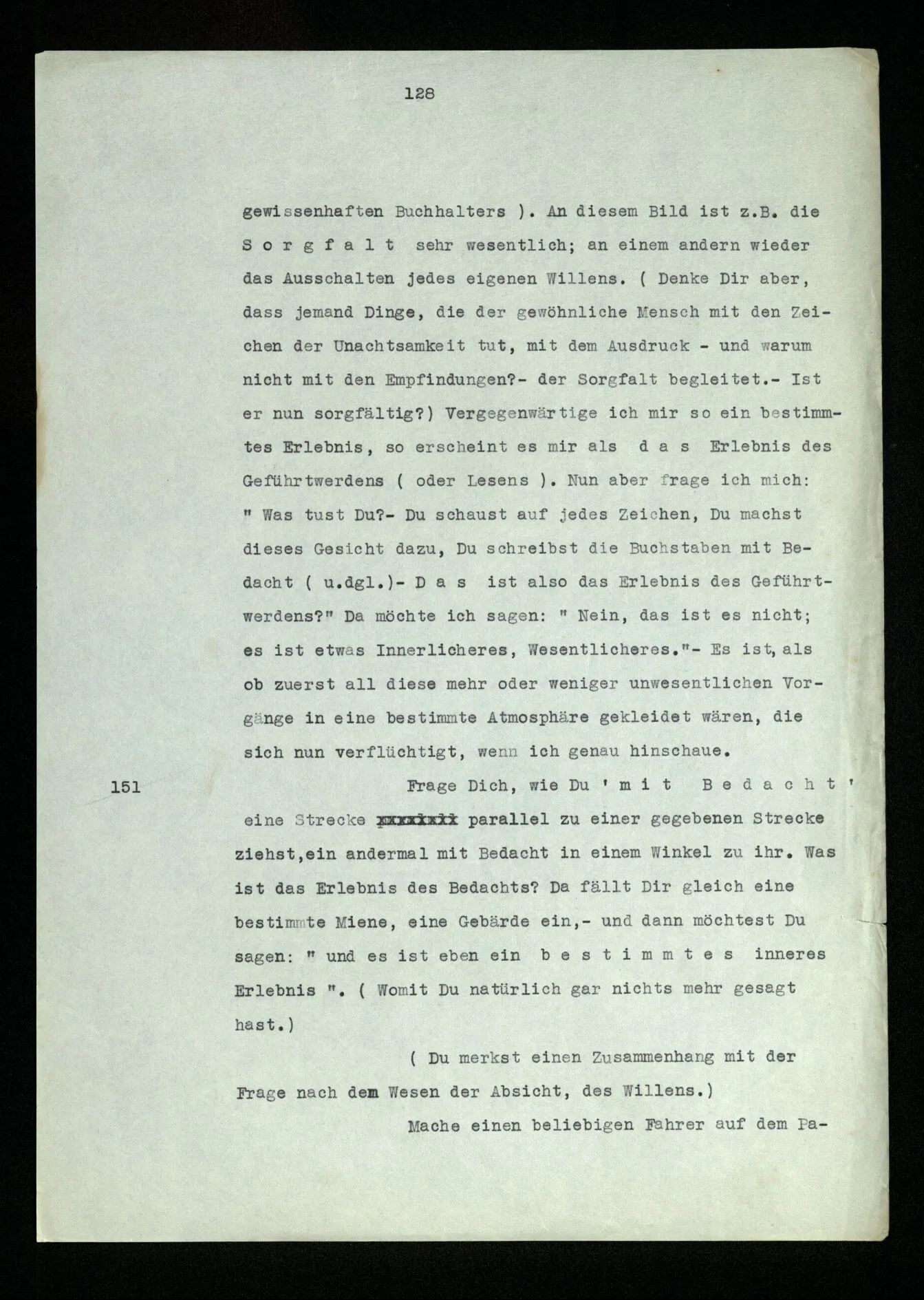 150 “Aber Geführtwerden ist doch ein bestimmtes Erlebnis.” – Die Antwort darauf ist: Du denkst jetzt an ein bestimmtes Erlebnis des Geführtwerdens. Wenn ich mir das Erlebnis dessen vergegenwärtigen will, der in (140) durch den gedruckten Text und die Tabelle beim Schreiben geführt wird, so stelle ich mir das ‘gewissenhafte’ Nachsehen, etc., vor. Ich nehme dabei sogar einen bestimmten Gesichtsausdruck an (den z.B. eines gewissenhaften Buchhalters). An diesem Bild ist z.B. die Sorgfalt sehr wesentlich; an einem andern wieder das Ausschalten jedes eigenen Willens. (Denke Dir aber, daß jemand Dinge, die der gewöhnliche Mensch mit den Zeichen der Unachtsamkeit tut, mit dem Ausdruck – und warum nicht mit den Empfindungen? – der Sorgfalt begleitet. – Ist er nun sorgfältig?) Vergegenwärtige ich mir so ein bestimmtes Erlebnis, so erscheint es mir als das Erlebnis des Geführtwerdens (oder Lesens). Nun aber frage ich mich: “Was tust Du? – Du schaust auf jedes Zeichen, Du machst dieses Gesicht dazu, Du schreibst die Buchstaben mit Bedacht (u.dgl.) – Das ist also das Erlebnis des Geführtwerdens?” Da möchte ich sagen. “Nein, das ist es nicht; es ist etwas Innerlicheres, Wesentlicheres.” – Es ist, als ob zuerst all diese mehr oder weniger unwesentlichen Vorgänge in eine bestimmte Atmosphäre gekleidet wären, die sich nun verflüchtigt, wenn ich genau hinschaue.