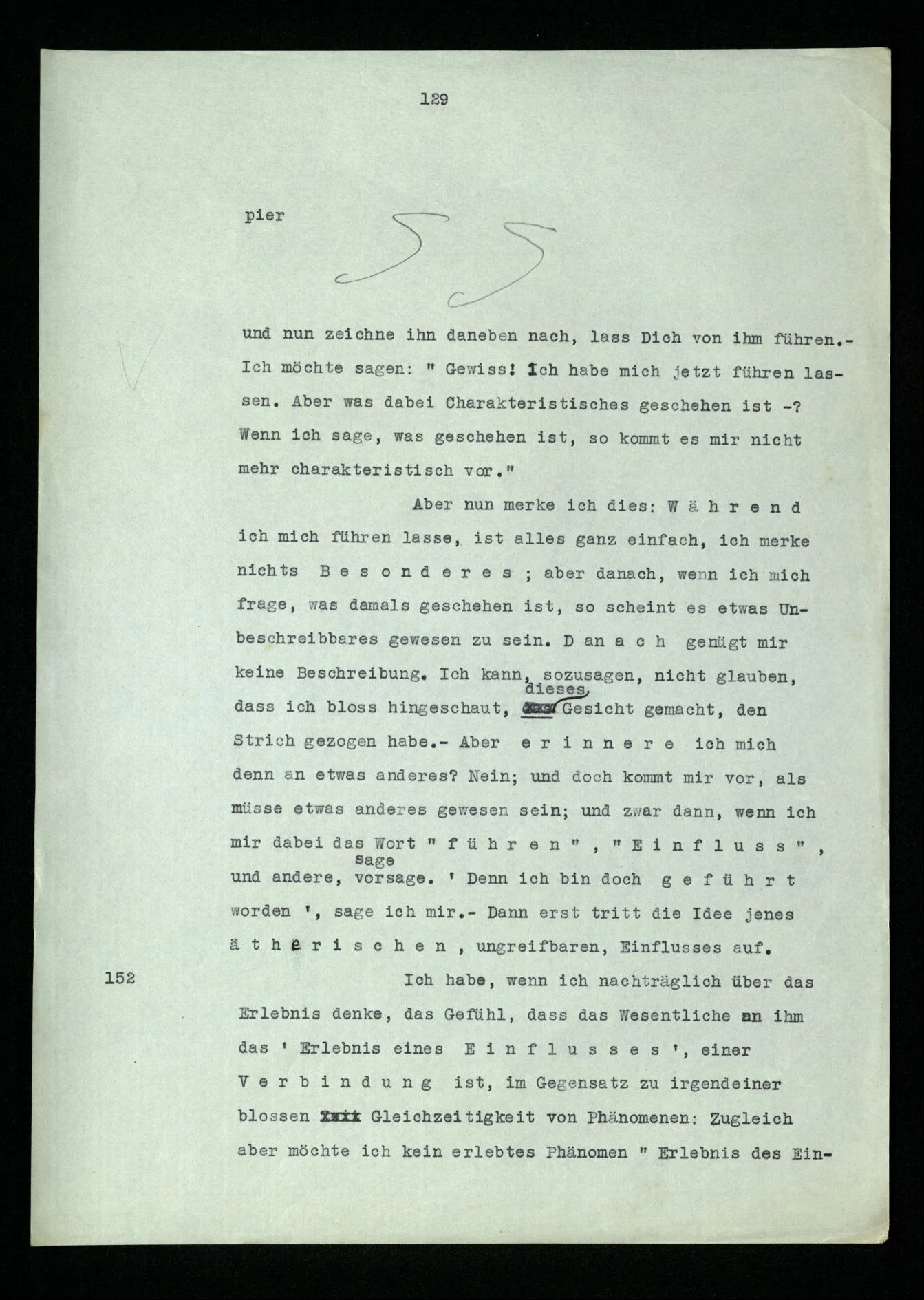 und nun zeichne ihn daneben nach, laß Dich von ihm führen. – Ich möchte sagen: “Gewiß! ich habe mich jetzt führen lassen. Aber was dabei Charakteristisches geschehen ist –? Wenn ich sage, was geschehen ist, so kommt es mir nicht mehr charakteristisch vor.” Aber nun merke ich dies: Während ich mich führen lasse, ist alles ganz einfach, ich merke nichts Besonderes; aber danach, wenn ich mich frage, was damals geschehen ist, so scheint es etwas Unbeschreibbares gewesen zu sein. Danach genügt mir keine Beschreibung. Ich kann, sozusagen, nicht glauben, daß ich bloß hingeschaut, dieses Gesicht gemacht, den Strich gezogen habe. – Aber erinnere ich mich denn an etwas anderes? Nein; und doch kommt mir vor, als müsse etwas anderes gewesen sein; und zwar dann, wenn ich mir dabei das Wort “führen”, “Einfluß”, und andere, vorsage. ‘Denn ich bin doch geführt worden, sage ich mir. – Dann erst tritt die Idee jenes ätherischen, ungreifbaren, Einflusses auf.