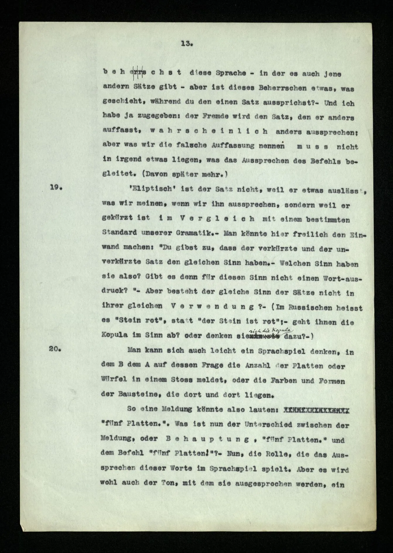 19. ‘Elliptisch’ ist der Satz nicht, weil er etwas ausläßt, was wir meinen, wenn wir ihn aussprechen, sondern weil er gekürzt ist im Vergleich mit einem bestimmten Standard unserer Grammatik. – Man könnte hier freilich den Einwand machen: “Du gibst zu, daß der verkürzte und der unverkürzte Satz den gleichen Sinn haben. – Welchen Sinn haben sie also? Gibt es denn für diesen Sinn nicht einen Wortausdruck?” – Aber besteht der gleiche Sinn der Sätze nicht in ihrer gleichen Verwendung? – (Im Russischen heißt es “Stein rot”, statt “der Stein ist rot”; – geht ihnen die Kopula im Sinn ab? oder denken sie sich die Kopula dazu? –)