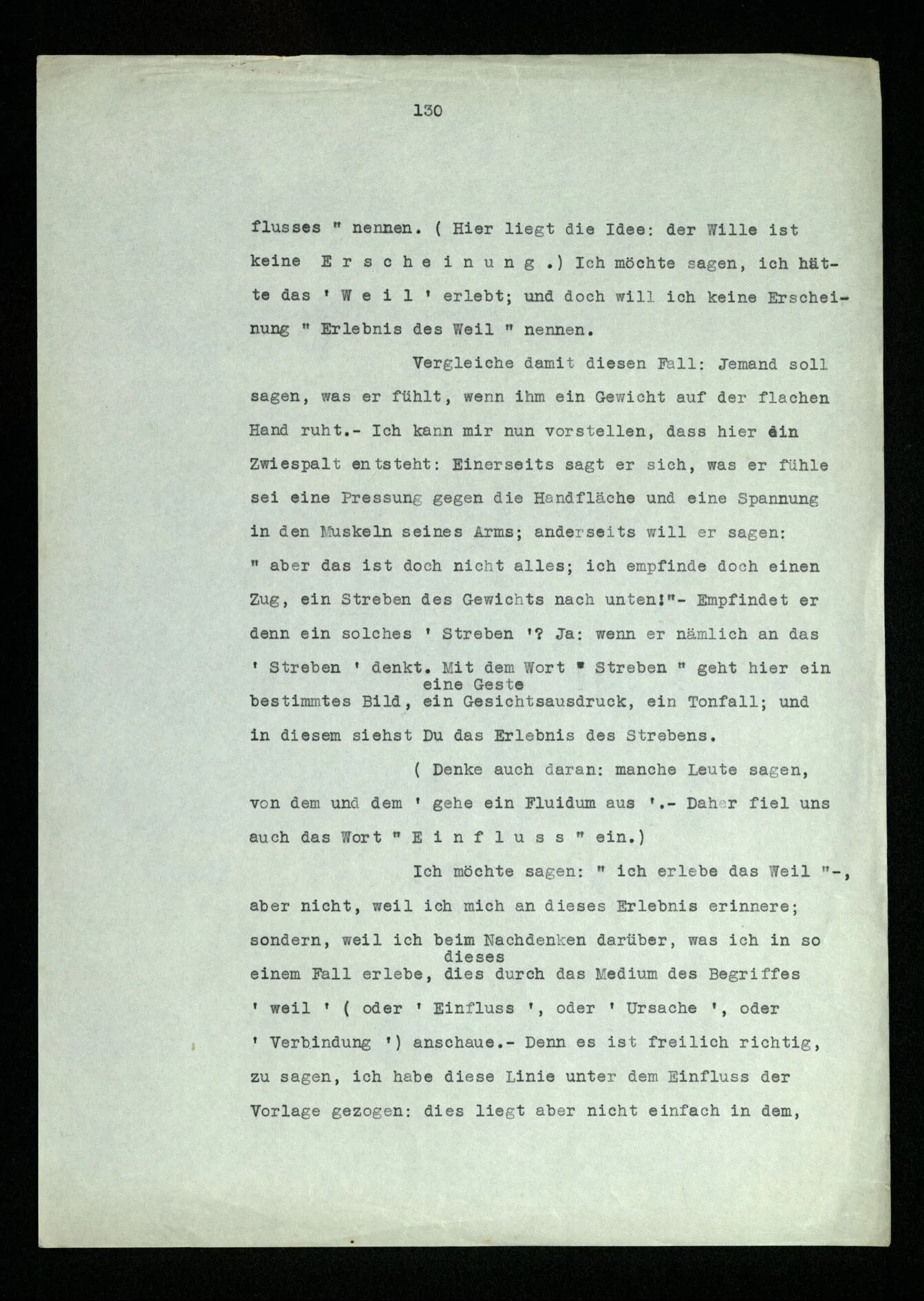 152 Ich habe, wenn ich nachträglich über das Erlebnis denke, das Gefühl, daß das Wesentliche an ihm das ‘Erlebnis eines Einflusses’, einer Verbindung ist, im Gegensatz zu irgendeiner bloßen Gleichzeitigkeit von Phänomenen: Zugleich aber möchte ich kein erlebtes Phänomen “Erlebnis des Einflusses” nennen. Hier liegt die Idee: der Wille ist keine Erscheinung.) Ich möchte sagen, ich hätte das ‘Weil’ erlebt; und doch will ich keine Erscheinung ‘Erlebnis des Weil” nennen. Vergleiche damit diesen Fall: Jemand soll sagen, was er fühlt, wenn ihm ein Gewicht auf der flachen Hand ruht. – Ich kann mir nun vorstellen, daß hier ein Zwiespalt entsteht: Einerseits sagt er sich, was er fühle sei eine Pressung gegen die Handfläche und eine Spannung in den Muskeln seines Arms; anderseits will er sagen: “aber das ist doch nicht alles; ich empfinde doch einen Zug, ein Streben des Gewichts nach unten!” – Empfindet er denn ein solches Streben? Ja: wenn er nämlich an das Streben denkt. Mit dem Wort “Streben” geht hier ein bestimmtes Bild, ein Gesichtsausdruck, ein Tonfall; und in diesem siehst Du das Erlebnis des Strebens. (Denke auch daran: manche Leute sagen, von dem und dem ‘gehe ein Fluidum aus’. – Daher fiel uns auch das Wort “Einfluß” ein.) Ich möchte sagen: “ich erlebe das Weil” –, aber nicht, weil ich mich an dieses Erlebnis erinnere; sondern, weil ich beim Nachdenken darüber, was ich in so einem Fall erlebe, dies durch das Medium des Begriffes ‘weil’ (oder ‘Einfluß’, oder ‘Ursache’, oder ‘Verbindung’) anschaue. – Denn es ist freilich richtig, zu sagen, ich habe diese Linie unter dem Einfluß der Vorlage gezogen: dies liegt aber nicht einfach in dem, was ich beim Ziehen der Linie empfinde – sondern unter Umständen auch (z.B.) darin, daß ich sie der andern parallel ziehe – obwohl auch das wieder für das Geführtwerden nicht allgemein wesentlich ist. –
