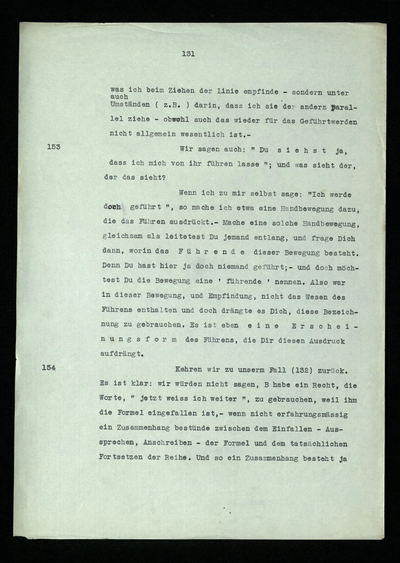 155 Wir sagen auch: “Du siehst ja, daß ich mich von ihr führen lasse”; und was sieht der, der das sieht? Wenn ich zu mir selbst sage: “Ich werde doch geführt”, so mache ich etwa eine Handbewegung dazu, die das Führen ausdrückt. – Mache eine solche Handbewegung, gleichsam als leitetest Du jemand entlang, und frage Dich dann, worin das Führende dieser Bewegung besteht. Denn Du hast hier ja doch niemand geführt; – und doch möchtest Du die Bewegung eine führende nennen. Also war in dieser Bewegung, und Empfindung, nicht das Wesen des Führens enthalten und doch drängte es Dich, diese Bezeichnung zu gebrauchen. Es ist eben eine Erscheinungsform des Führens, die Dir diesen Ausdruck aufdrängt.