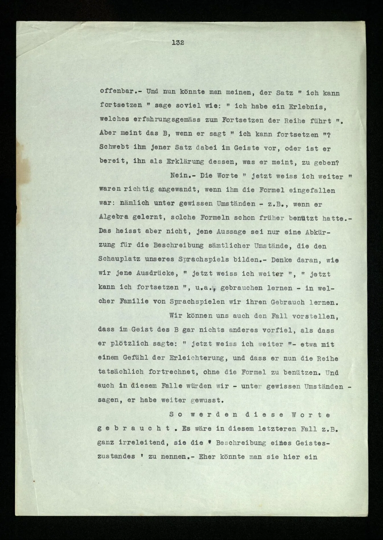 158 Kehren wir zu unserm Fall (132) zurück. Es ist klar: wir würden nicht sagen, B habe ein Recht, die Worte, “jetzt weiß ich weiter”, zu gebrauchen, weil ihm die Formel eingefallen ist, – wenn nicht erfahrungsmäßig ein Zusammenhang bestünde zwischen dem Einfallen – Aussprechen, Anschreiben – der Formel und dem tatsächlichen Fortsetzen der Reihe. Und so ein Zusammenhang besteht ja offenbar. – Und nun könnte man meinen, der Satz “ich kann fortsetzen” sage soviel wie: “ich habe ein Erlebnis, welches erfahrungsgemäß zum Fortsetzen der Reihe führt”. Aber meint das B, wenn er sagt “ich kann fortsetzen”? Schwebt ihm jener Satz dabei im Geiste vor, oder ist er bereit, ihn als Erklärung dessen, was er meint, zu geben? Nein. – Die Worte “jetzt weiß ich weiter” waren richtig angewandt, wenn ihm die Formel eingefallen war: nämlich unter gewissen Umständen – z.B., wenn er Algebra gelernt, solche Formeln schon früher benutzt hatte. – Das heißt aber nicht, jene Aussage sei nur eine Abkürzung für die Beschreibung sämtlicher Umstände, die den Schauplatz unseres Sprachspiels bilden. – Denke daran, wie wir jene Ausdrücke, “jetzt weiß ich weiter”, “jetzt kann ich fortsetzen”, u.a., gebrauchen lernen – in welcher Familie von Sprachspielen wir ihren Gebrauch lernen. Wir können uns auch den Fall vorstellen, daß im Geist des B gar nichts anderes vorfiel, als daß er plötzlich sagte: “jetzt weiß ich weiter” – etwa mit einem Gefühl der Erleichterung, und daß er nun die Reihe tatsächlich fortrechnet, ohne die Formel zu benützen. Und auch in diesem Falle würden wir – unter gewissen Umständen – sagen, er habe weiter gewußt. So werden diese Worte gebraucht. Es wäre in diesem letzteren Fall z.B. ganz irreleitend, sie die Beschreibung eines Geisteszustandes zu nennen. – Eher könnte man sie hier ein ‘Signal’ nennen; und ob es richtig angewendet war, beurteilen wir nach dem, was er weiter tut.