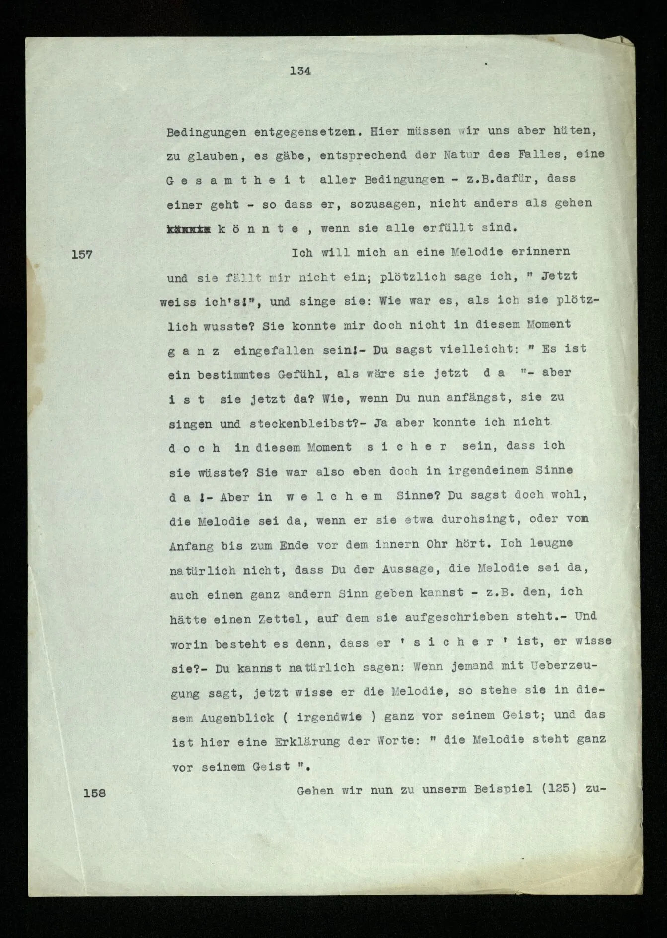 157 Ich will mich an eine Melodie erinnern und sie fällt mir nicht ein; plötzlich sage ich, “Jetzt weiß ich’s!”, und singe sie: Wie war es, als ich sie plötzlich wußte? Sie konnte mir doch nicht in diesem Moment ganz eingefallen sein! – Du sagst vielleicht: “Es ist ein bestimmtes Gefühl, als wäre sie jetzt da” – aber ist sie jetzt da? Wie, wenn Du nun anfängst, sie zu singen und steckenbleibst? – Ja aber konnte ich nicht doch in diesem Moment sicher sein, daß ich sie wüßte? Sie war also eben doch in irgendeinem Sinne da! – Aber in welchem Sinne? Du sagst doch wohl, die Melodie sei da, wenn er sie etwa durchsingt, oder von Anfang bis zum Ende vor dem innern Ohr hört. Ich leugne natürlich nicht, daß Du der Aussage, die Melodie sei da, auch einen ganz andern Sinn geben kannst – z.B. den, ich hätte einen Zettel, auf dem sie aufgeschrieben steht. – Und worin besteht es denn, daß er sicher ist, er wisse sie? – Du kannst natürlich sagen: Wenn jemand mit Überzeugung sagt, jetzt wisse er die Melodie, so stehe sie in diesem Augenblick (irgendwie) ganz vor seinem Geist; und das ist hier eine Erklärung der Worte: “die Melodie steht ganz vor seinem Geist”.