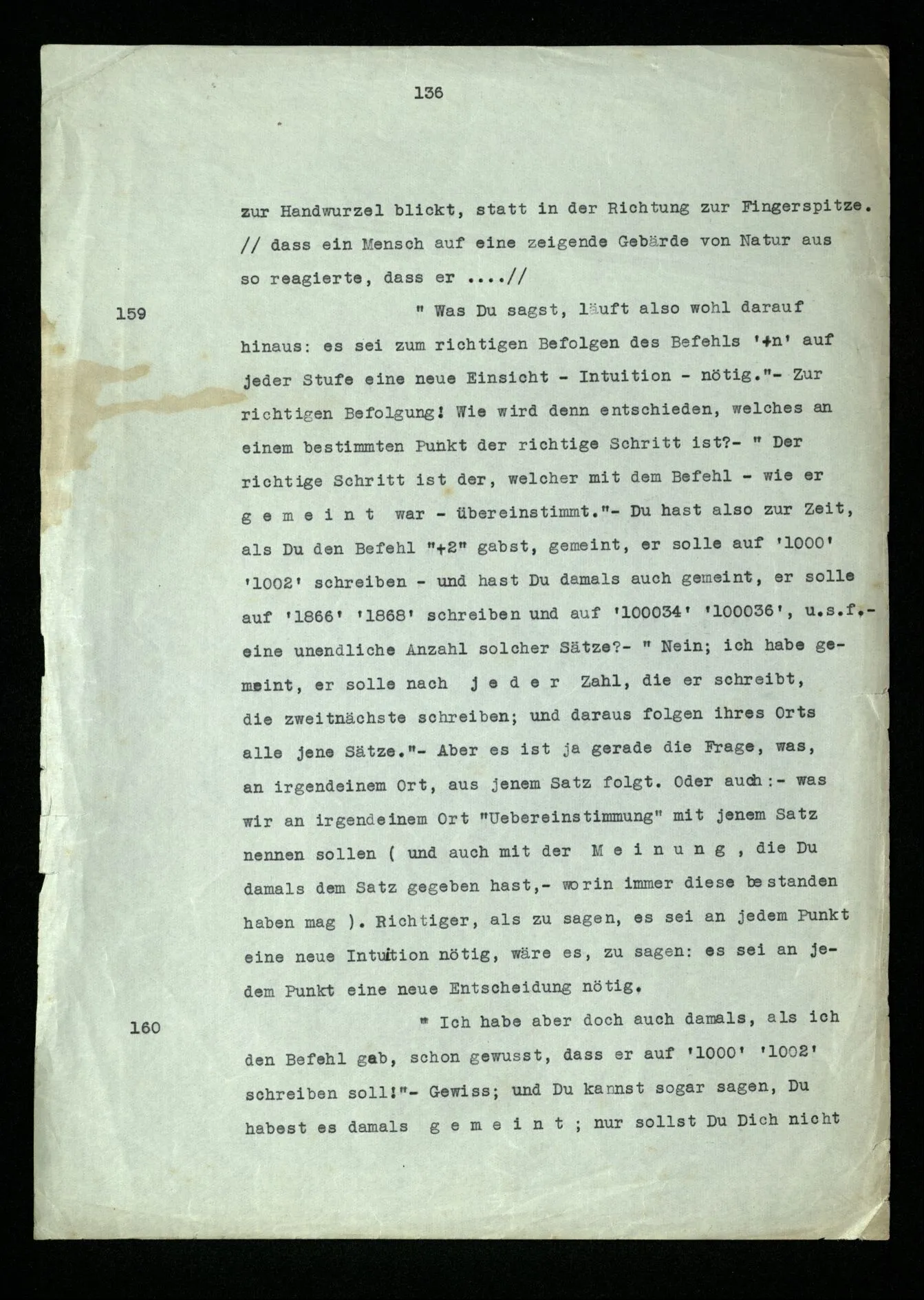 159 “Was Du sagst, läuft also wohl darauf hinaus: es sei zum richtigen Befolgen des Befehls ‘+n’ auf jeder Stufe eine neue Einsicht – Intuition – nötig.” – Zur richtigen Befolgung! Wie wird denn entschieden, welches an einem bestimmten Punkt der richtige Schritt ist? – “Der richtige Schritt ist der, welcher mit dem Befehl – wie er gemeint war – übereinstimmt.” – Du hast also zur Zeit, als Du den Befehl “ + 2” gabst, gemeint, er solle auf ‘1000’ ‘1002’ schreiben – und hast Du damals auch gemeint, er solle auf ‘1866’ ‘1868’ schreiben und auf ‘100034’ ‘100036’, u.s.f. – eine unendliche Anzahl solcher Sätze? – “Nein; ich habe gemeint, er solle nach jeder Zahl, die er schreibt, die zweitnächste schreiben; und daraus folgen ihres Orts alle jene Sätze.” – Aber es ist ja gerade die Frage, was, an irgendeinem Ort, aus jenem Satz folgt. Oder auch: – was wir an irgendeinem Ort “Übereinstimmung” mit jenem Satz nennen sollen (und auch mit der Meinung, die Du damals dem Satz gegeben hast, – worin immer diese bestanden haben mag). Richtiger, als zu sagen, es sei an jedem Punkt eine neue Intuition nötig, wäre es, zu sagen: es sei an jedem Punkt eine neue Entscheidung nötig.