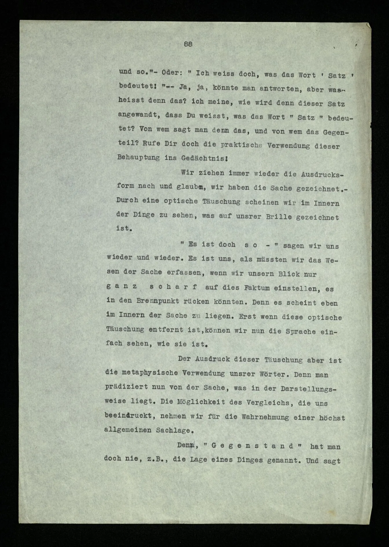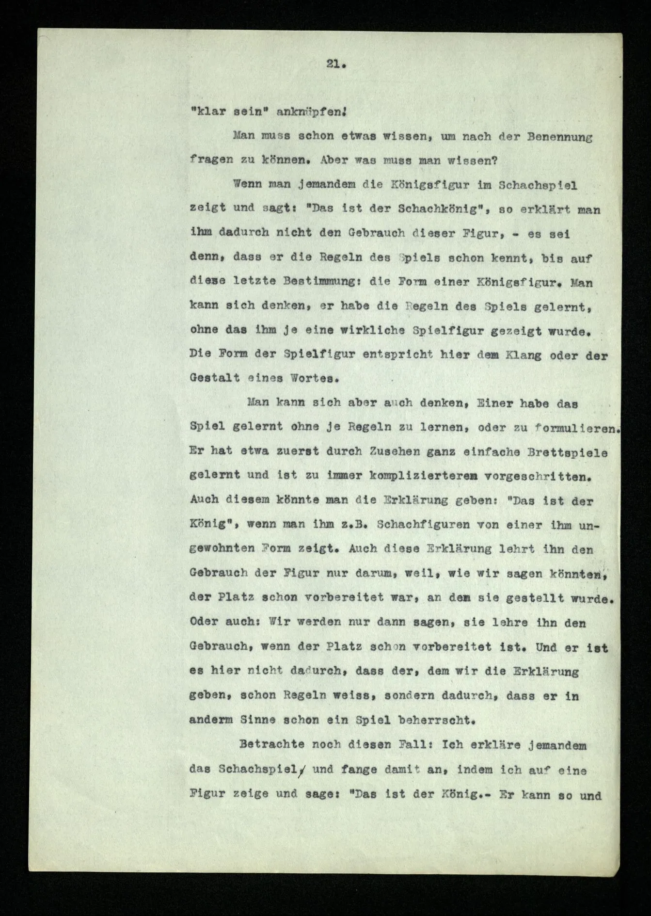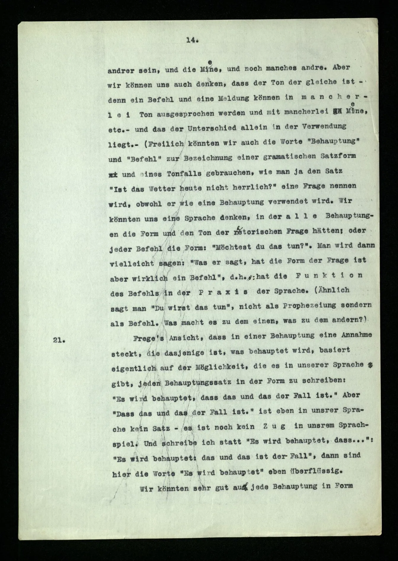 21. Frege’s Ansicht, daß in einer Behauptung eine Annahme steckt, die dasjenige ist, was behauptet wird, basiert eigentlich auf der Möglichkeit, die es in unserer Sprache gibt, jeden Behauptungssatz in der Form zu schreiben: “Es wird behauptet, daß das und das der Fall ist.” Aber “Daß das und das der Fall ist.” ist eben in unsrer Sprache kein Satz – es ist noch kein Zug in unsrem Sprachspiel. Und schreibe ich statt “Es wird behauptet, daß …”: “Es wird behauptet das und das ist der Fall”, dann sind hier die Worte “Es wird behauptet” eben überflüssig. Wir könnten sehr gut auch jede Behauptung in Form einer Frage mit nachgesetzter Bejahung schreiben; also, statt “Es regnet”: “Regnet es? Ja!”. Würde das zeigen, daß in jeder Behauptung eine Frage steckt?