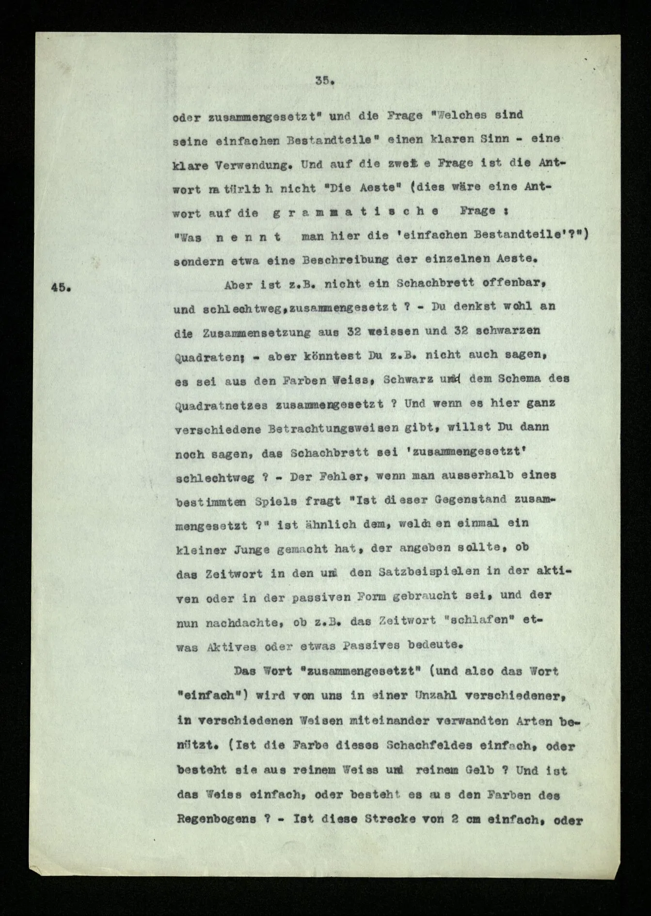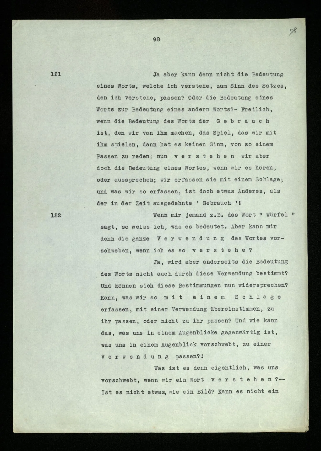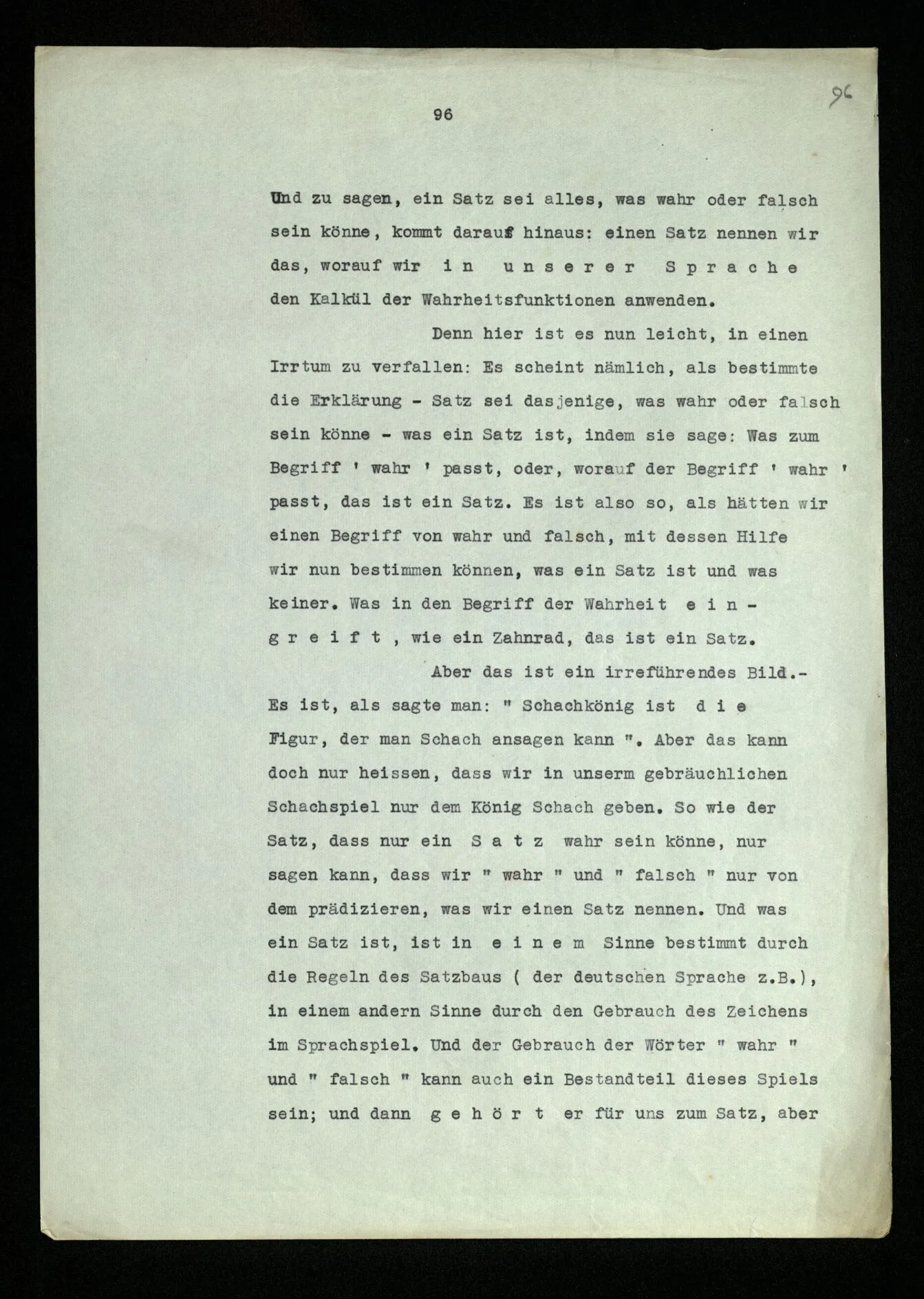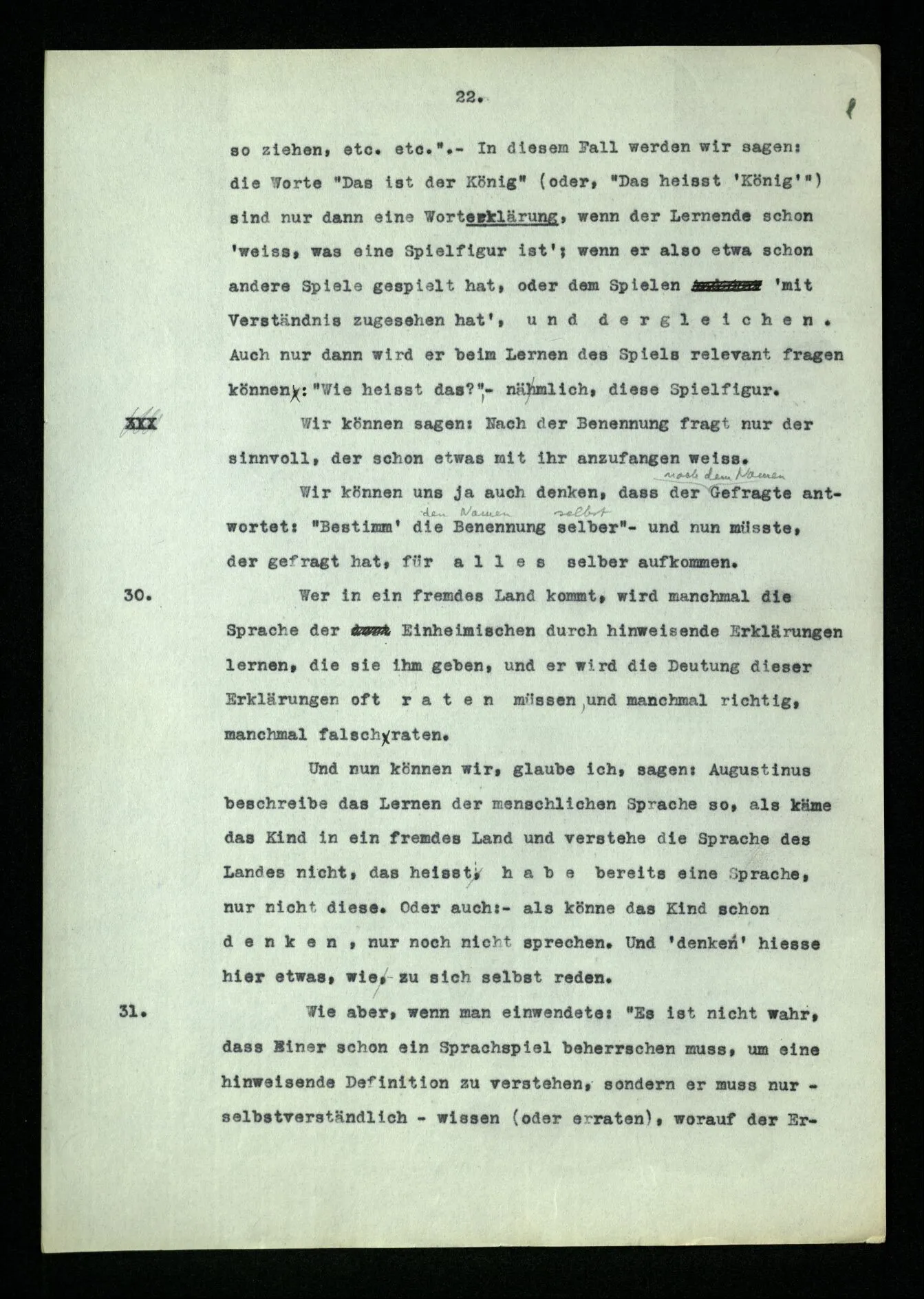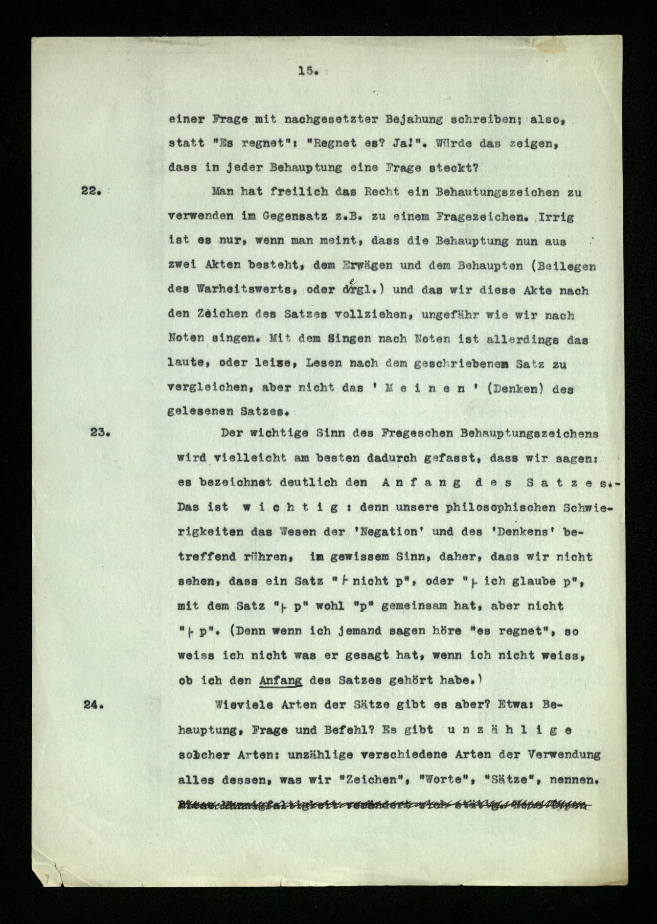 22. Man hat freilich das Recht ein Behauptungszeichen zu verwenden im Gegensatz z.B. zu einem Fragezeichen. Irrig ist es nur, wenn man meint, daß die Behauptung nun aus zwei Akten besteht, dem Erwägen und dem Behaupten (Beilegen des Wahrheitswerts, oder dergleichen) und daß wir diese Akte nach den Zeichen des Satzes vollziehen, ungefähr wie wir nach Noten singen. Mit dem Singen nach Noten ist allerdings das laute, oder leise, Lesen nach dem geschriebenen Satz zu vergleichen, aber nicht das ‘Meinen’ (Denken) des gelesenen Satzes.
