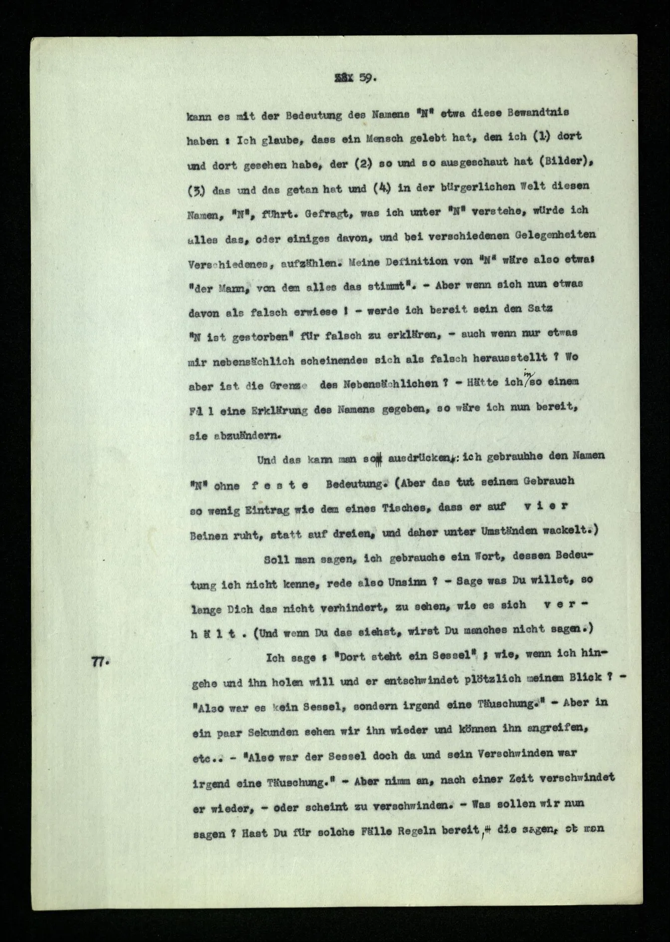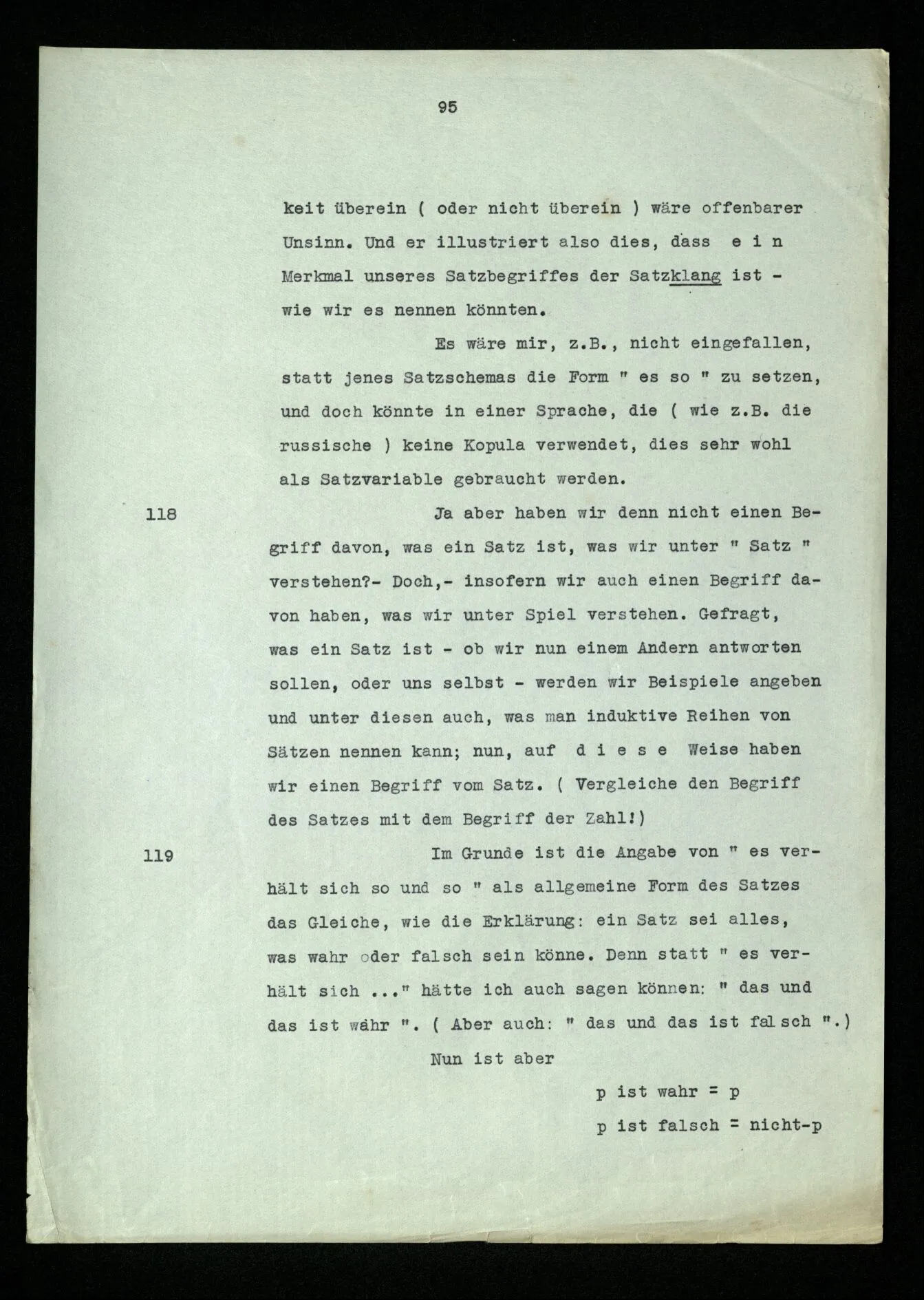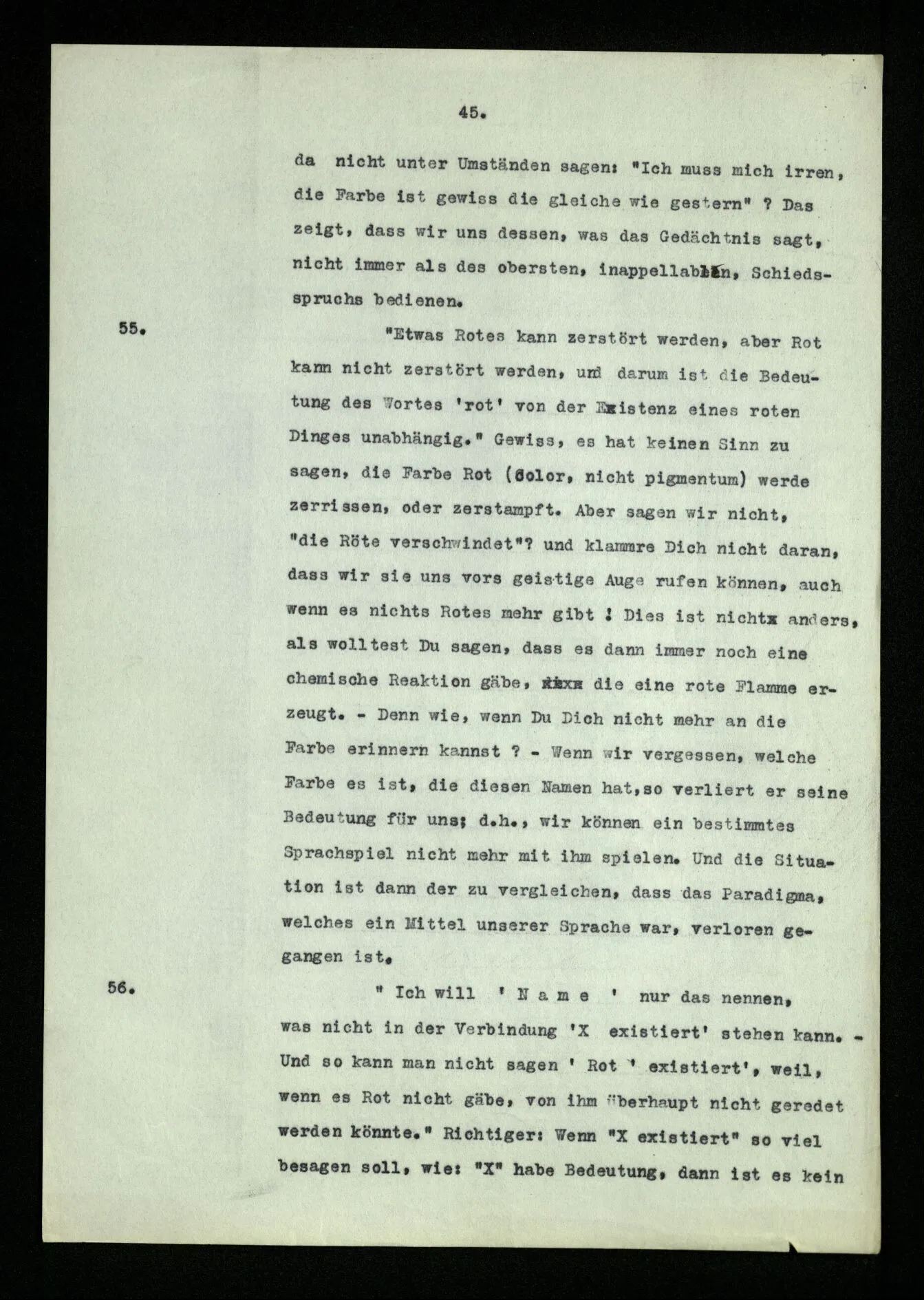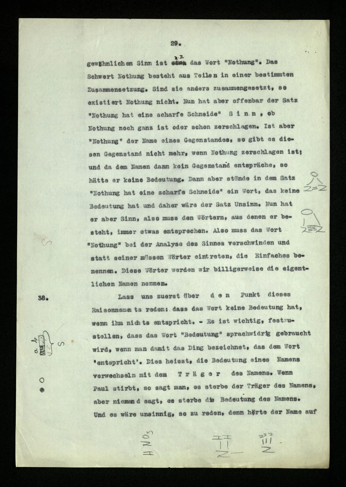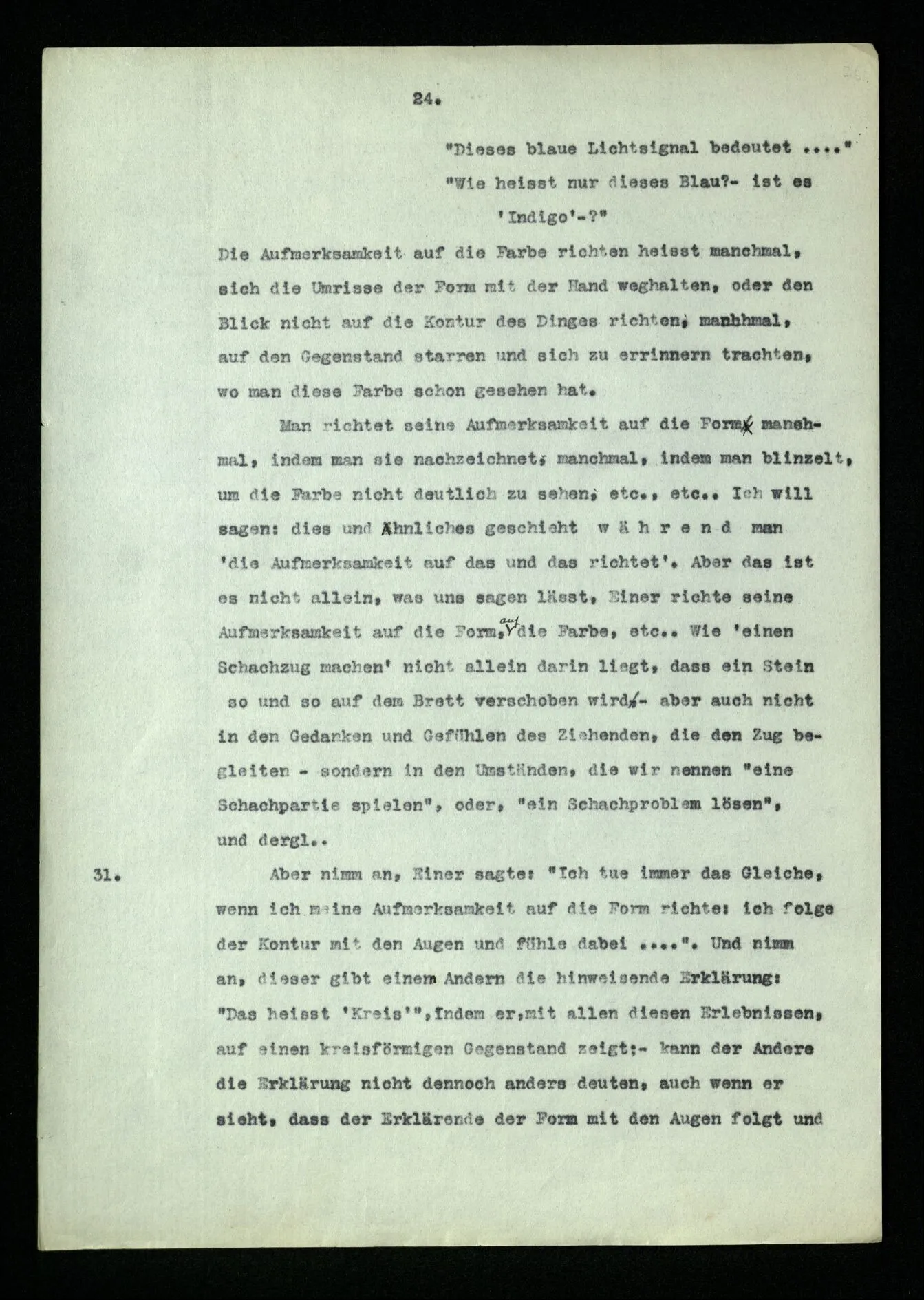 22. Man hat freilich das Recht ein Behauptungszeichen zu verwenden im Gegensatz z.B. zu einem Fragezeichen. Irrig ist es nur, wenn man meint, daß die Behauptung nun aus zwei Akten besteht, dem Erwägen und dem Behaupten (Beilegen des Wahrheitswerts, oder dergleichen) und daß wir diese Akte nach den Zeichen des Satzes vollziehen, ungefähr wie wir nach Noten singen. Mit dem Singen nach Noten ist allerdings das laute, oder leise, Lesen nach dem geschriebenen Satz zu vergleichen, aber nicht das ‘Meinen’ (Denken) des gelesenen Satzes.