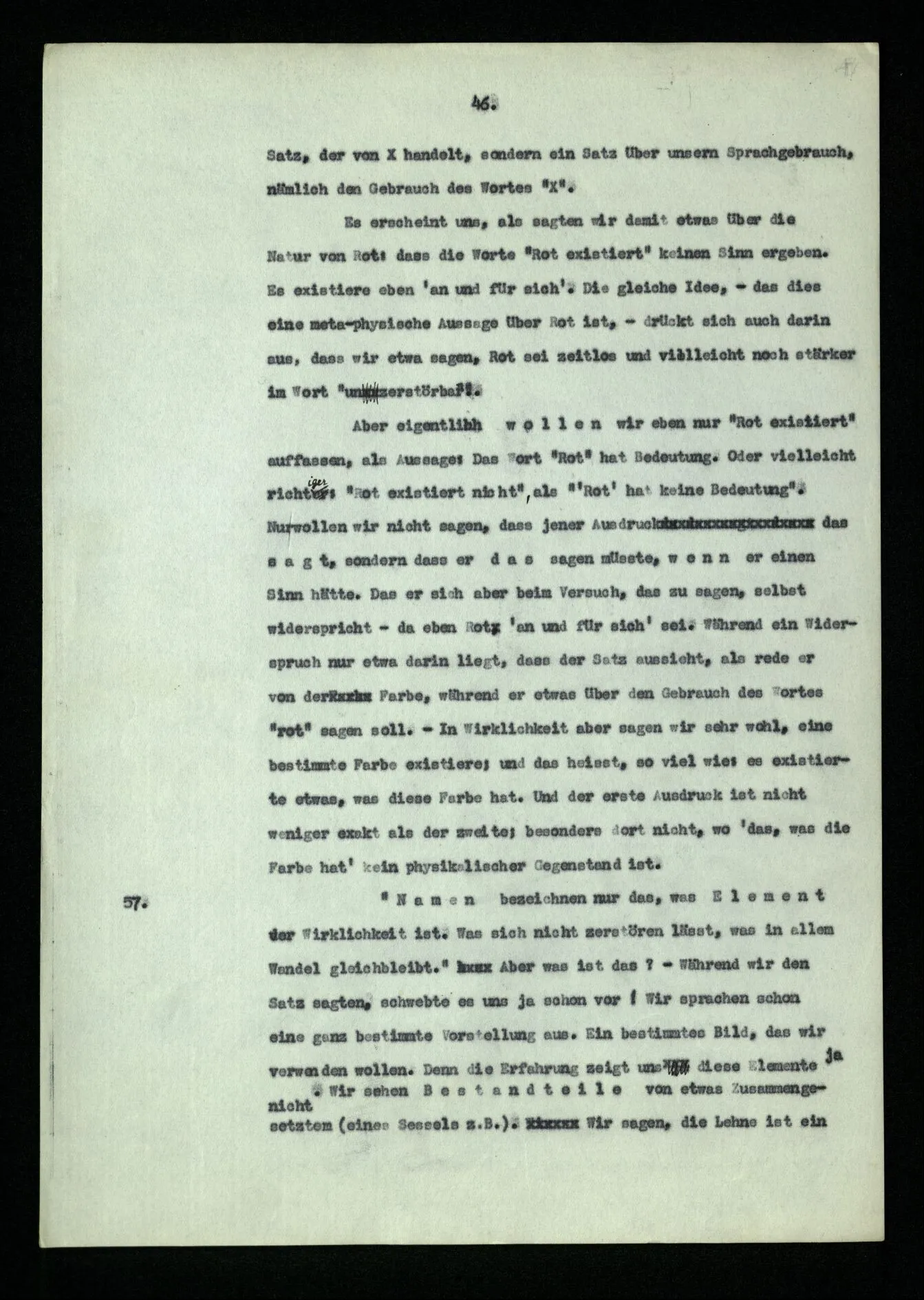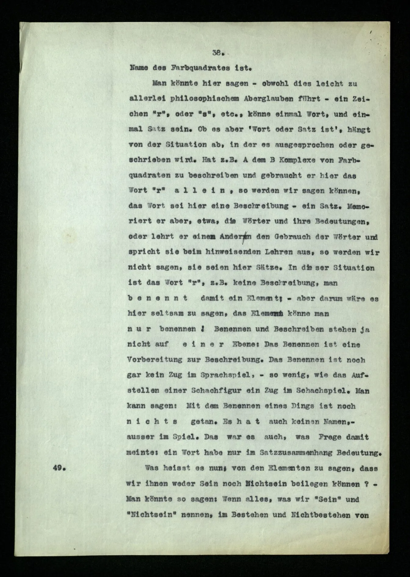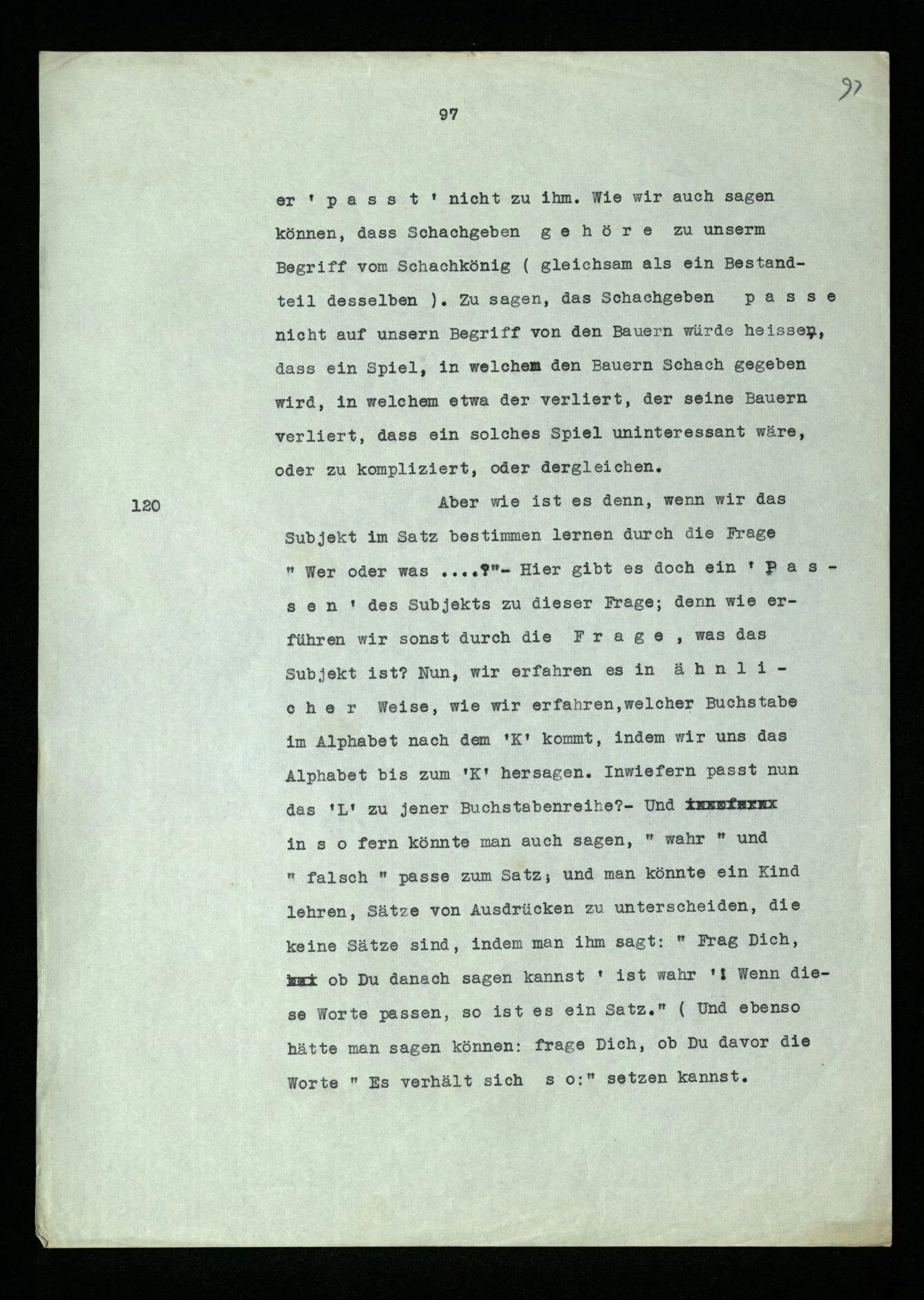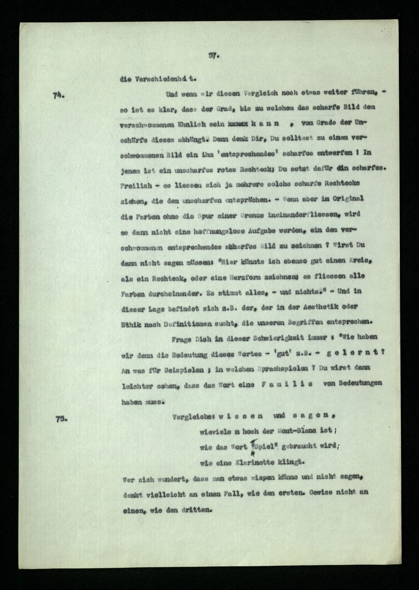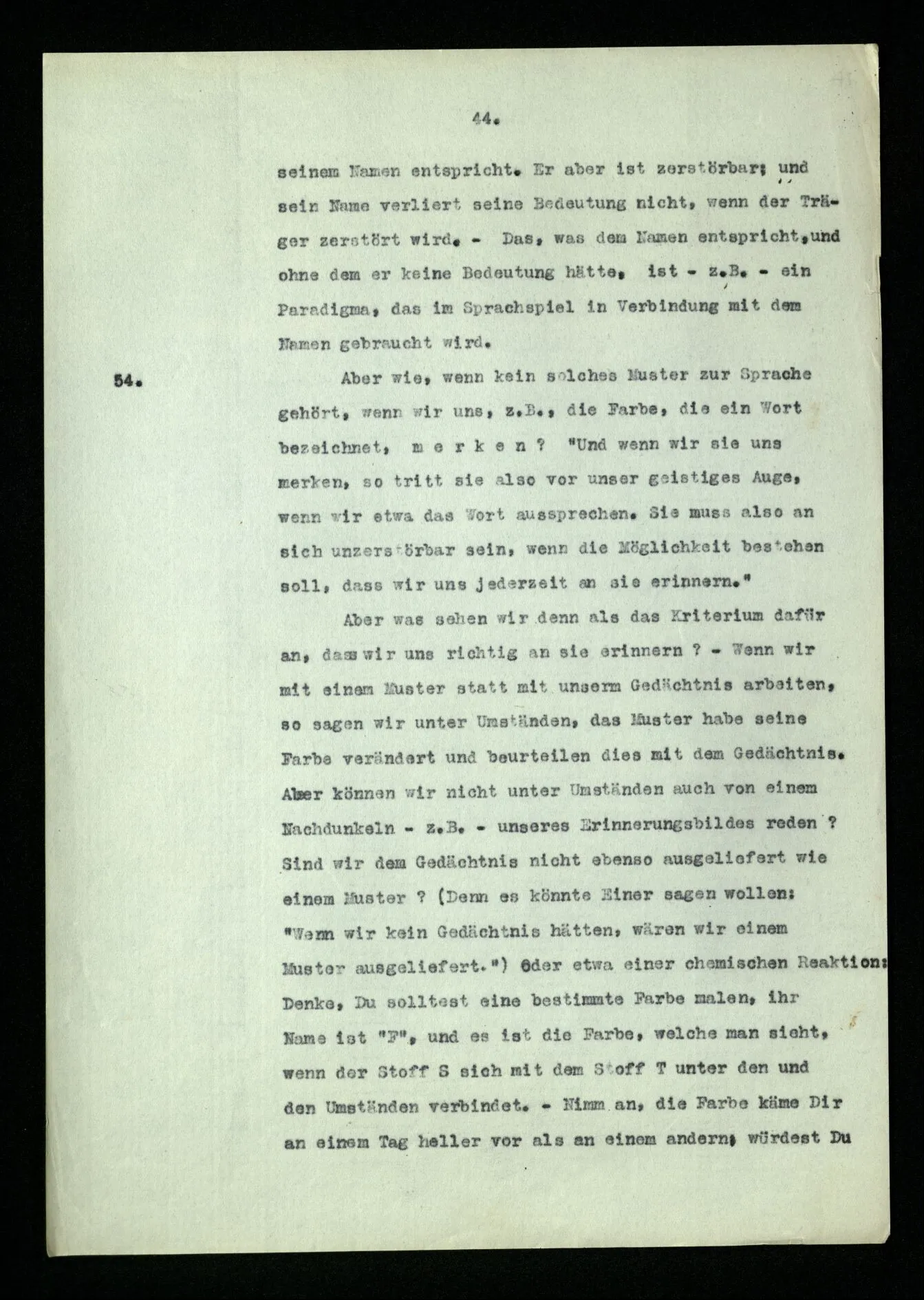 22. Man hat freilich das Recht ein Behauptungszeichen zu verwenden im Gegensatz z.B. zu einem Fragezeichen. Irrig ist es nur, wenn man meint, daß die Behauptung nun aus zwei Akten besteht, dem Erwägen und dem Behaupten (Beilegen des Wahrheitswerts, oder dergleichen) und daß wir diese Akte nach den Zeichen des Satzes vollziehen, ungefähr wie wir nach Noten singen. Mit dem Singen nach Noten ist allerdings das laute, oder leise, Lesen nach dem geschriebenen Satz zu vergleichen, aber nicht das ‘Meinen’ (Denken) des gelesenen Satzes.