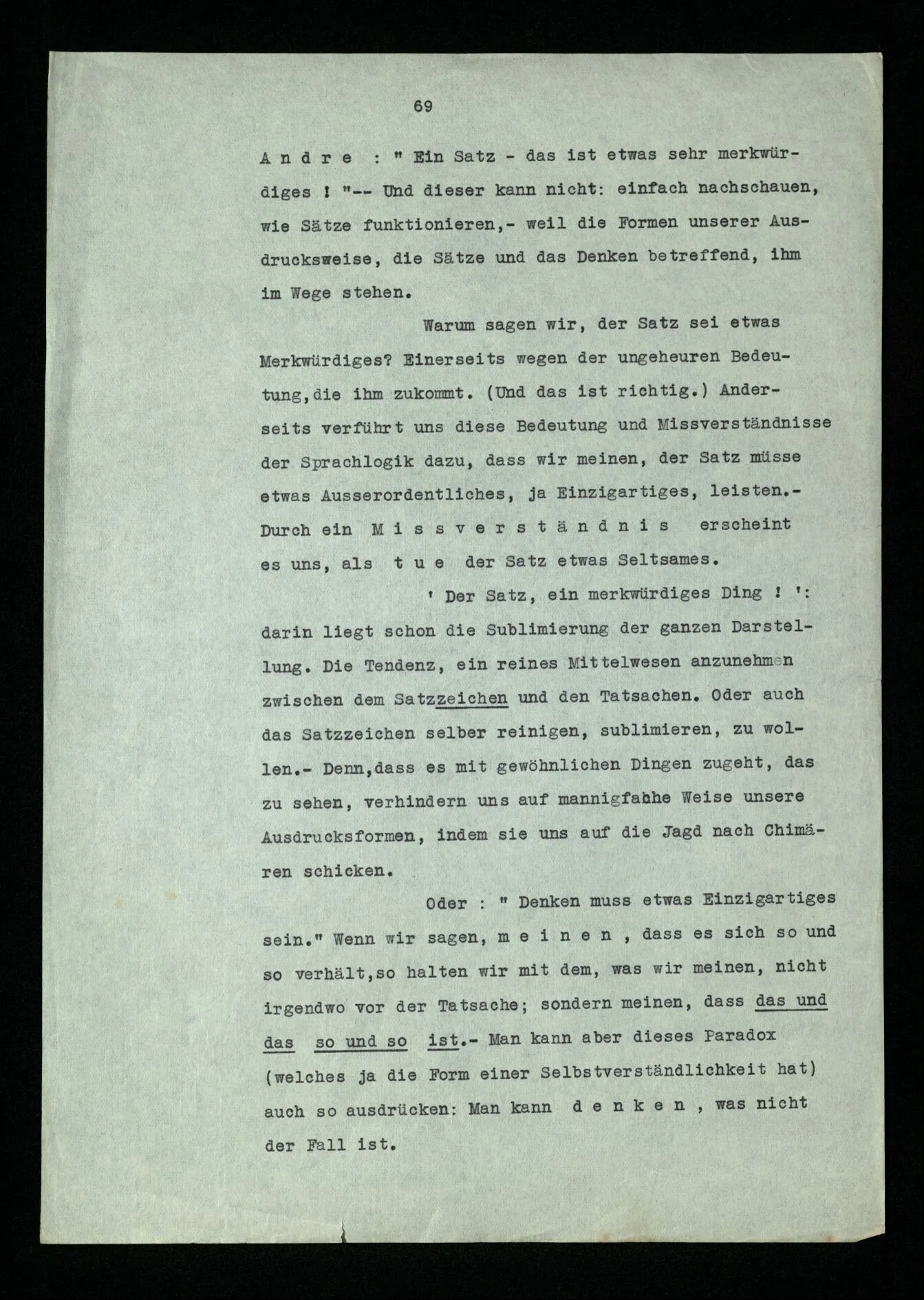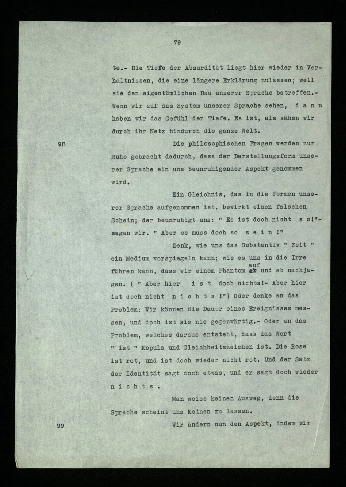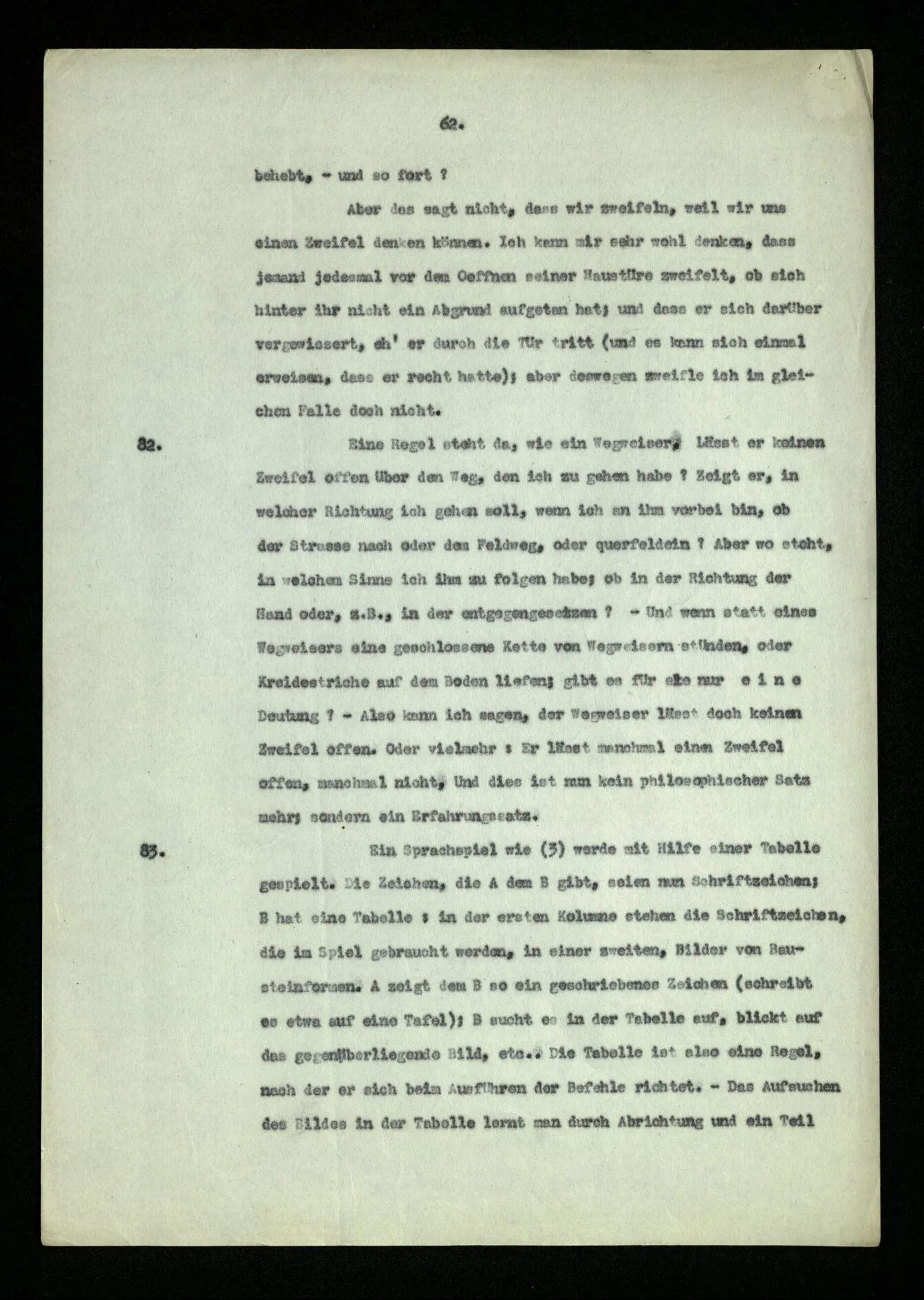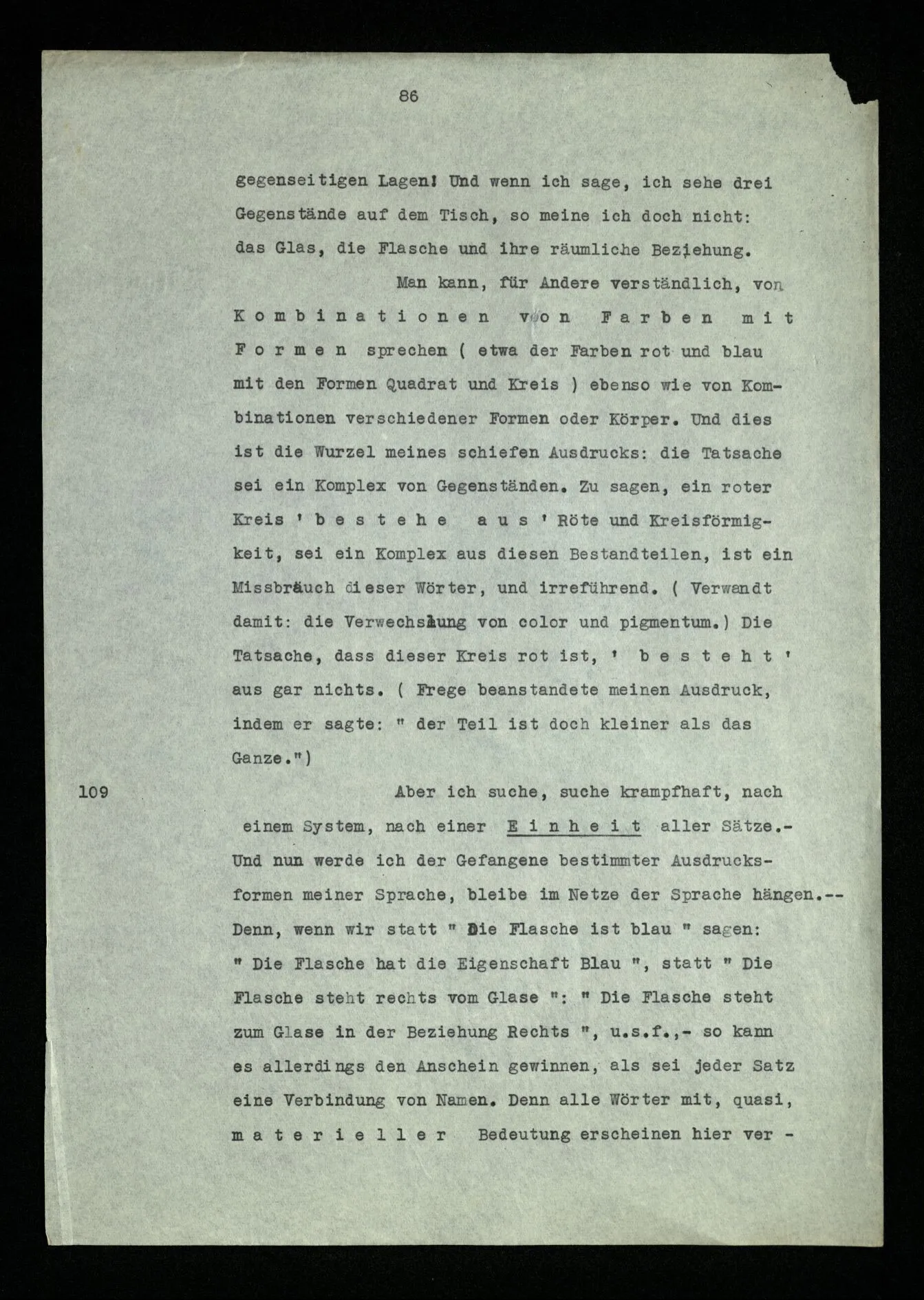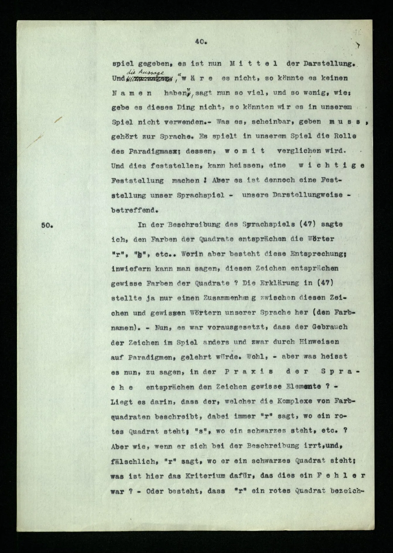 22. Man hat freilich das Recht ein Behauptungszeichen zu verwenden im Gegensatz z.B. zu einem Fragezeichen. Irrig ist es nur, wenn man meint, daß die Behauptung nun aus zwei Akten besteht, dem Erwägen und dem Behaupten (Beilegen des Wahrheitswerts, oder dergleichen) und daß wir diese Akte nach den Zeichen des Satzes vollziehen, ungefähr wie wir nach Noten singen. Mit dem Singen nach Noten ist allerdings das laute, oder leise, Lesen nach dem geschriebenen Satz zu vergleichen, aber nicht das ‘Meinen’ (Denken) des gelesenen Satzes.