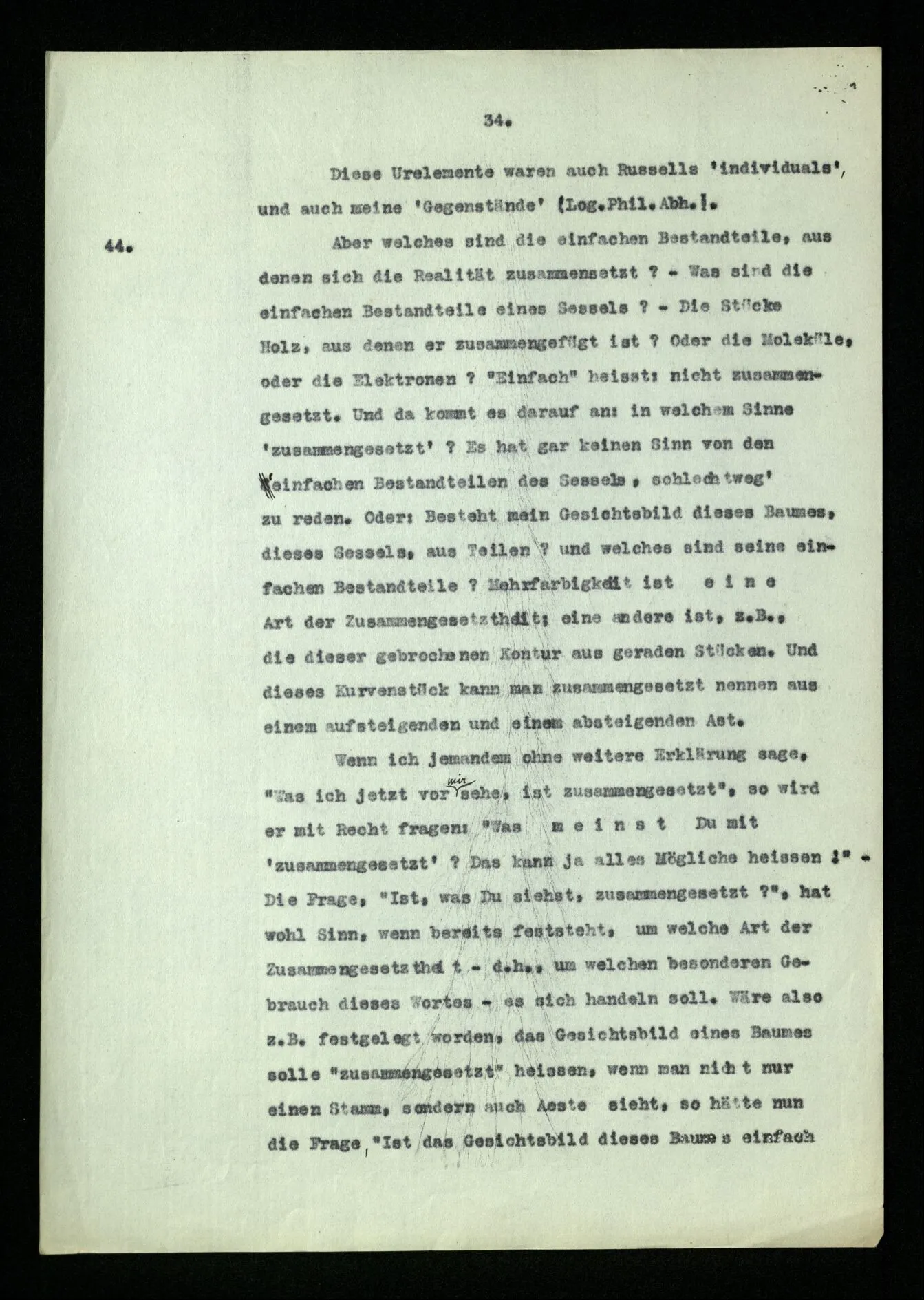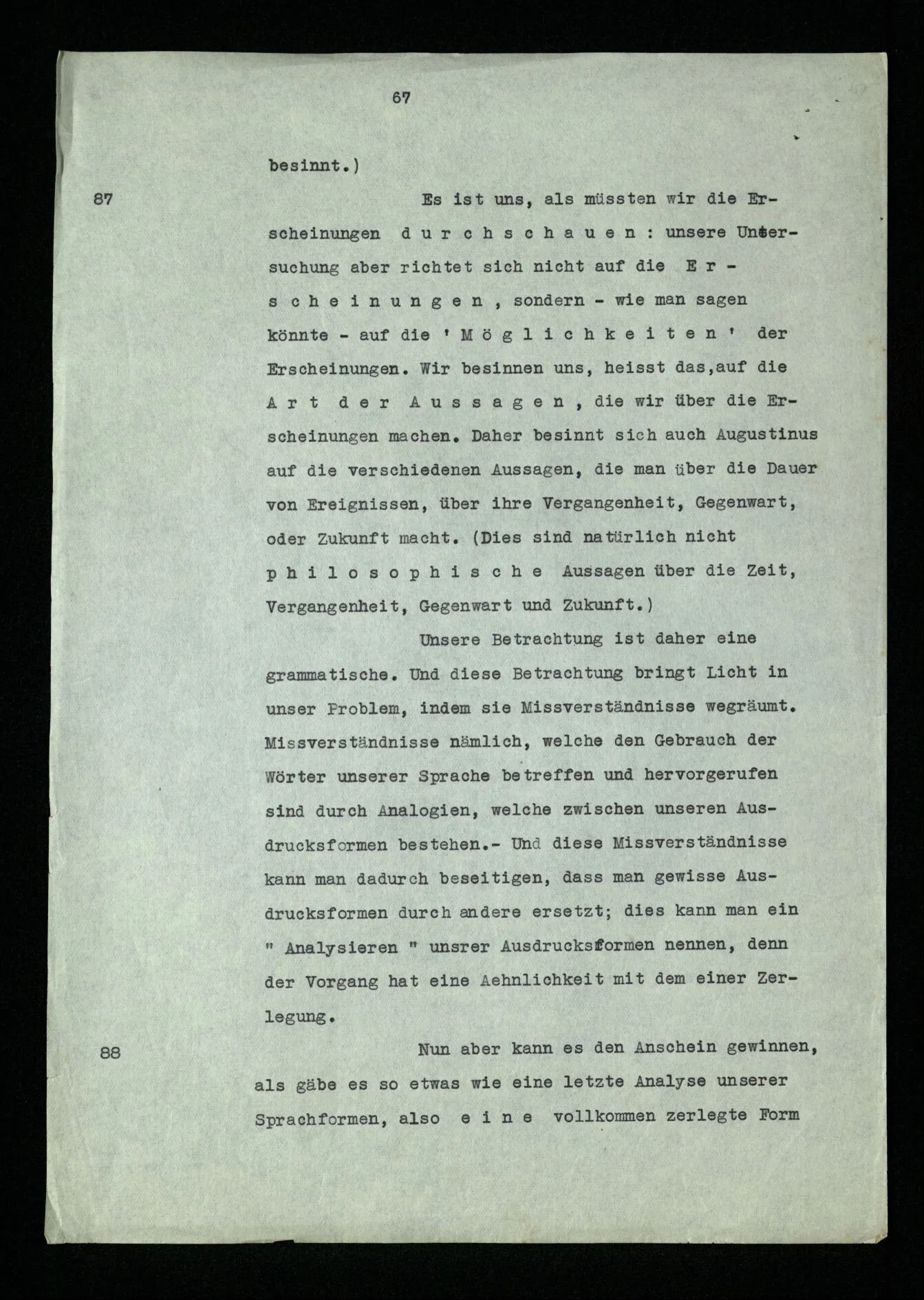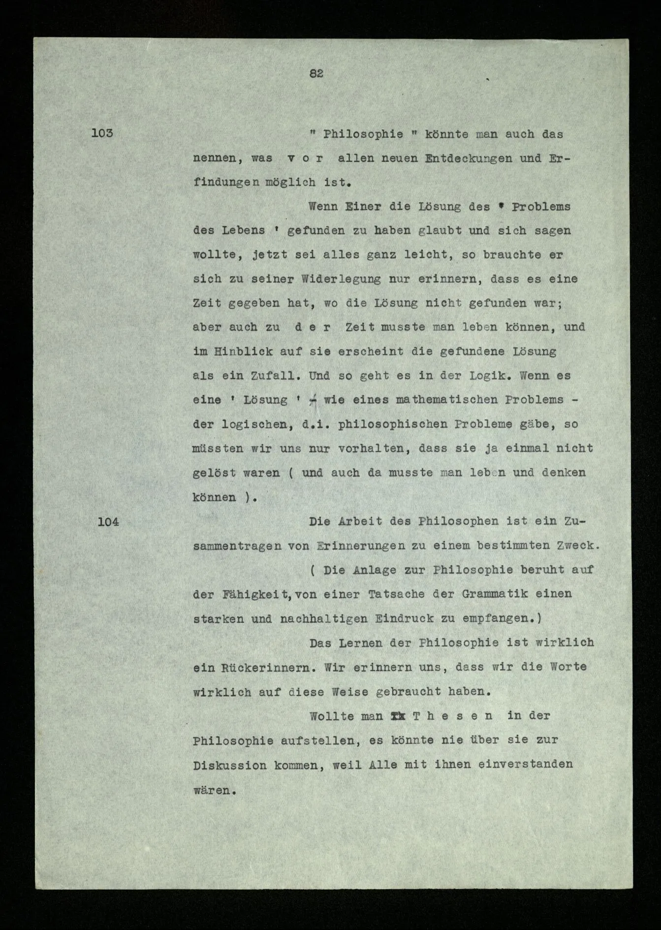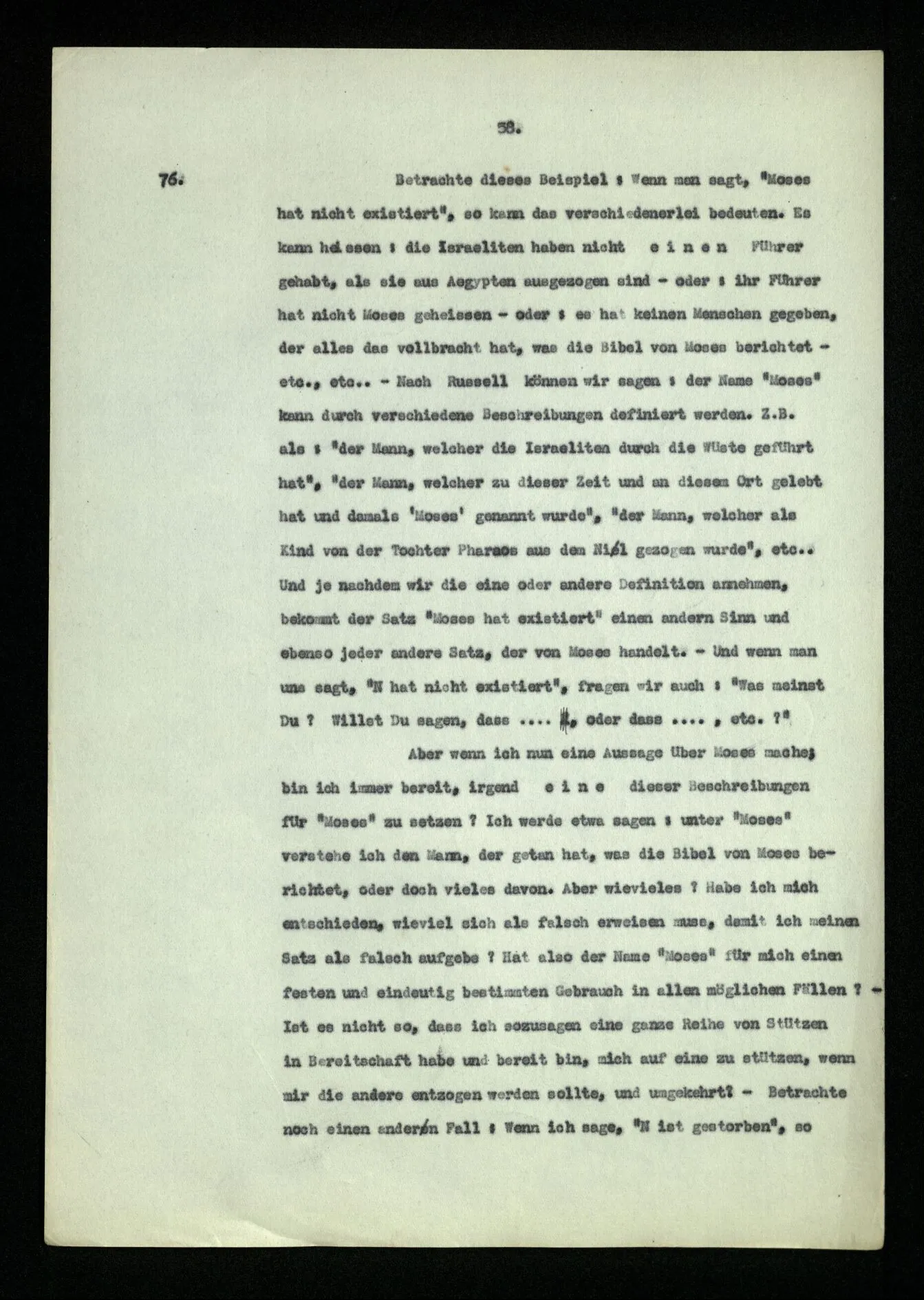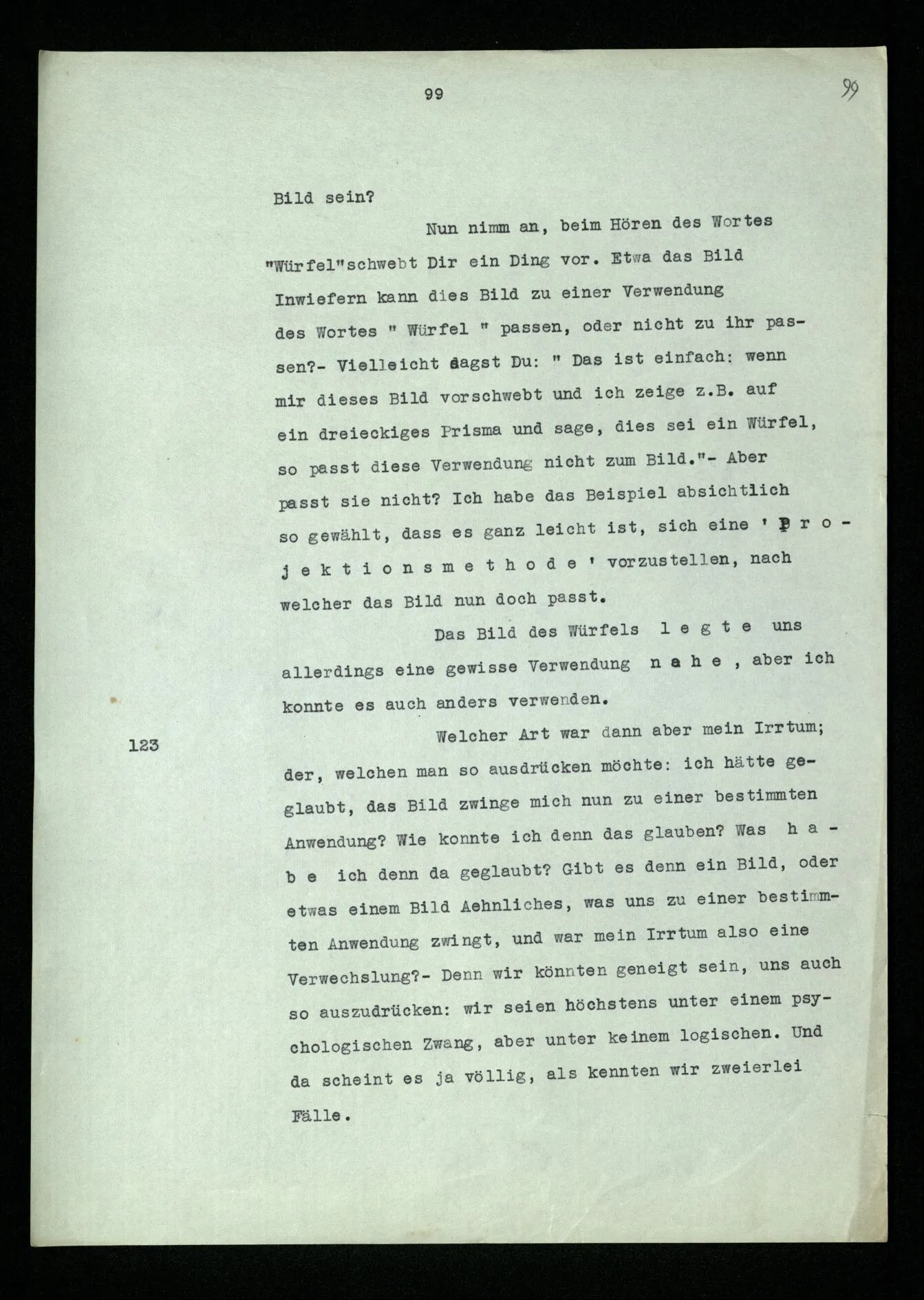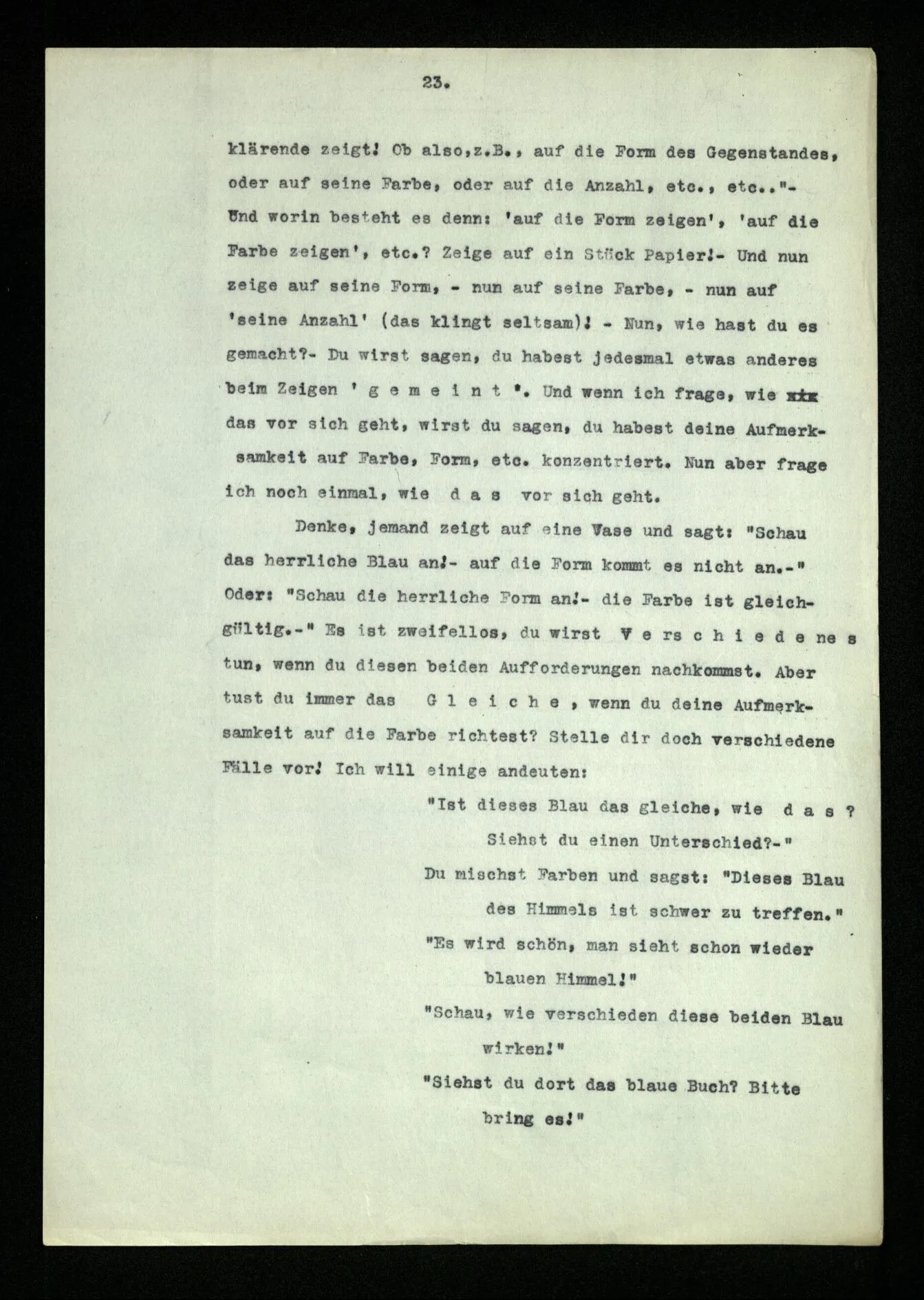 22. Man hat freilich das Recht ein Behauptungszeichen zu verwenden im Gegensatz z.B. zu einem Fragezeichen. Irrig ist es nur, wenn man meint, daß die Behauptung nun aus zwei Akten besteht, dem Erwägen und dem Behaupten (Beilegen des Wahrheitswerts, oder dergleichen) und daß wir diese Akte nach den Zeichen des Satzes vollziehen, ungefähr wie wir nach Noten singen. Mit dem Singen nach Noten ist allerdings das laute, oder leise, Lesen nach dem geschriebenen Satz zu vergleichen, aber nicht das ‘Meinen’ (Denken) des gelesenen Satzes.