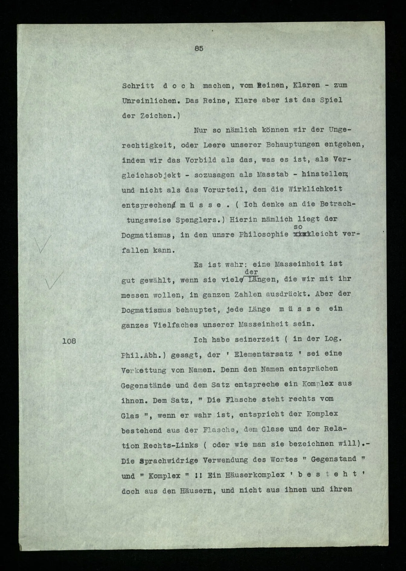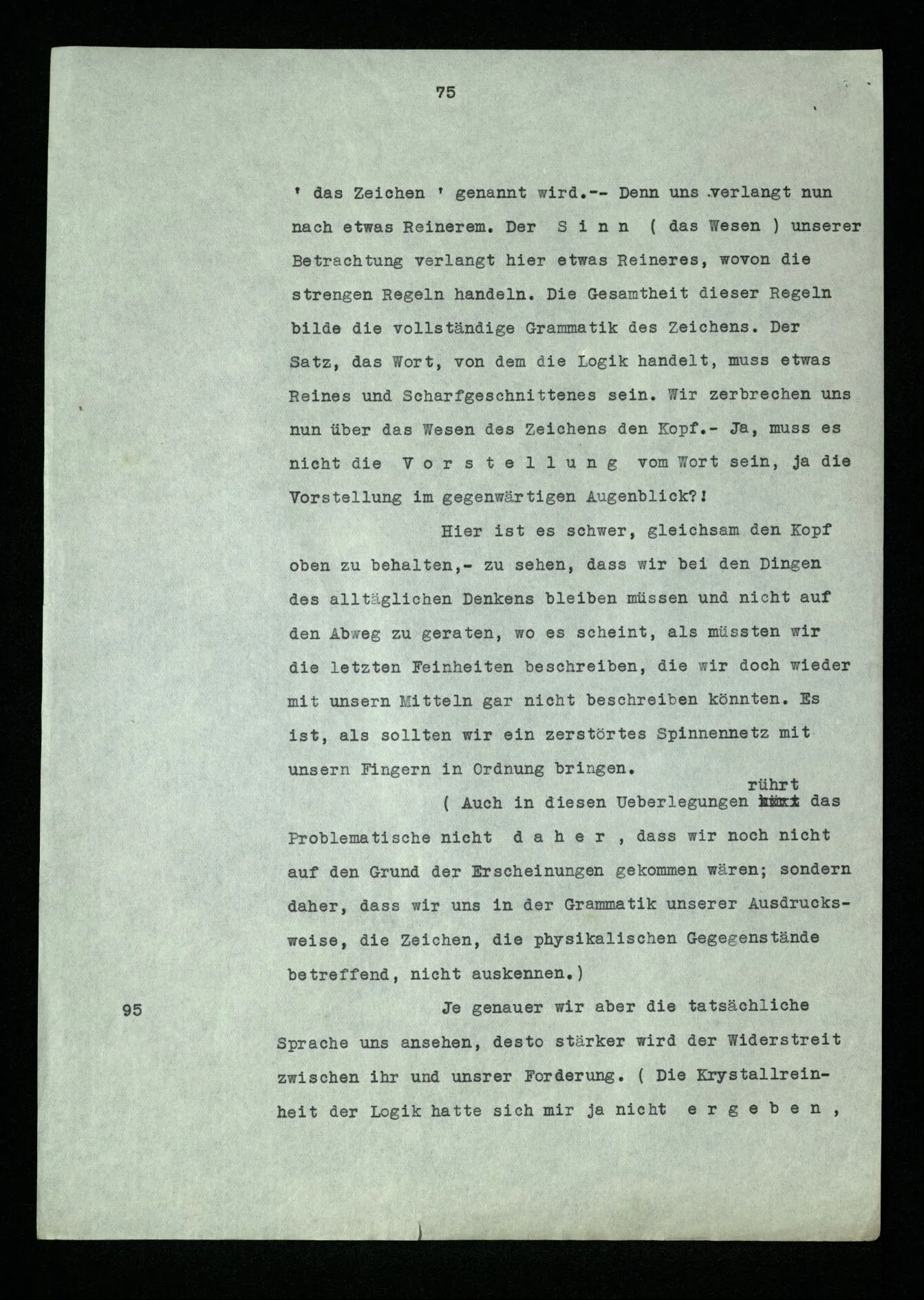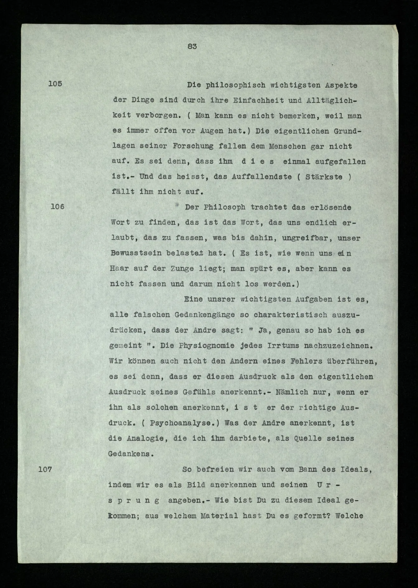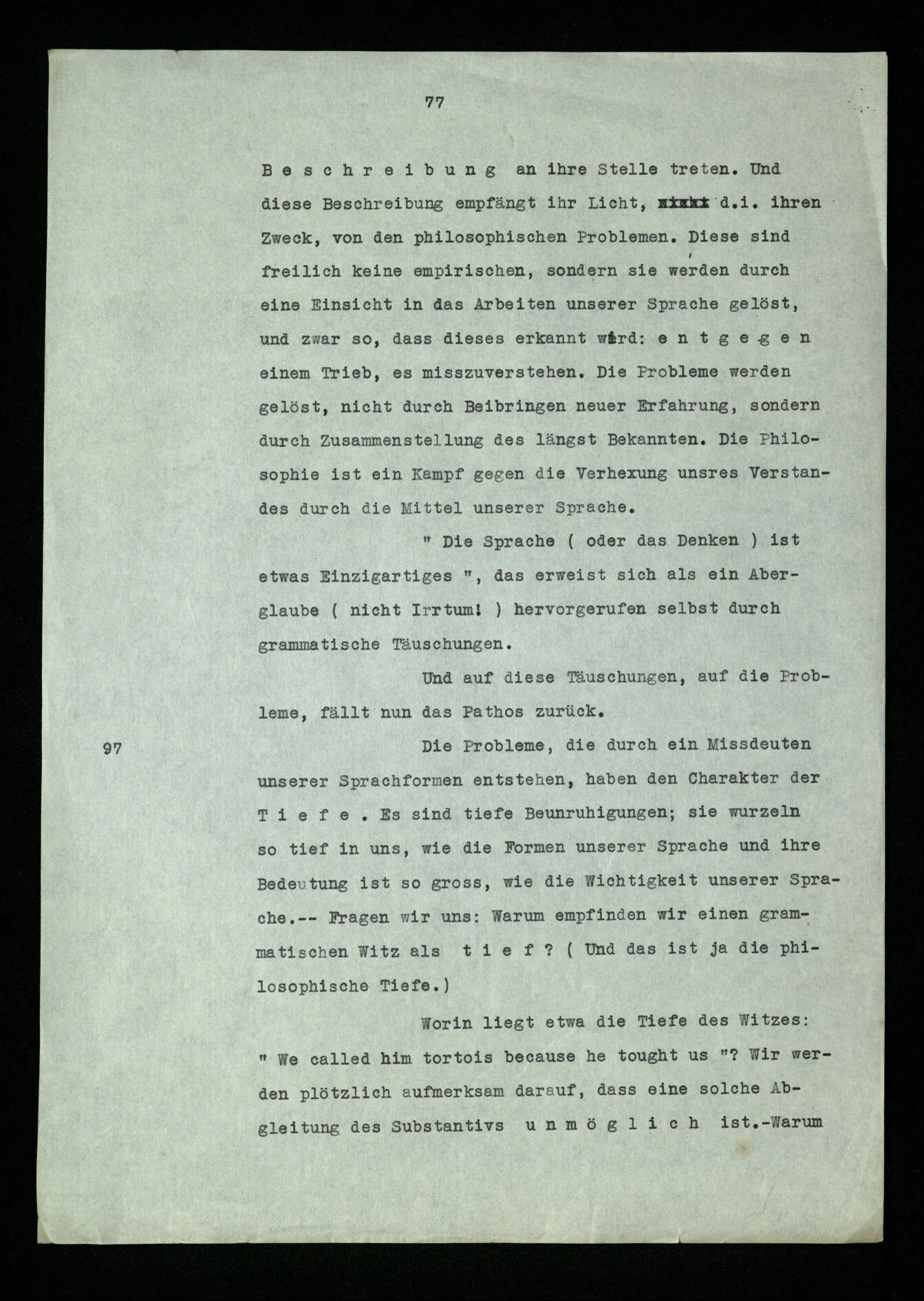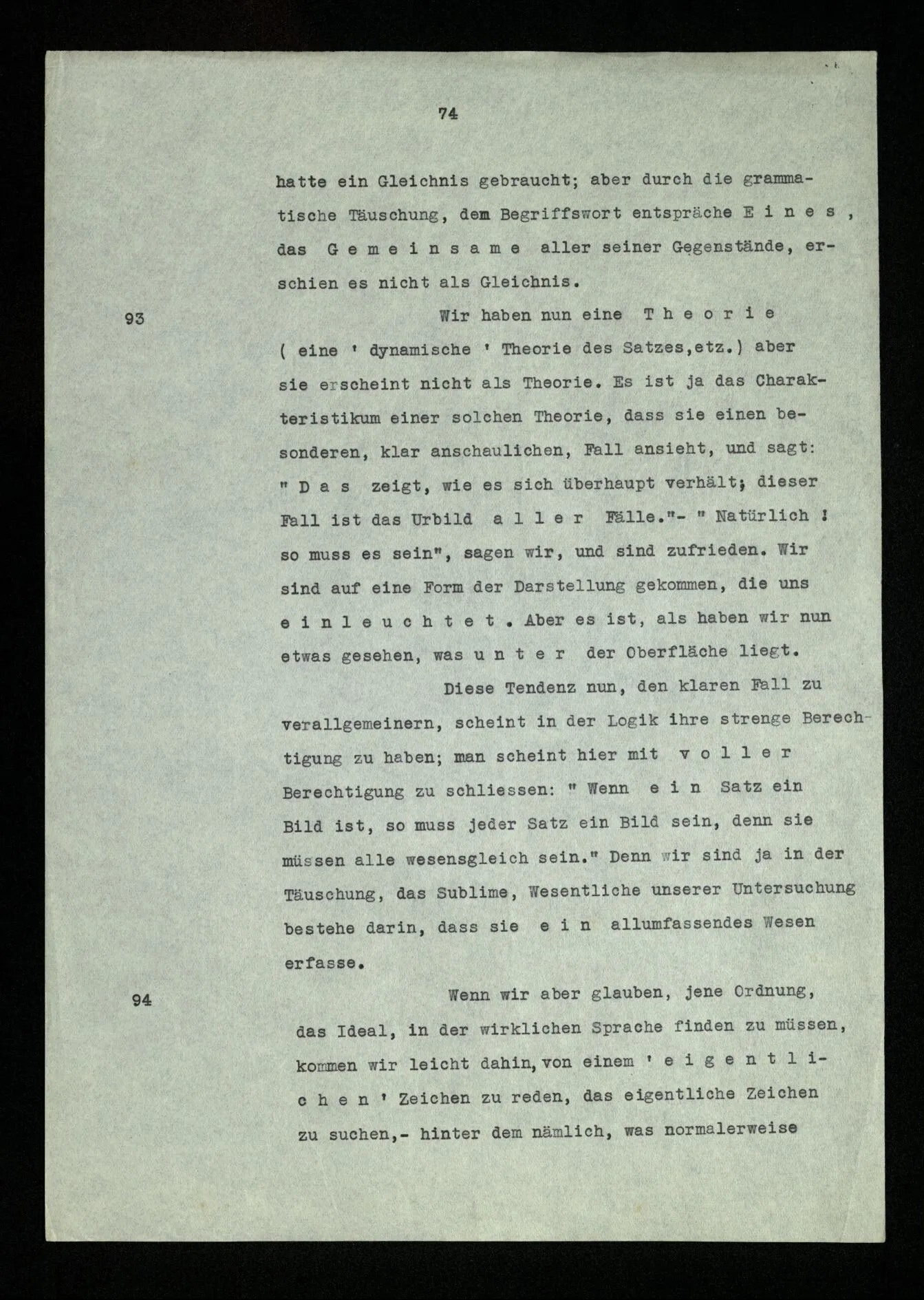 22. Man hat freilich das Recht ein Behauptungszeichen zu verwenden im Gegensatz z.B. zu einem Fragezeichen. Irrig ist es nur, wenn man meint, daß die Behauptung nun aus zwei Akten besteht, dem Erwägen und dem Behaupten (Beilegen des Wahrheitswerts, oder dergleichen) und daß wir diese Akte nach den Zeichen des Satzes vollziehen, ungefähr wie wir nach Noten singen. Mit dem Singen nach Noten ist allerdings das laute, oder leise, Lesen nach dem geschriebenen Satz zu vergleichen, aber nicht das ‘Meinen’ (Denken) des gelesenen Satzes.