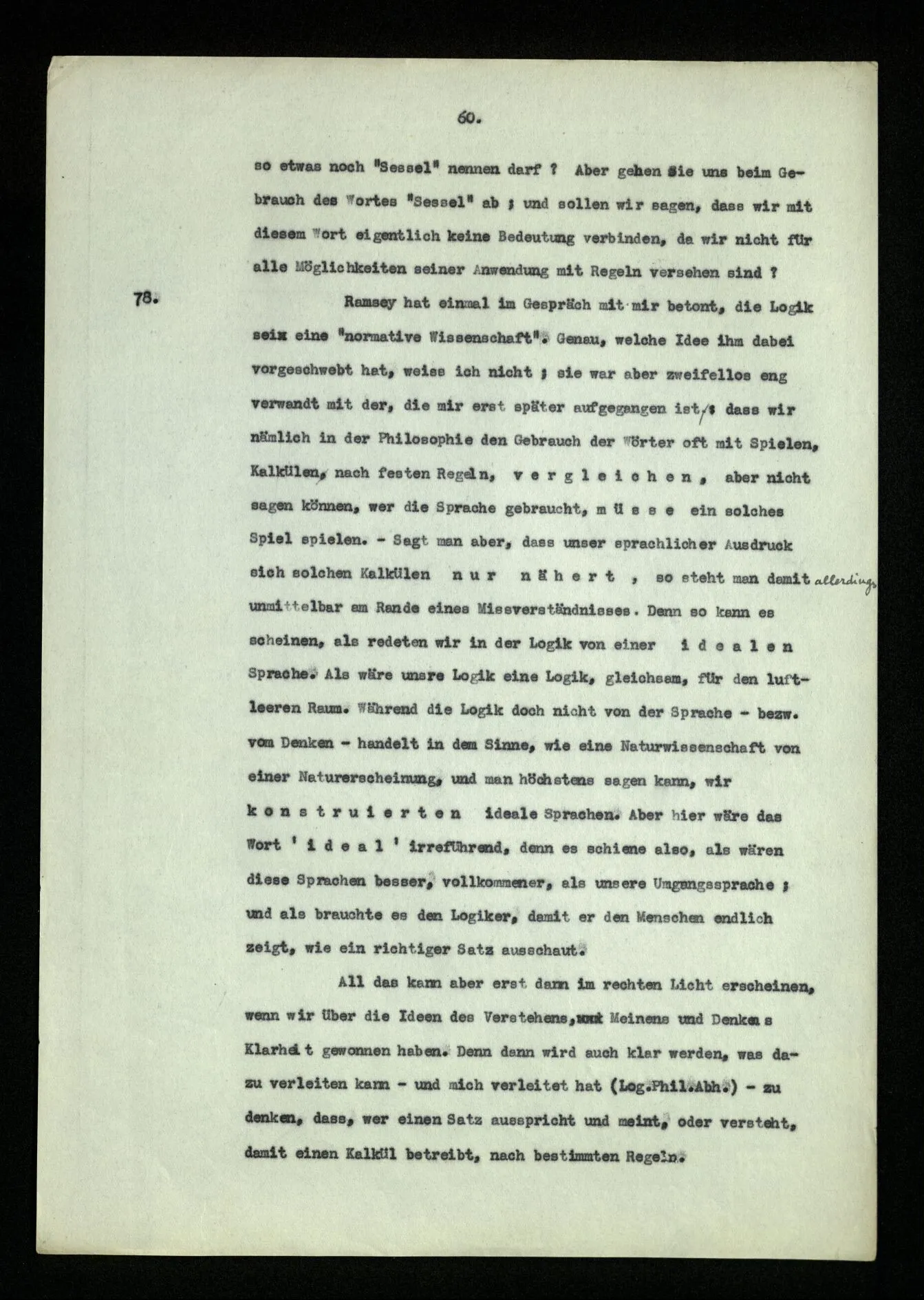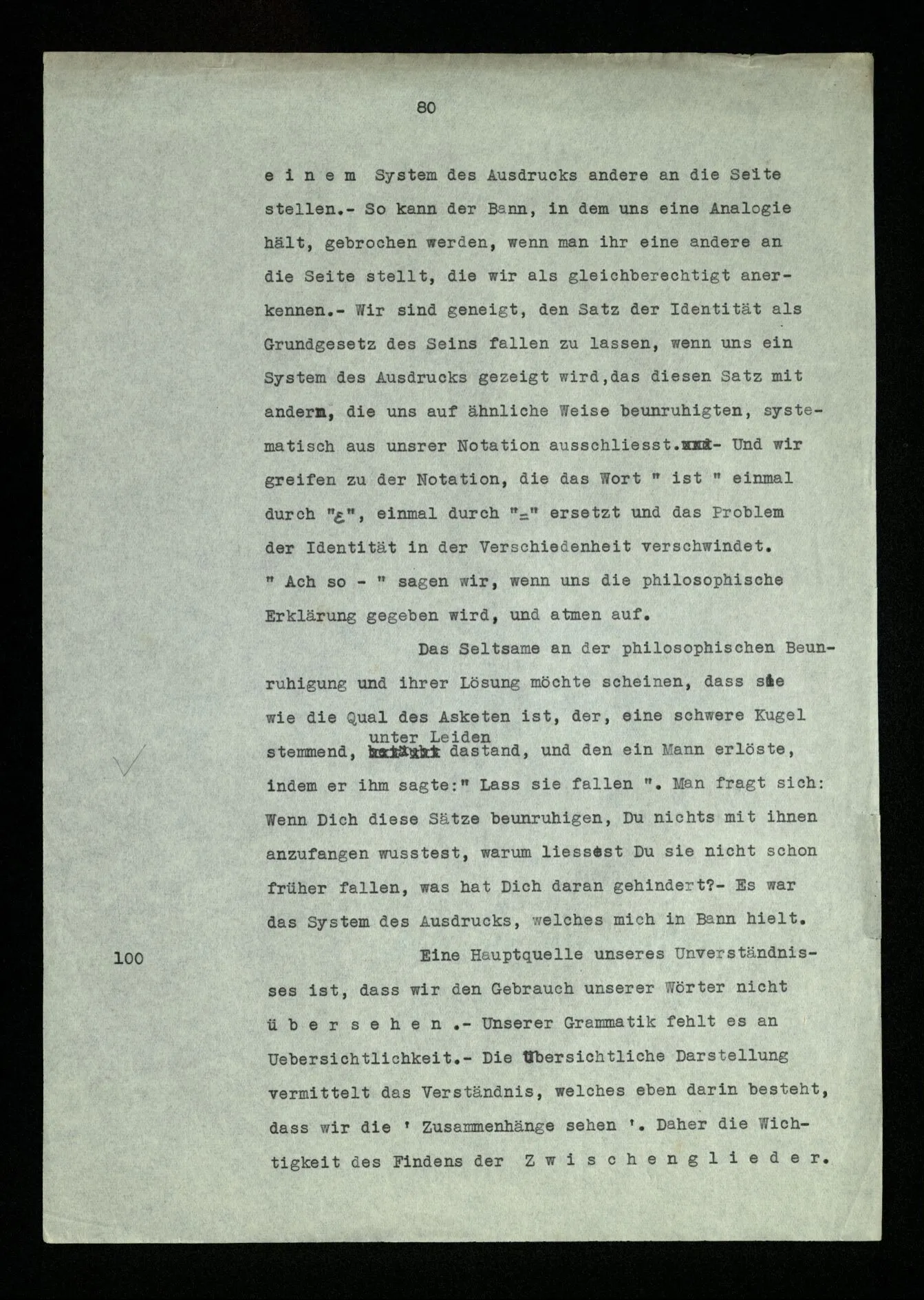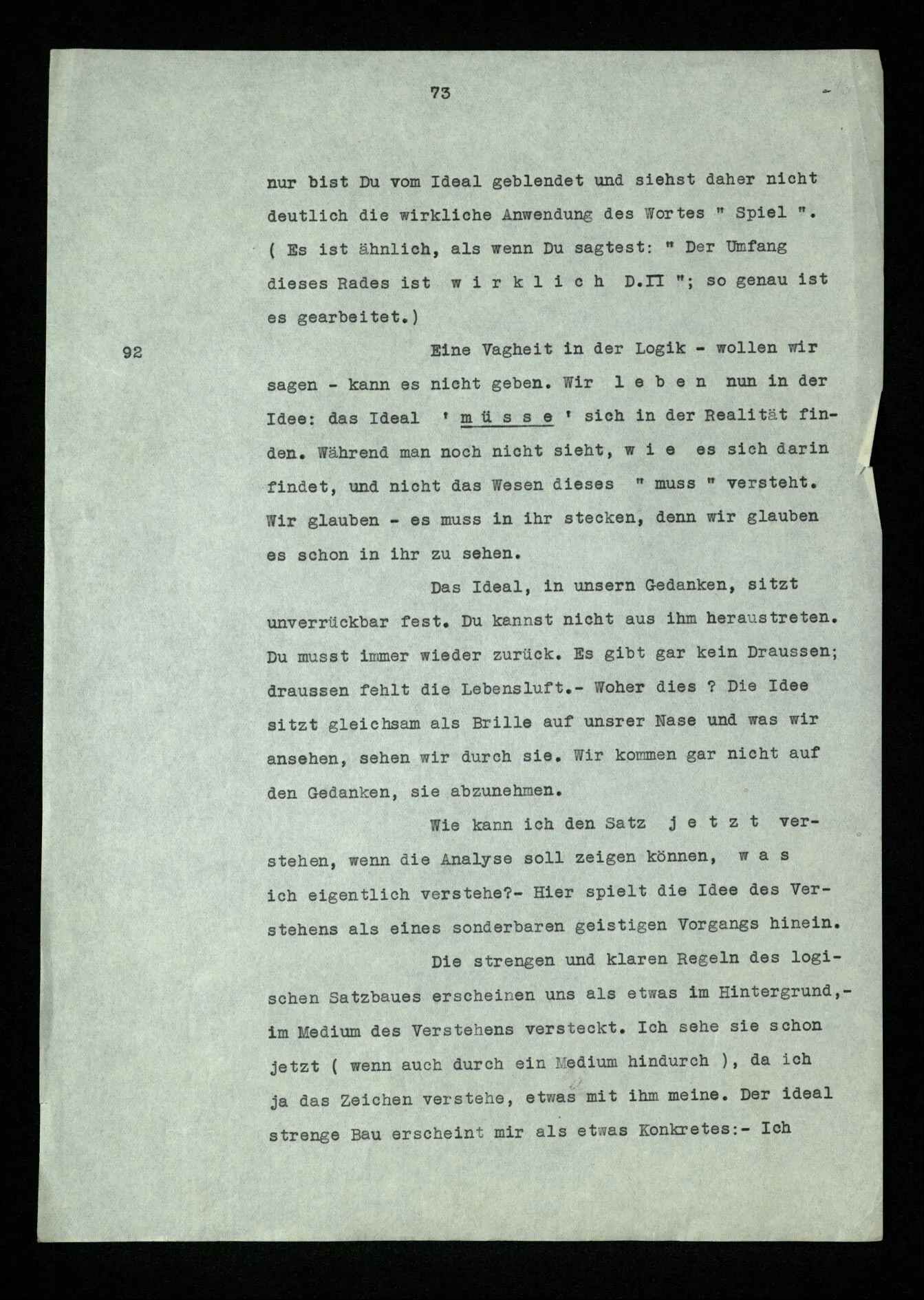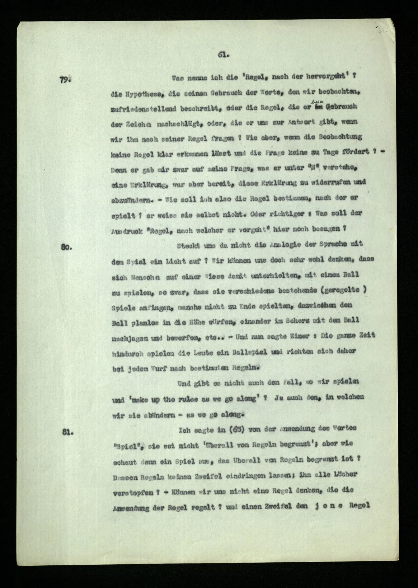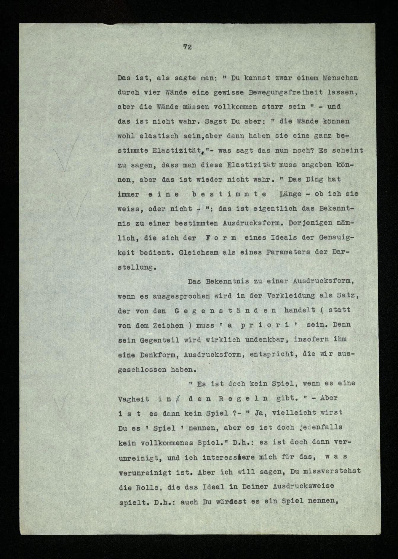 22. Man hat freilich das Recht ein Behauptungszeichen zu verwenden im Gegensatz z.B. zu einem Fragezeichen. Irrig ist es nur, wenn man meint, daß die Behauptung nun aus zwei Akten besteht, dem Erwägen und dem Behaupten (Beilegen des Wahrheitswerts, oder dergleichen) und daß wir diese Akte nach den Zeichen des Satzes vollziehen, ungefähr wie wir nach Noten singen. Mit dem Singen nach Noten ist allerdings das laute, oder leise, Lesen nach dem geschriebenen Satz zu vergleichen, aber nicht das ‘Meinen’ (Denken) des gelesenen Satzes.