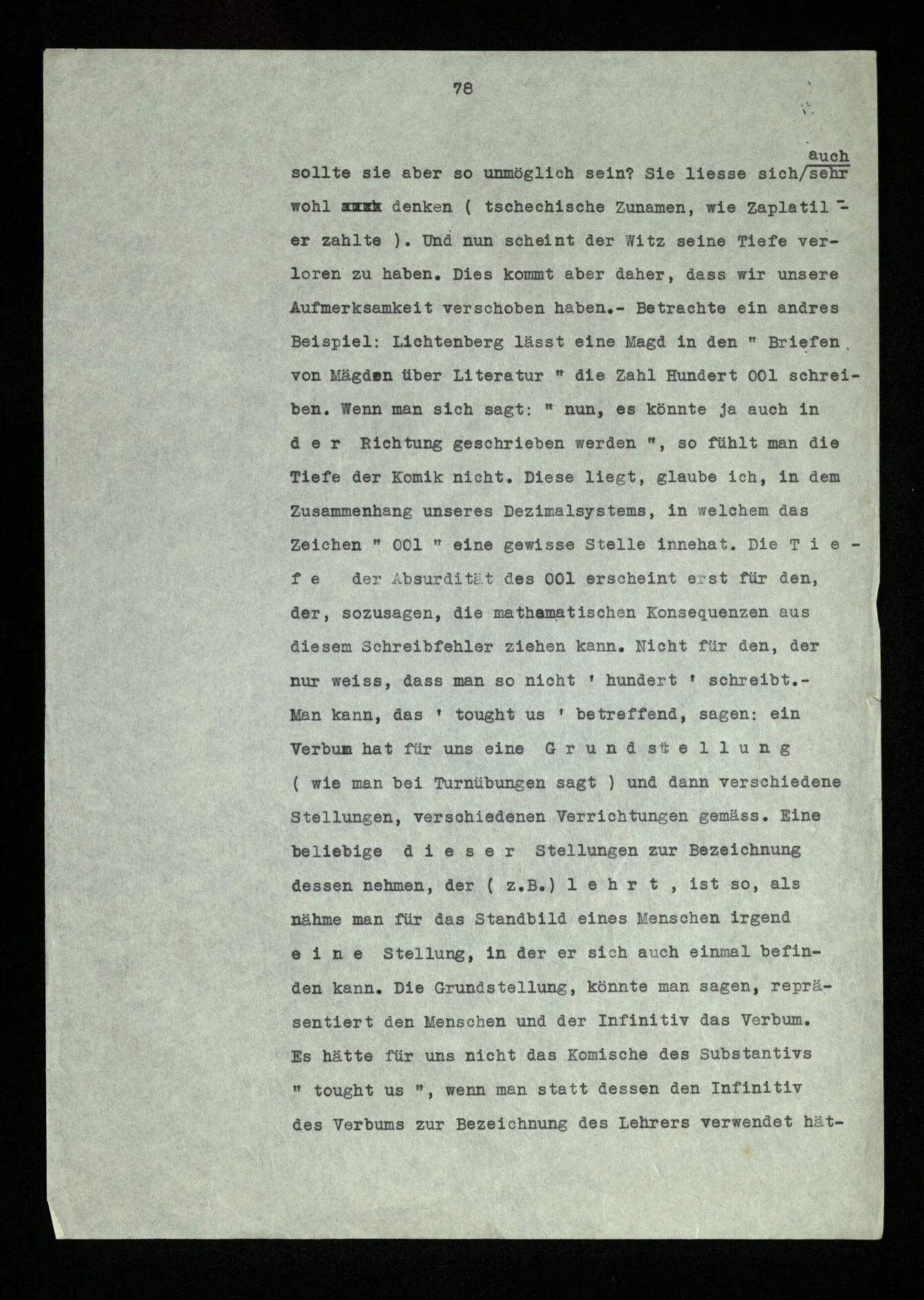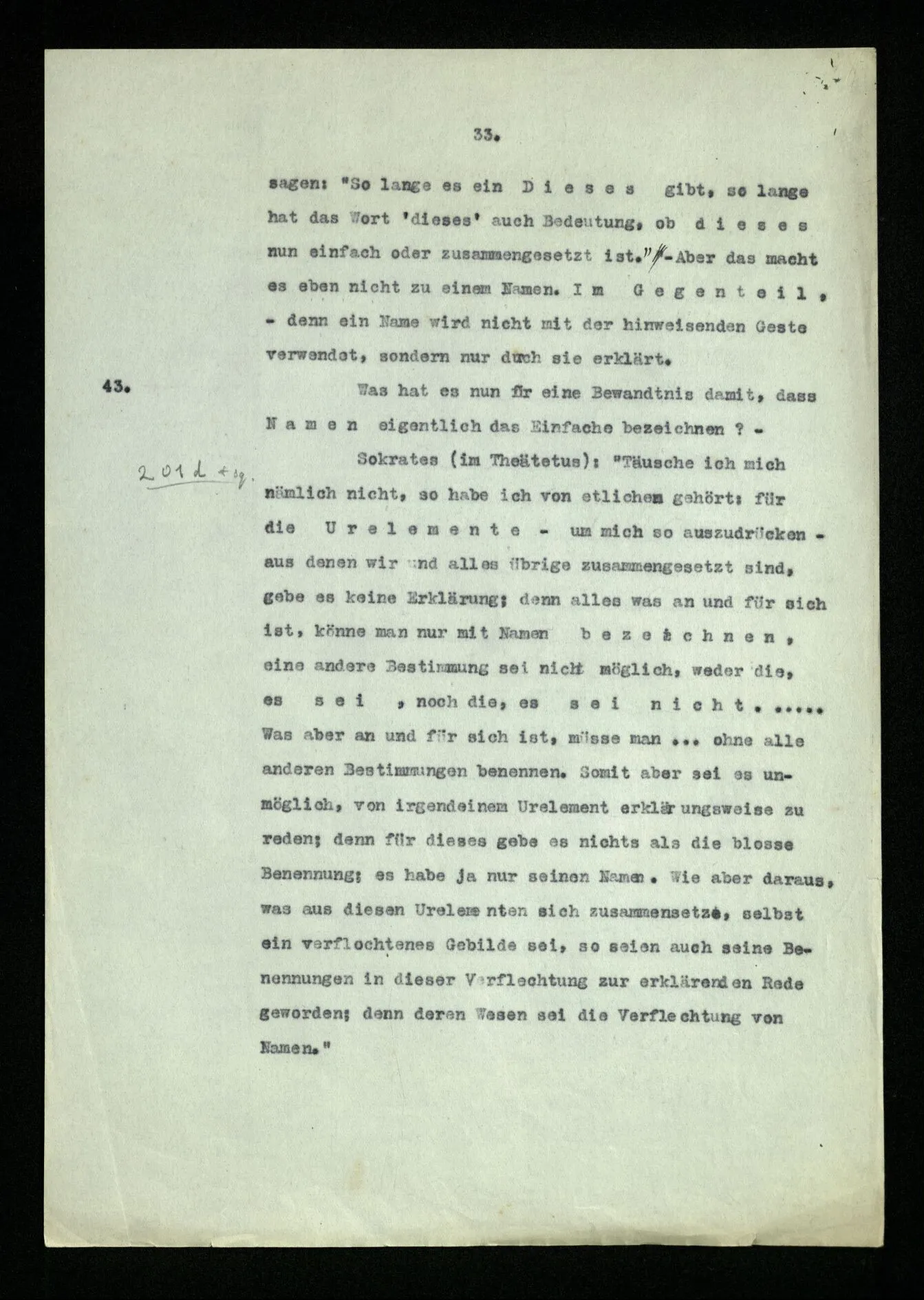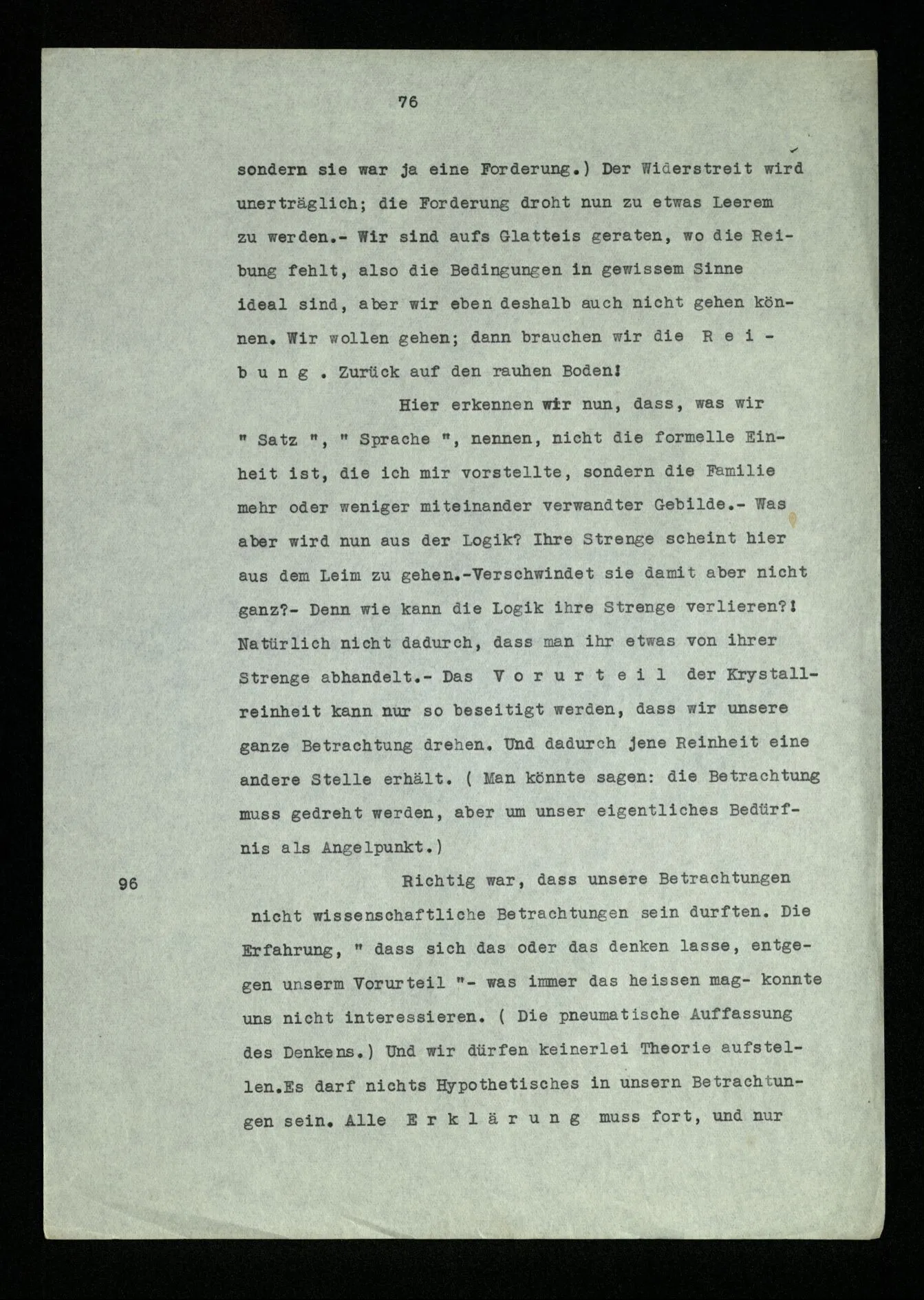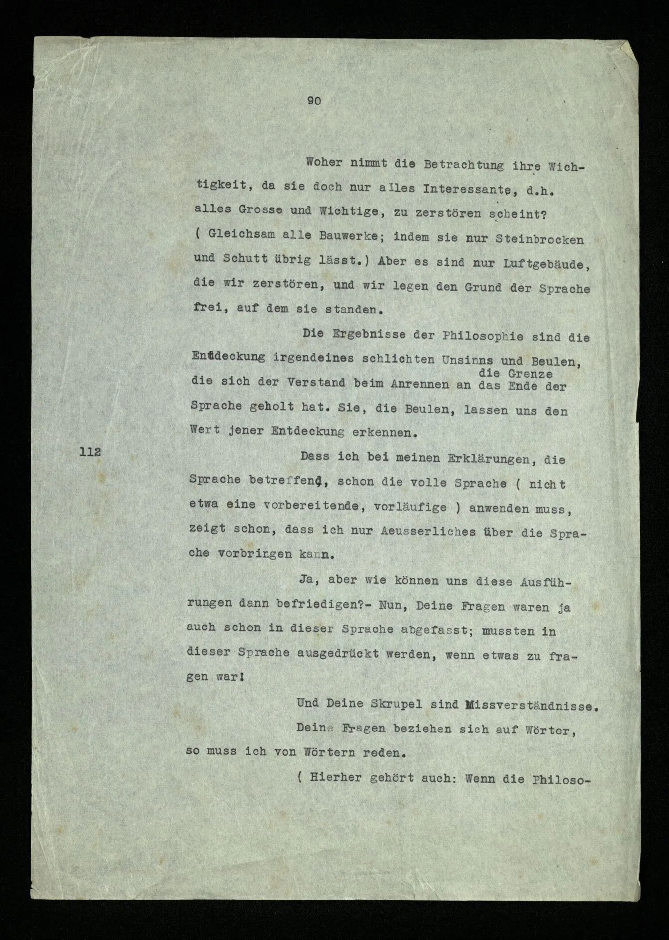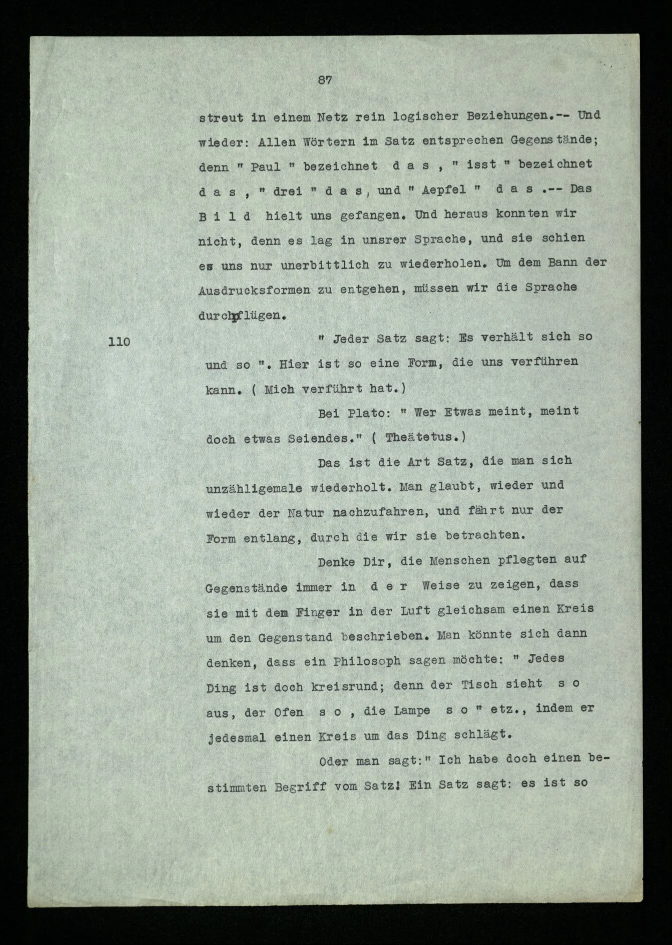 22. Man hat freilich das Recht ein Behauptungszeichen zu verwenden im Gegensatz z.B. zu einem Fragezeichen. Irrig ist es nur, wenn man meint, daß die Behauptung nun aus zwei Akten besteht, dem Erwägen und dem Behaupten (Beilegen des Wahrheitswerts, oder dergleichen) und daß wir diese Akte nach den Zeichen des Satzes vollziehen, ungefähr wie wir nach Noten singen. Mit dem Singen nach Noten ist allerdings das laute, oder leise, Lesen nach dem geschriebenen Satz zu vergleichen, aber nicht das ‘Meinen’ (Denken) des gelesenen Satzes.