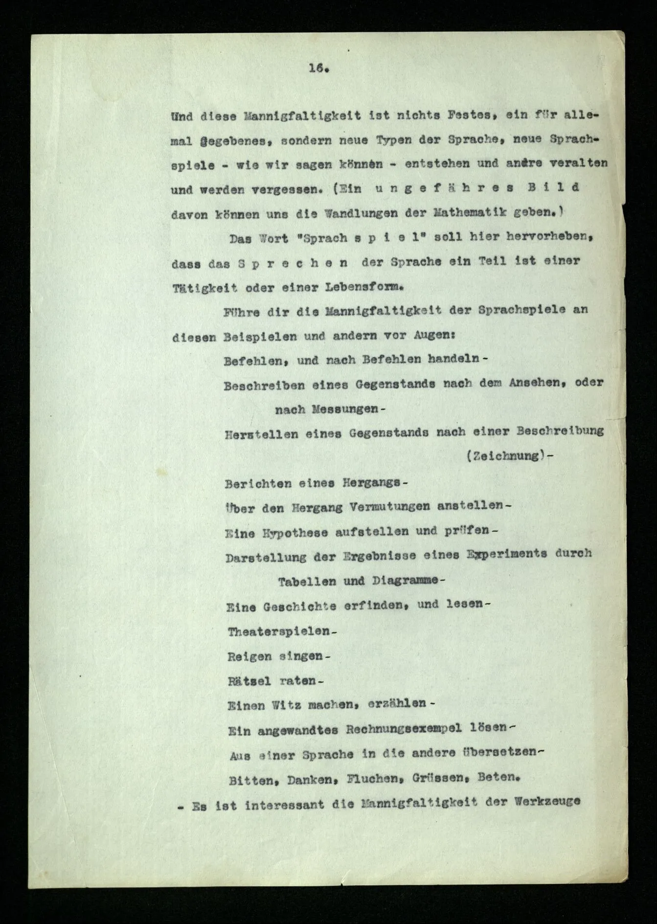 Bitten, Danken, Fluchen, Grüßen, Beten. – Es ist interessant die Mannigfaltigkeit der Werkzeuge der Sprache und ihrer Verwendungsweisen – die Mannigfaltigkeit der Wort- und Satzarten – mit dem zu vergleichen, was Logiker über den Bau der Sprache gesagt haben. (Und auch der Verfasser der Log. Phil. Abh..)