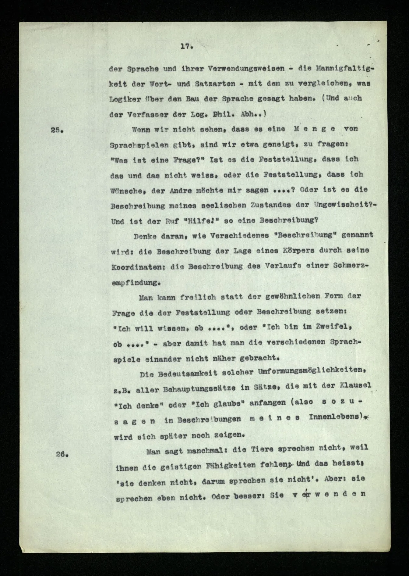 25. Wenn wir nicht sehen, daß es eine Menge von Sprachspielen gibt, sind wir etwa geneigt, zu fragen: “Was ist eine Frage?” Ist es die Feststellung, daß ich das und das nicht weiß, oder die Feststellung, daß ich wünsche, der Andre möchte mir sagen …? Oder ist es die Beschreibung meines seelischen Zustandes der Ungewißheit? – Und ist der Ruf “Hilfe!” so eine Beschreibung? Denke daran, wie Verschiedenes “Beschreibung” genannt wird: die Beschreibung der Lage eines Körpers durch seine Koordinaten: die Beschreibung des Verlaufs einer Schmerzempfindung. Man kann freilich statt der gewöhnlichen Form der Frage die der Feststellung oder Beschreibung setzen: “Ich will wissen, ob …”, oder “Ich bin im Zweifel, ob …” – aber damit hat man die verschiedenen Sprachspiele einander nicht näher gebracht. Die Bedeutsamkeit solcher Umformungsmöglichkeiten, z.B. aller Behauptungssätze in Sätze, die mit der Klausel “Ich denke” oder “Ich glaube” anfangen (also sozusagen in Beschreibungen meines Innenlebens) wird sich später noch zeigen.