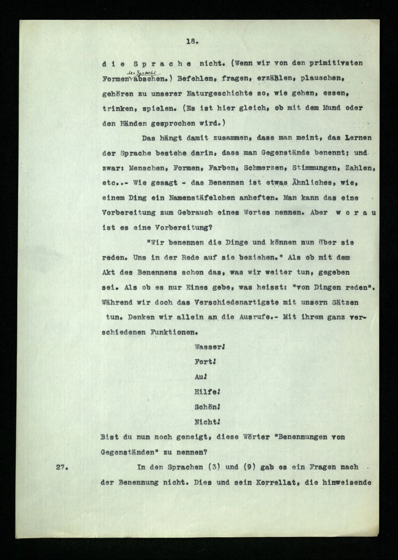 26. Man sagt manchmal: die Tiere sprechen nicht, weil ihnen die geistigen Fähigkeiten fehlen und das heißt; ‘sie denken nicht, darum sprechen sie nicht’. Aber: sie sprechen eben nicht. Oder besser: Sie verwenden die Sprache nicht. (Wenn wir von den primitivsten Formen der Sprache absehen.) Befehlen, fragen, erzählen, plauschen, gehören zu unserer Naturgeschichte so, wie gehen, essen, trinken, spielen. (Es ist hier gleich, ob mit dem Mund oder den Händen gesprochen wird.) Das hängt damit zusammen, daß man meint, das Lernen der Sprache bestehe darin, daß man Gegenstände benennt; und zwar: Menschen, Formen, Farben, Schmerzen, Stimmungen, Zahlen, etc..– Wie gesagt – das Benennen ist etwas Ähnliches, wie, einem Ding ein Namenstäfelchen anheften. Man kann das eine Vorbereitung zum Gebrauch eines Wortes nennen. Aber worauf ist es eine Vorbereitung? “Wir benennen die Dinge und können nun über sie reden. Uns in der Rede auf sie beziehen.” Als ob mit dem Akt des Benennens schon das, was wir weiter tun, gegeben sei. Als ob es nur Eines gebe, was heißt: “von Dingen reden”. Während wir doch das Verschiedenartigste mit unsern Sätzen tun. Denken wir allein an die Ausrufe. – Mit ihrem ganz verschiedenen Funktionen. Wasser! Fort! Au! Hilfe! Schön! Nicht! Bist du nun noch geneigt, diese Wörter “Benennungen von Gegenständen” zu nennen?