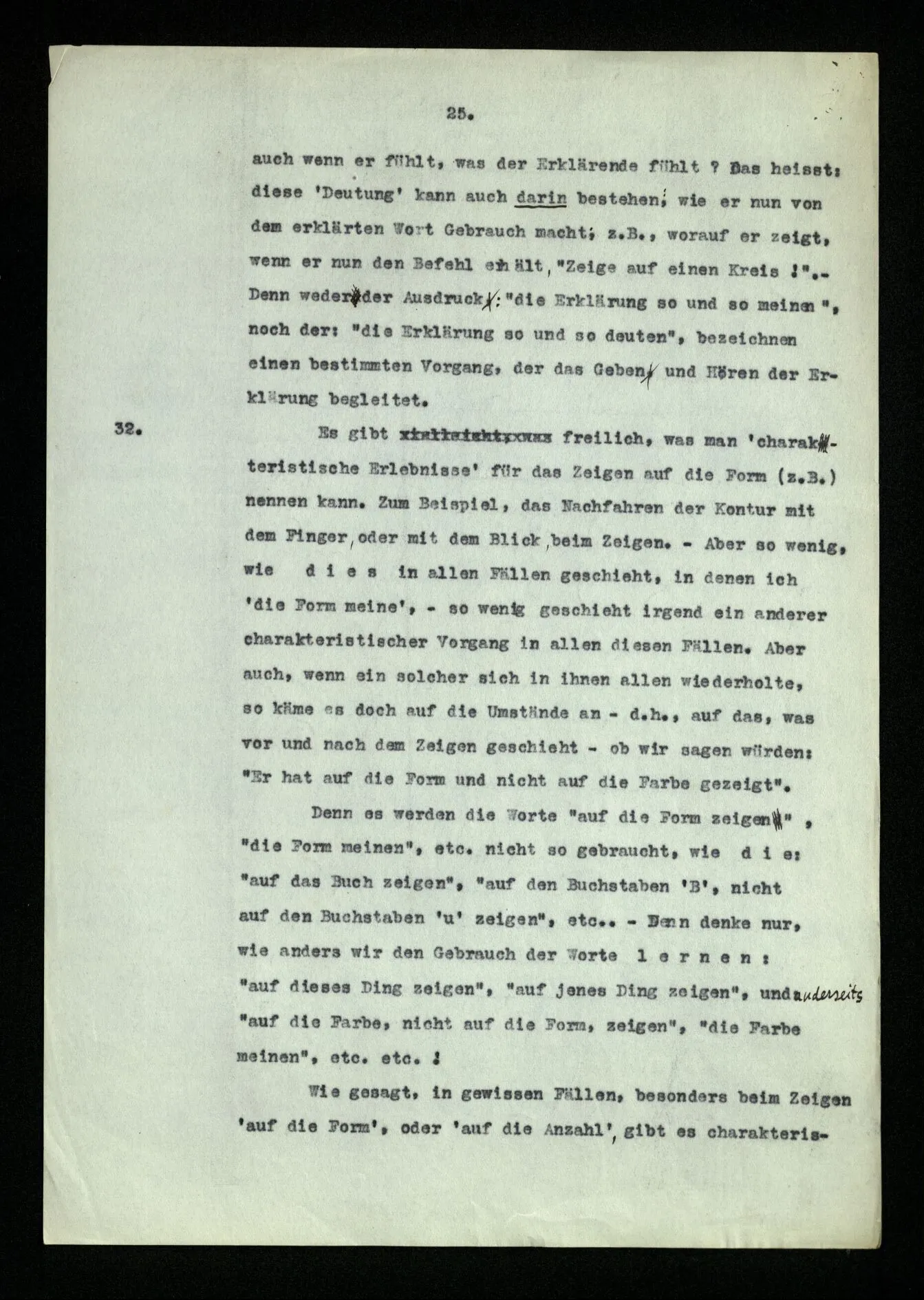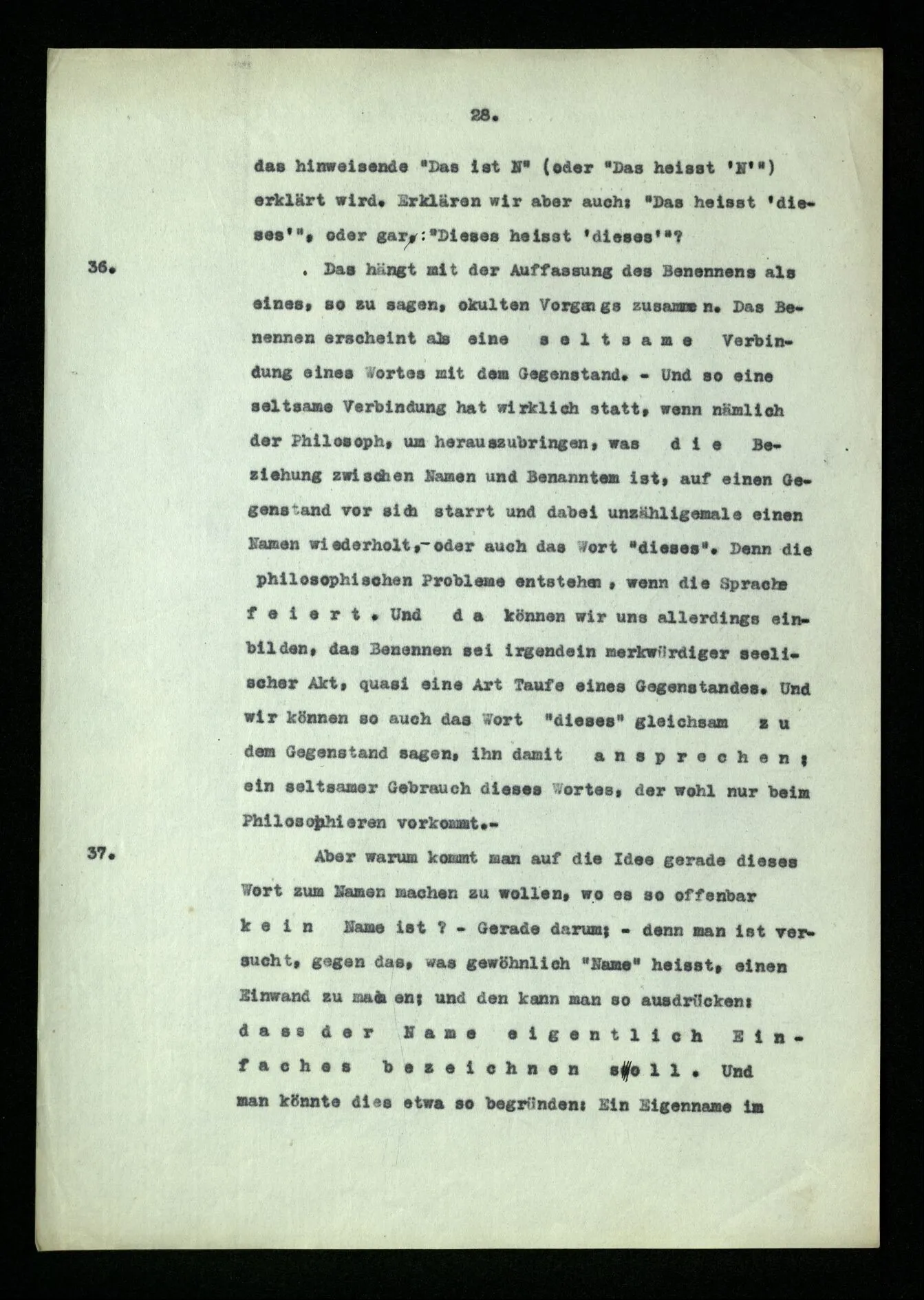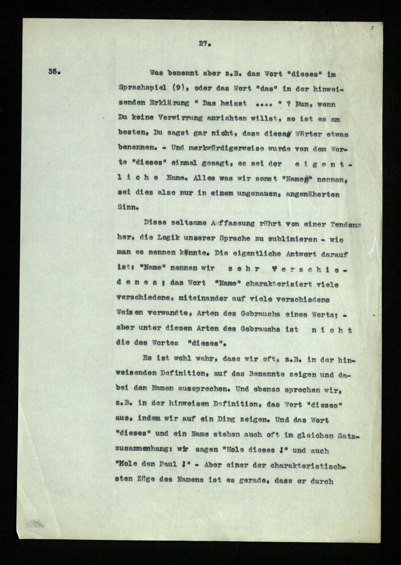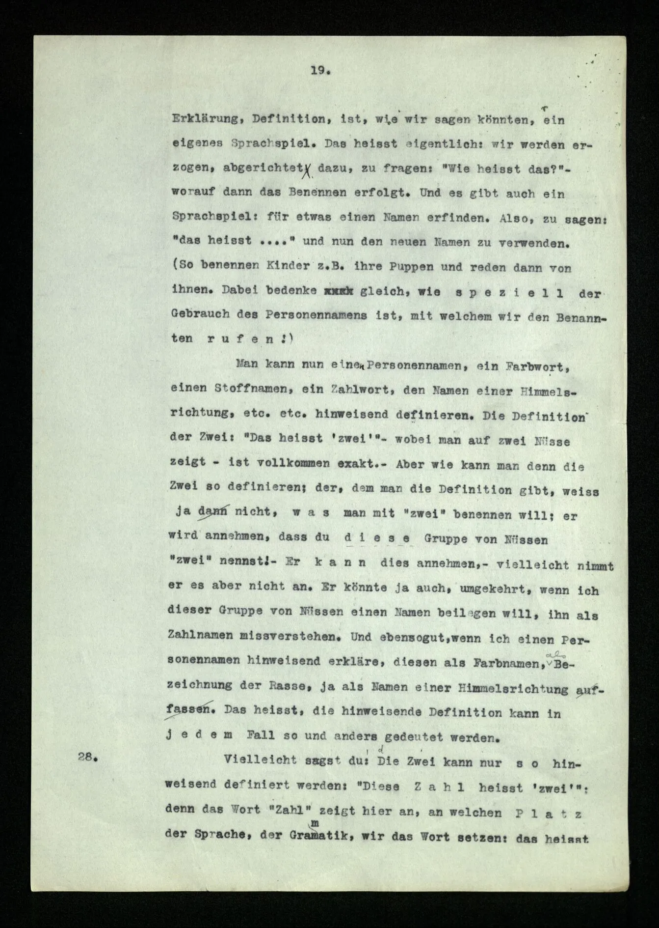 27. In den Sprachen (3) und (9) gab es ein Fragen nach der Benennung nicht. Dies und sein Korrelat, die hinweisende Erklärung, Definition, ist, wie wir sagen könnten, ein eigenes Sprachspiel. Das heißt eigentlich: wir werden erzogen, abgerichtet dazu, zu fragen: “Wie heißt das?” – worauf dann das Benennen erfolgt. Und es gibt auch ein Sprachspiel: für etwas einen Namen erfinden. Also, zu sagen: “das heißt … und nun den neuen Namen zu verwenden. (So benennen Kinder z.B. ihre Puppen und reden dann von ihnen. Dabei bedenke gleich, wie speziell der Gebrauch des Personennamens ist, mit welchem wir den Benannten rufen!) Man kann nun einen Personennamen, ein Farbwort, einen Stoffnamen, ein Zahlwort, den Namen einer Himmelsrichtung, etc. etc. hinweisend definieren. Die Definition der Zwei: “Das heißt ‘zwei’” – wobei man auf zwei Nüsse zeigt – ist vollkommen exakt. – Aber wie kann man denn die Zwei so definieren; der, dem man die Definition gibt, weiß ja nicht, was man mit “zwei” benennen will; er wird annehmen, daß du diese Gruppe von Nüssen “zwei” nennst! – Er kann dies annehmen, – vielleicht nimmt er es aber nicht an. Er könnte ja auch, umgekehrt, wenn ich dieser Gruppe von Nüssen einen Namen beilegen will, ihn als Zahlnamen mißverstehen. Und ebensogut, wenn ich einen Personennamen hinweisend erkläre, diesen als Farbnamen, als Bezeichnung der Rasse, ja als Namen einer Himmelsrichtung. Das heißt, die hinweisende Definition kann in jedem Fall so und anders gedeutet werden.