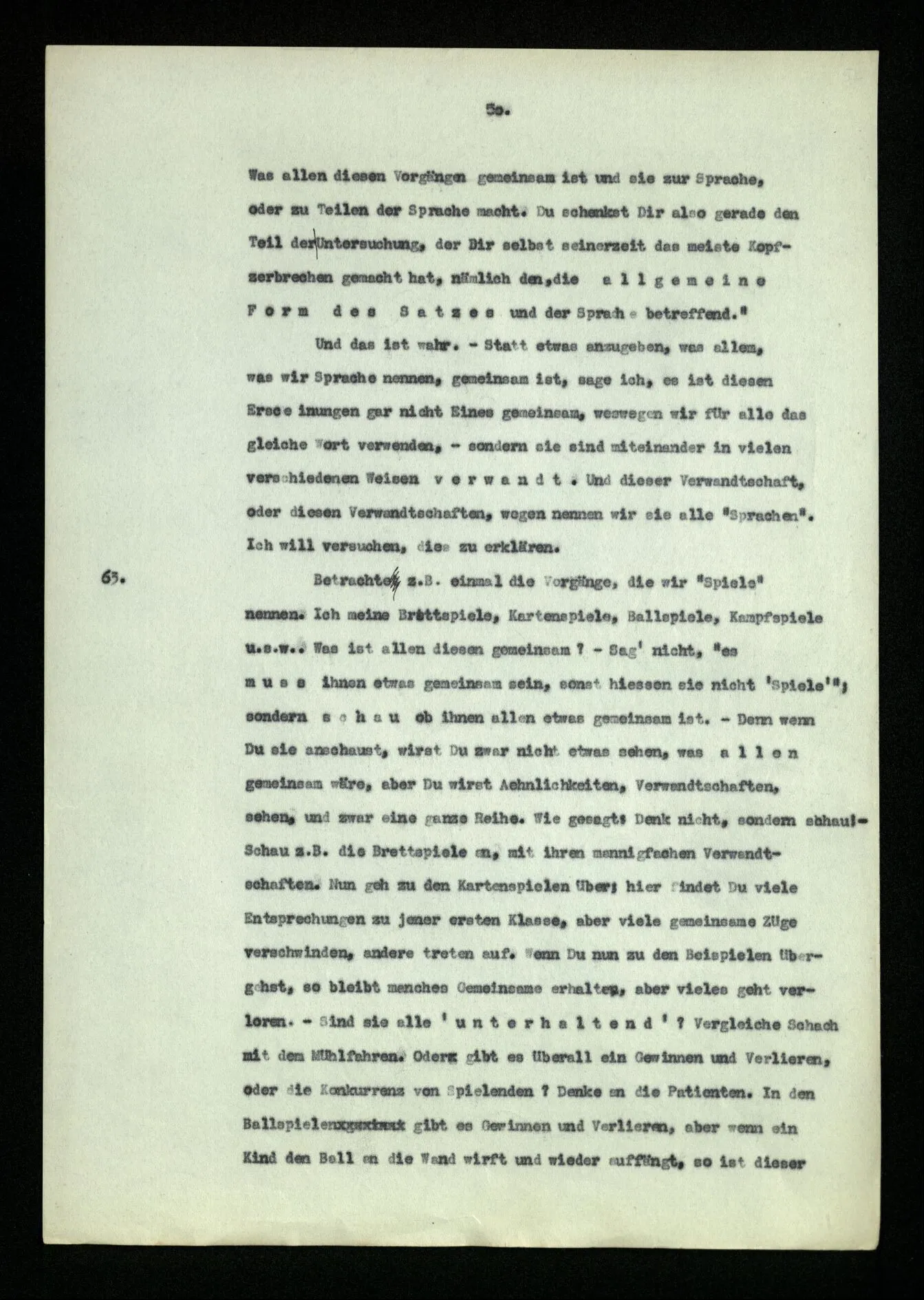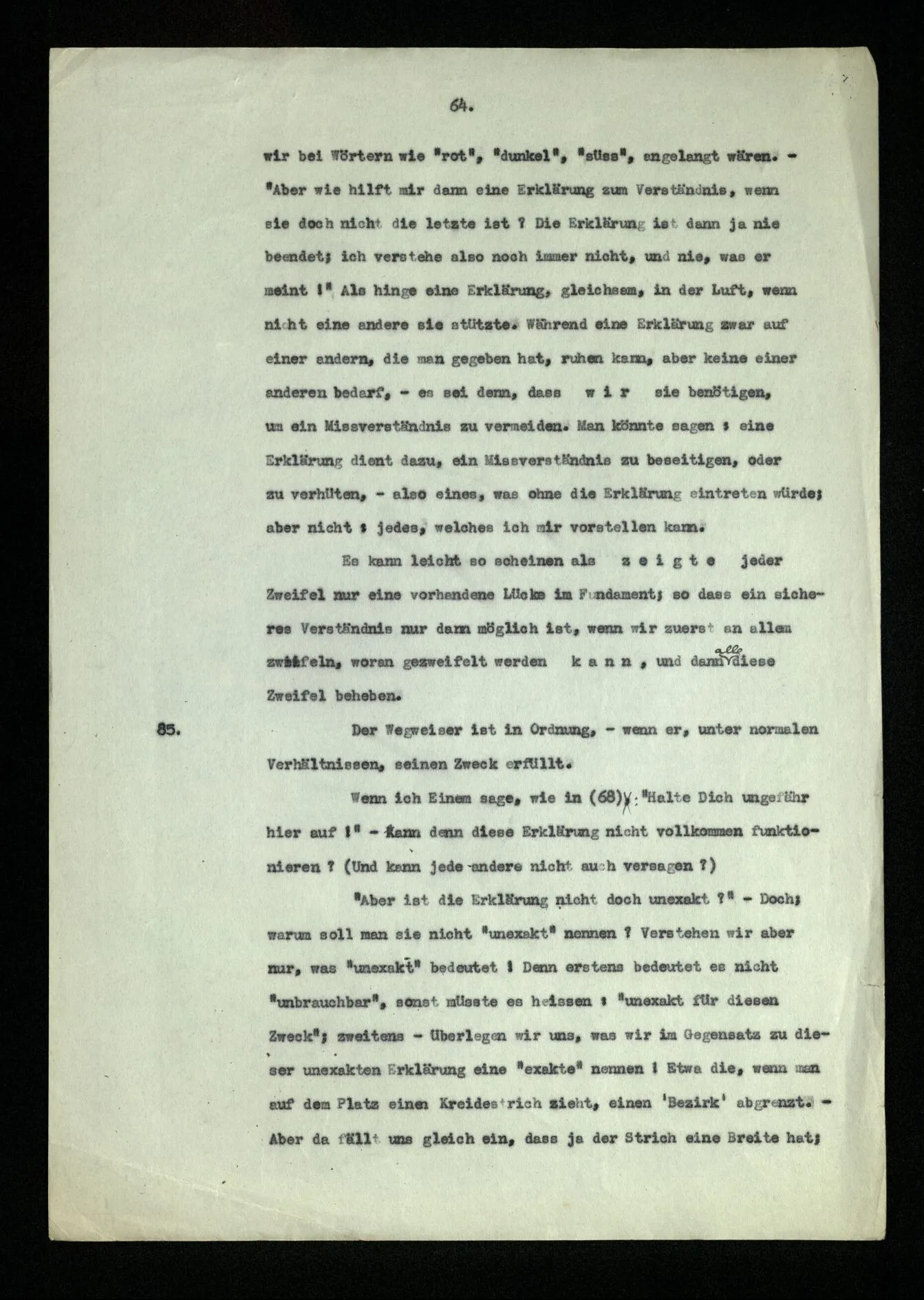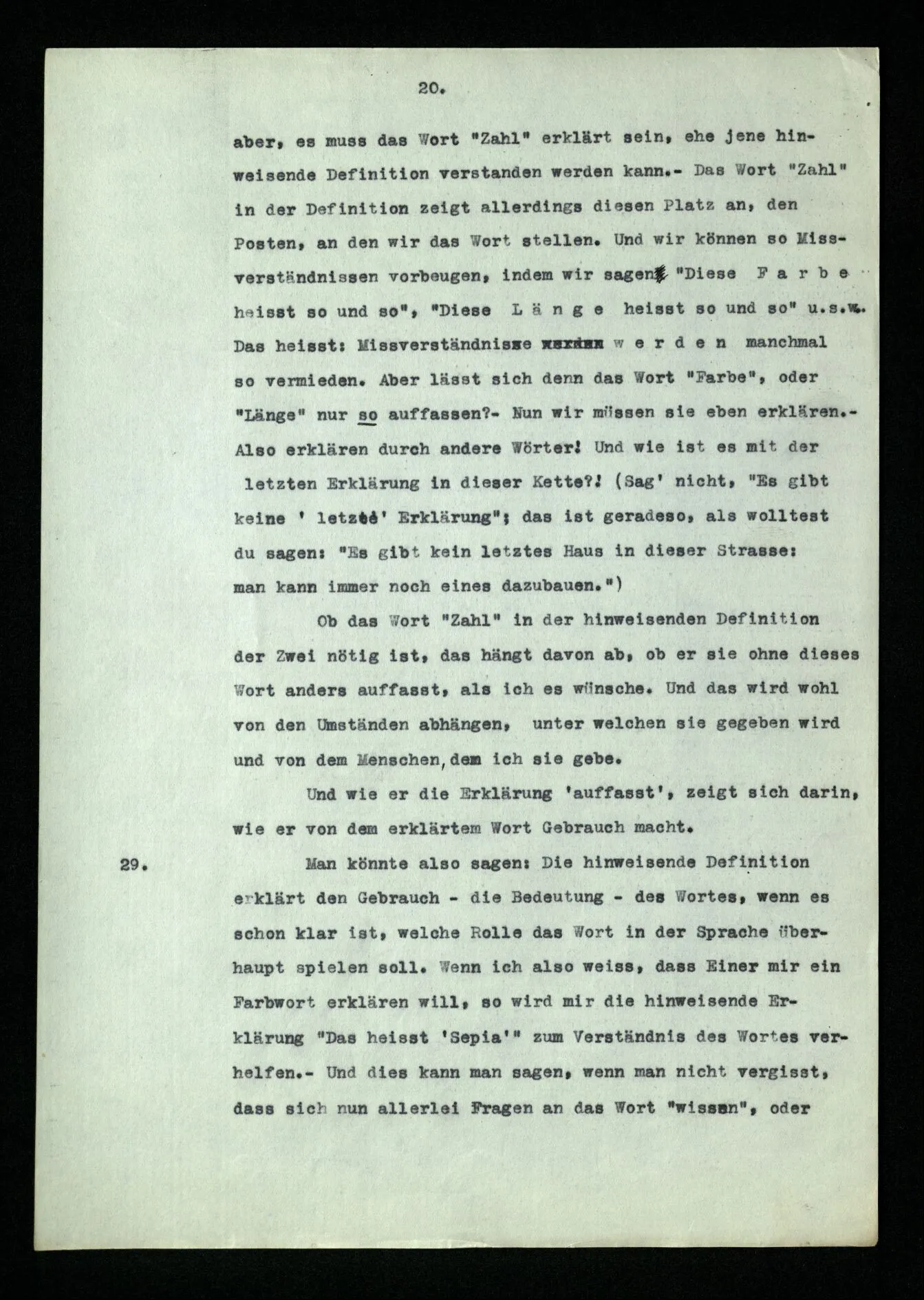28. Vielleicht sagst du: Die Zwei kann nur so hinweisend definiert werden: “Diese Zahl heißt ‘zwei’”: denn das Wort “Zahl” zeigt hier an, an welchen Platz der Sprache, der Grammatik, wir das Wort setzen: das heißt aber, es muß das Wort “Zahl” erklärt sein, ehe jene hinweisende Definition verstanden werden kann. – Das Wort “Zahl” in der Definition zeigt allerdings diesen Platz an, den Posten, an den wir das Wort stellen. Und wir können so Mißverständnissen vorbeugen, indem wir sagen “Diese Farbe heißt so und so”, “Diese Länge heißt so und so” u.s.w.. Das heißt: Mißverständnisse werden manchmal so vermieden. Aber läßt sich denn das Wort “Farbe”, oder “Länge” nur so auffassen? – Nun wir müssen sie eben erklären. – Also erklären durch andere Wörter! Und wie ist es mit der letzten Erklärung in dieser Kette?! (Sag’ nicht, “Es gibt keine ‘letzte’ Erklärung”; das ist geradeso, als wolltest du sagen: “Es gibt kein letztes Haus in dieser Straße: man kann immer noch eines dazubauen.”) Ob das Wort “Zahl” in der hinweisenden Definition der Zwei nötig ist, das hängt davon ab, ob er sie ohne dieses Wort anders auffaßt, als ich es wünsche. Und das wird wohl von den Umständen abhängen, unter welchen sie gegeben wird und von dem Menschen, dem ich sie gebe. Und wie er die Erklärung ‘auffaßt’, zeigt sich darin, wie er von dem erklärten Wort Gebrauch macht.