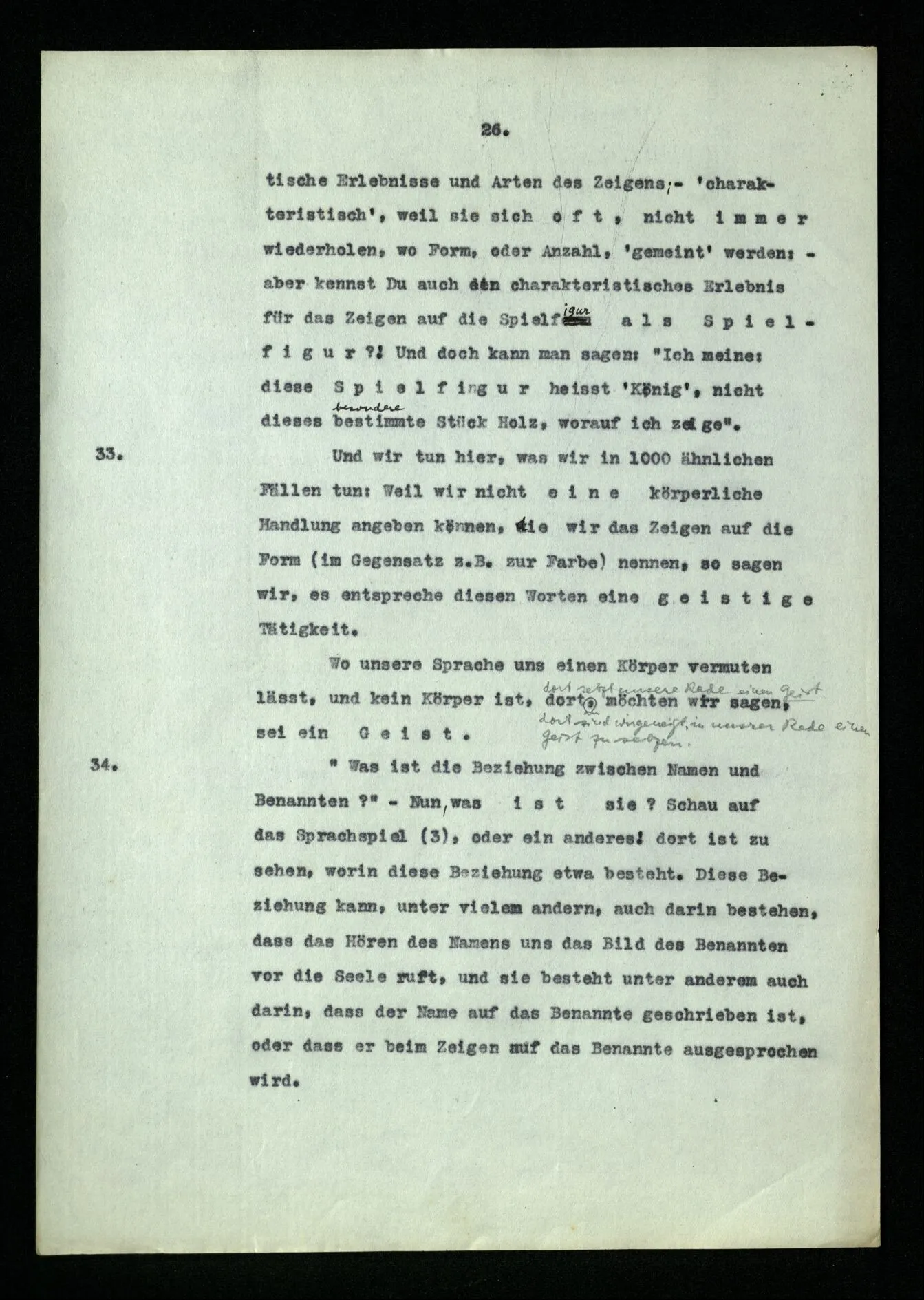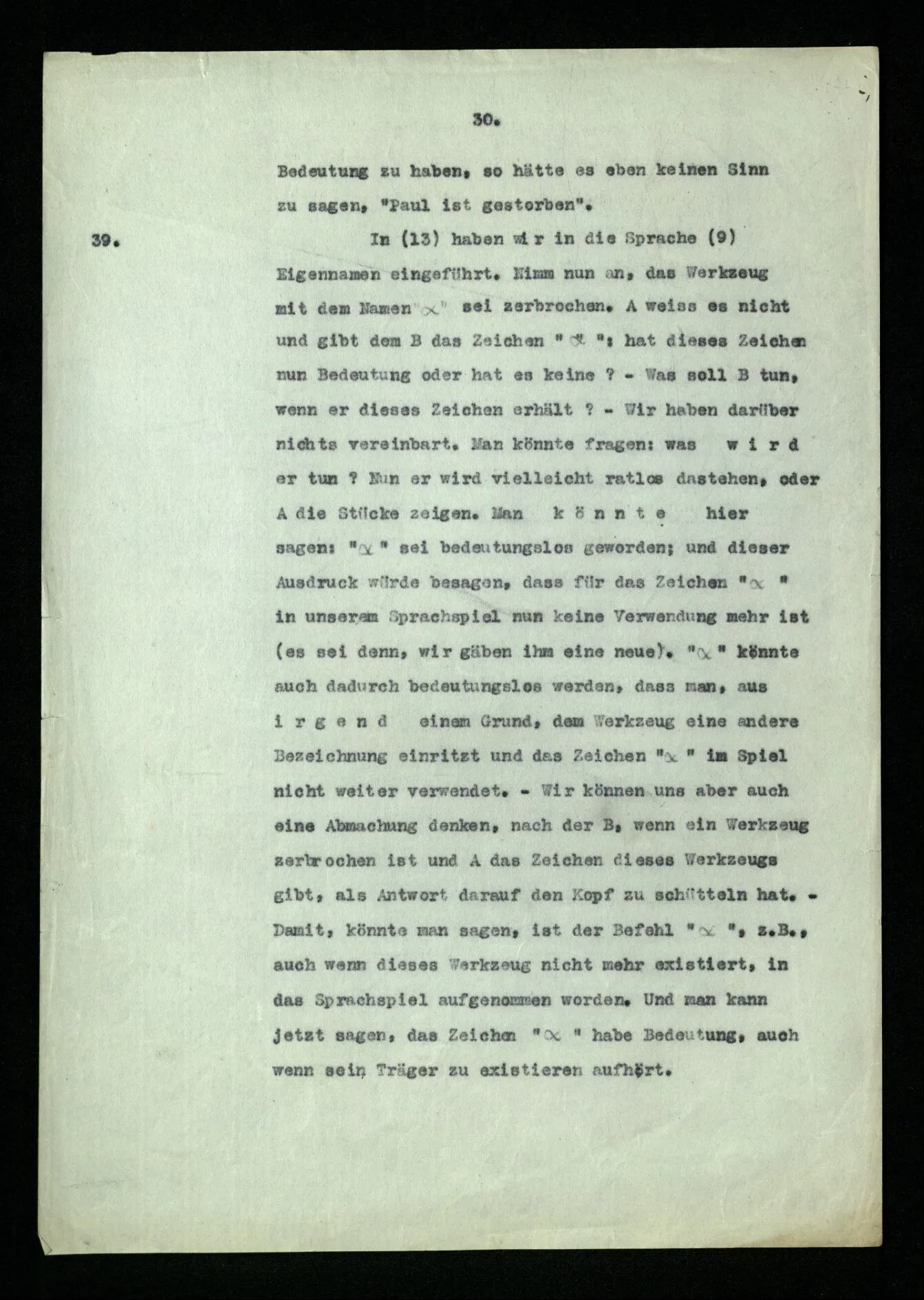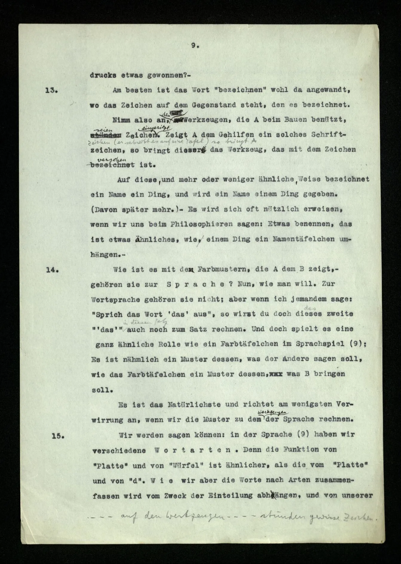 13. Am besten ist das Wort “bezeichnen” wohl da angewandt, wo das Zeichen auf dem Gegenstand steht, den es bezeichnet. Nimm also an, den Werkzeugen, die A beim Bauen benützt, seien Zeichen eingeritzt. Zeigt A dem Gehilfen ein solches Schriftzeichen, so bringt dieser das Werkzeug, das mit dem Zeichen versehen ist. Auf diese, und mehr oder weniger ähnliche, Weise bezeichnet ein Name ein Ding, und wird ein Name einem Ding gegeben. (Davon später mehr.) – Es wird sich oft nützlich erweisen, wenn wir uns beim Philosophieren sagen: Etwas benennen, das ist etwas Ähnliches, wie einem Ding ein Namentäfelchen umhängen. –