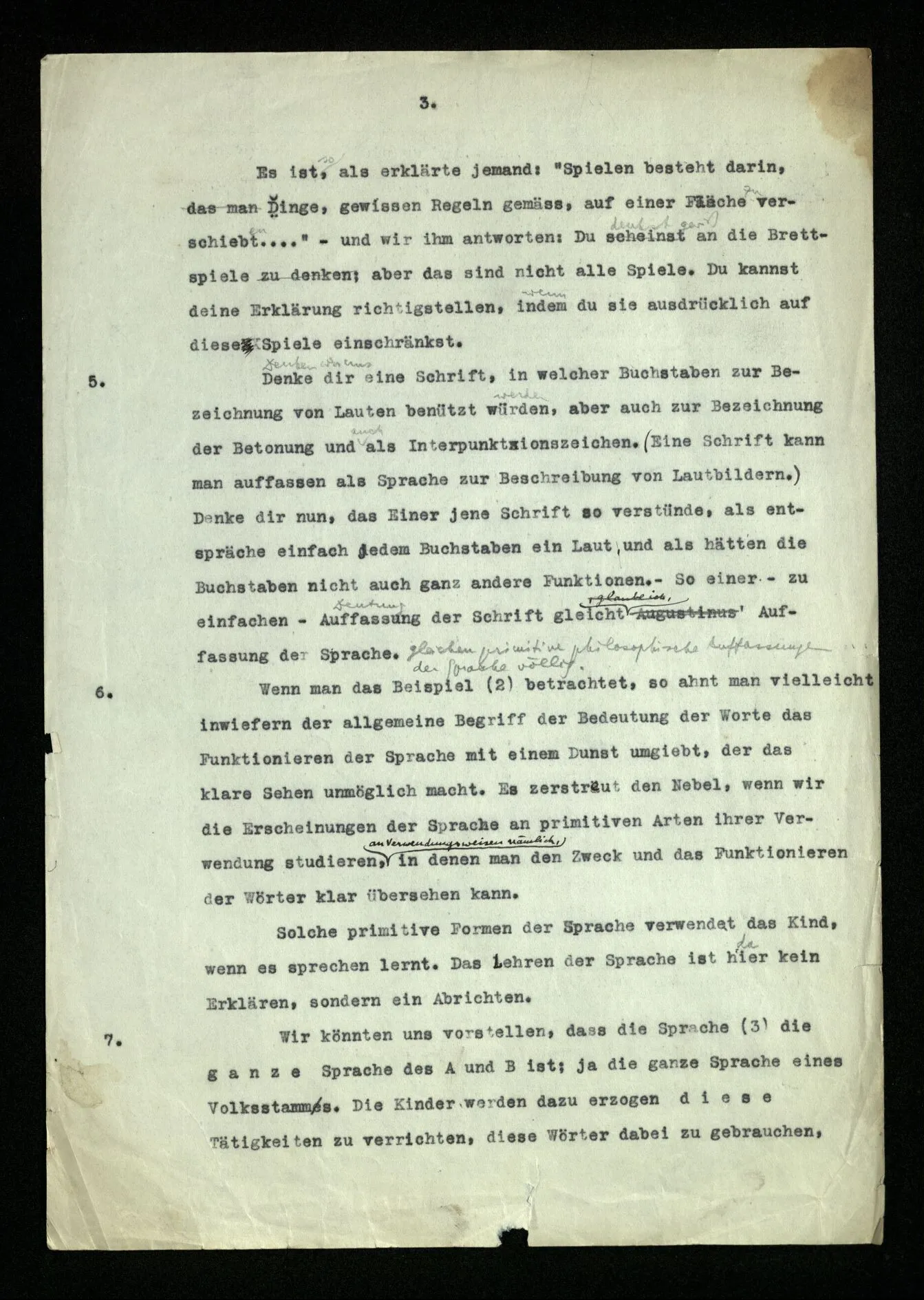 3. Jener philosophische Begriff der Bedeutung ist in einer primitiven Vorstellung, von der Art und Weise, wie die Sprache funktioniert, zu Hause. Man kann aber auch sagen, es sei die Vorstellung einer primitiveren Sprache, als der unsern.