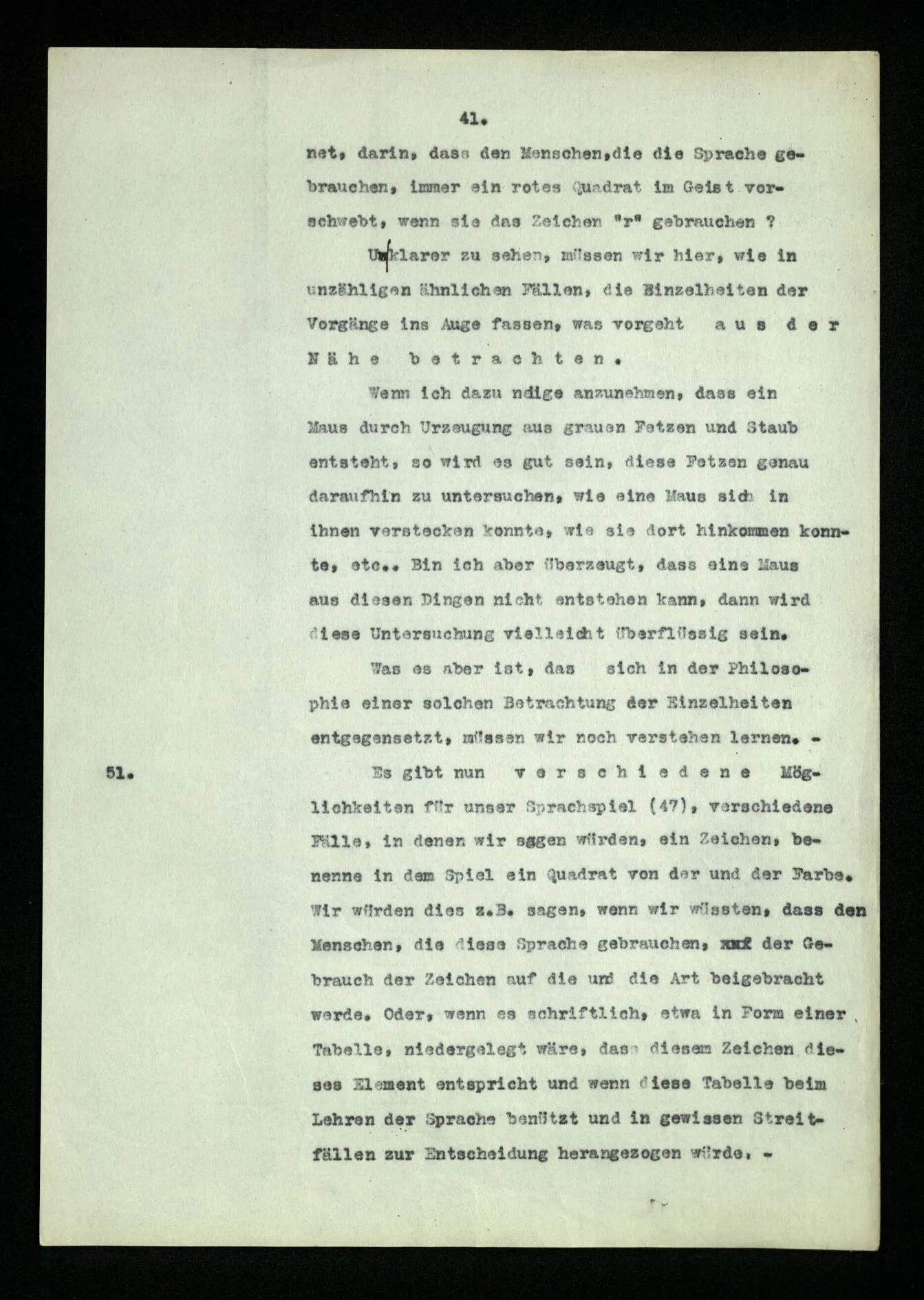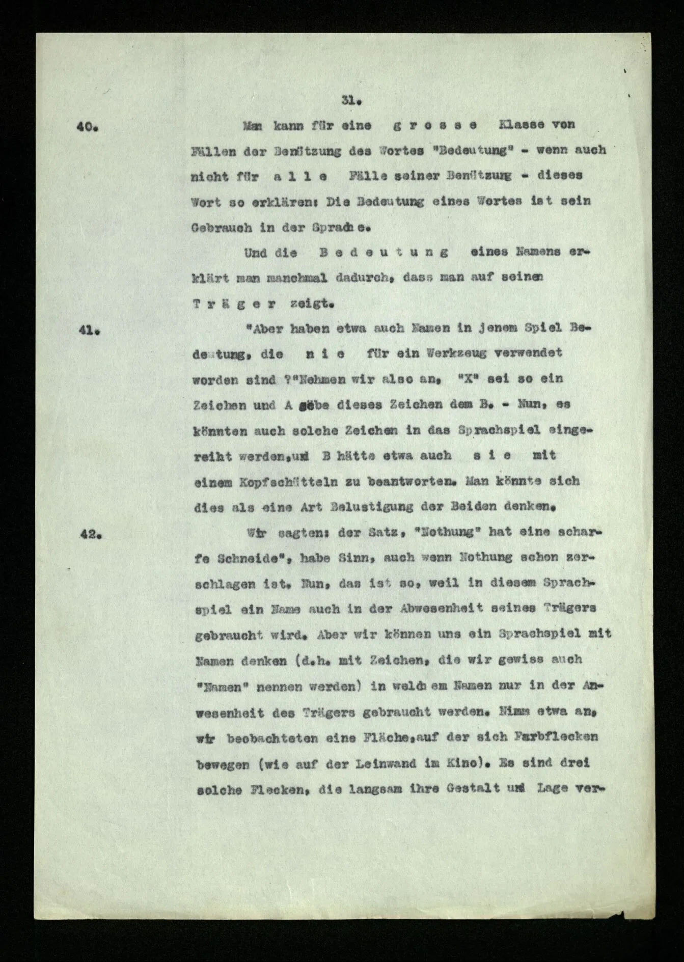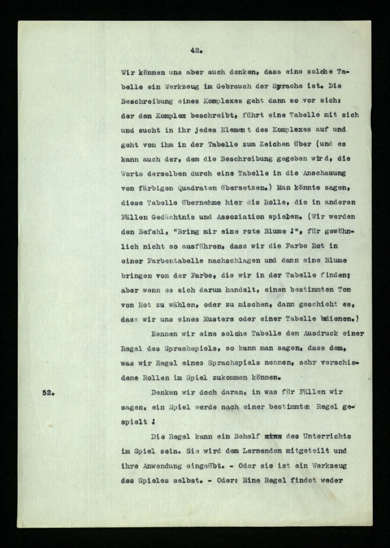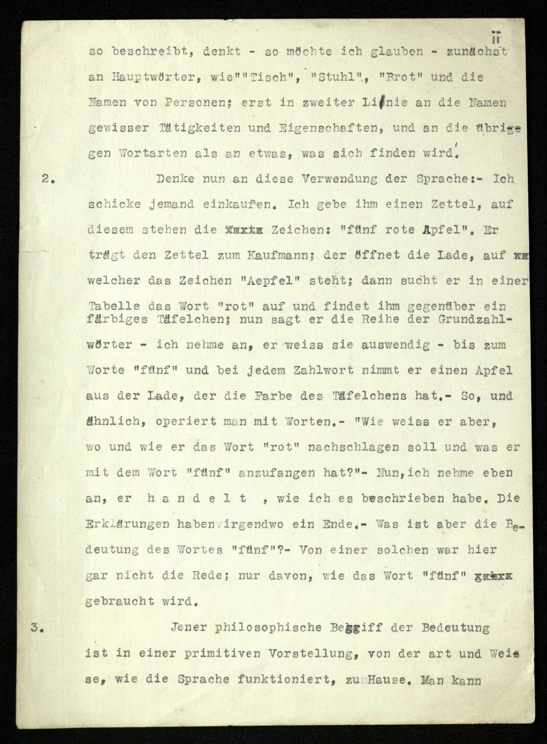 2. Denke nun an diese Verwendung der Sprache: – Ich schicke jemand einkaufen. Ich gebe ihm einen Zettel, auf diesem stehen die Zeichen: “fünf rote Äpfel”. Er trägt den Zettel zum Kaufmann; der öffnet die Lade, auf welcher das Zeichen “Äpfel” steht; dann sucht er in einer Tabelle das Wort “rot” auf und findet ihm gegenüber ein färbiges Täfelchen; nun sagt er die Reihe der Grundzahlwörter – ich nehme an, er weiß sie auswendig – bis zum Worte “fünf” und bei jedem Zahlwort nimmt er einen Apfel aus der Lade, der die Farbe des Täfelchens hat. – So, und ähnlich, operiert man mit Worten. – “Wie weiß er aber, wo und wie er das Wort “rot” nachschlagen soll und was er mit dem Wort “fünf” anzufangen hat?” – Nun, ich nehme eben an, er handelt, wie ich es beschrieben habe. Die Erklärungen haben irgendwo ein Ende. – Was ist aber die Bedeutung des Wortes “fünf”? – Von einer solchen war hier gar nicht die Rede; nur davon, wie das Wort “fünf” gebraucht wird.