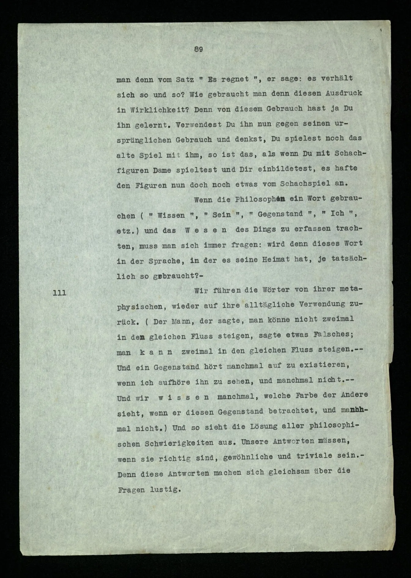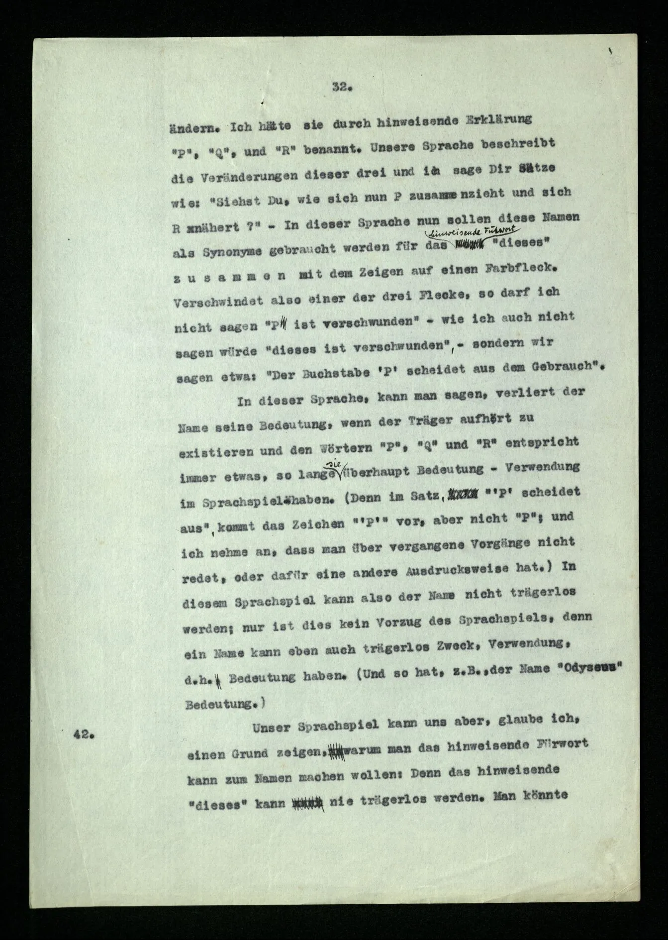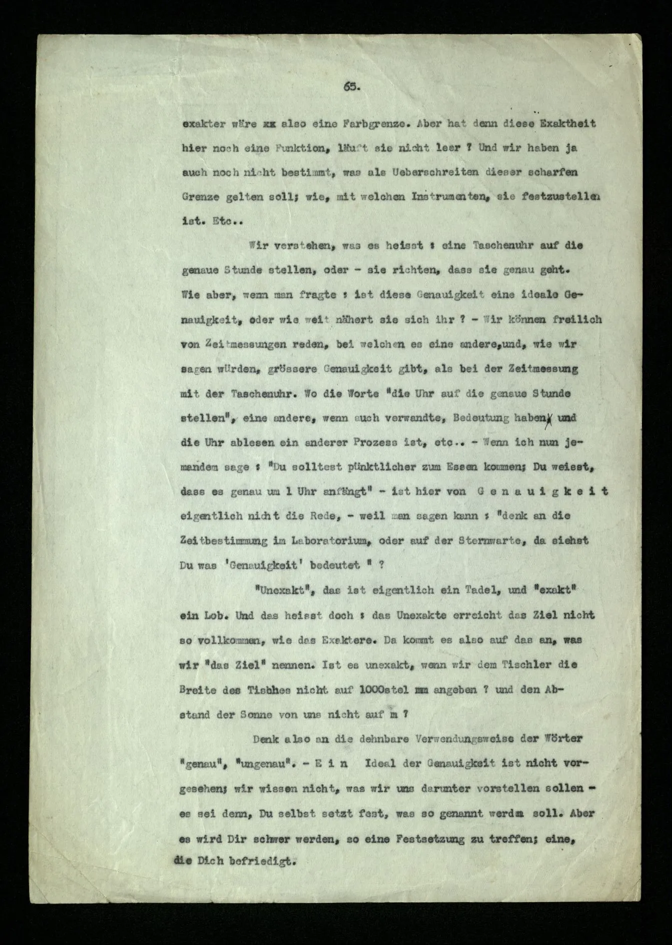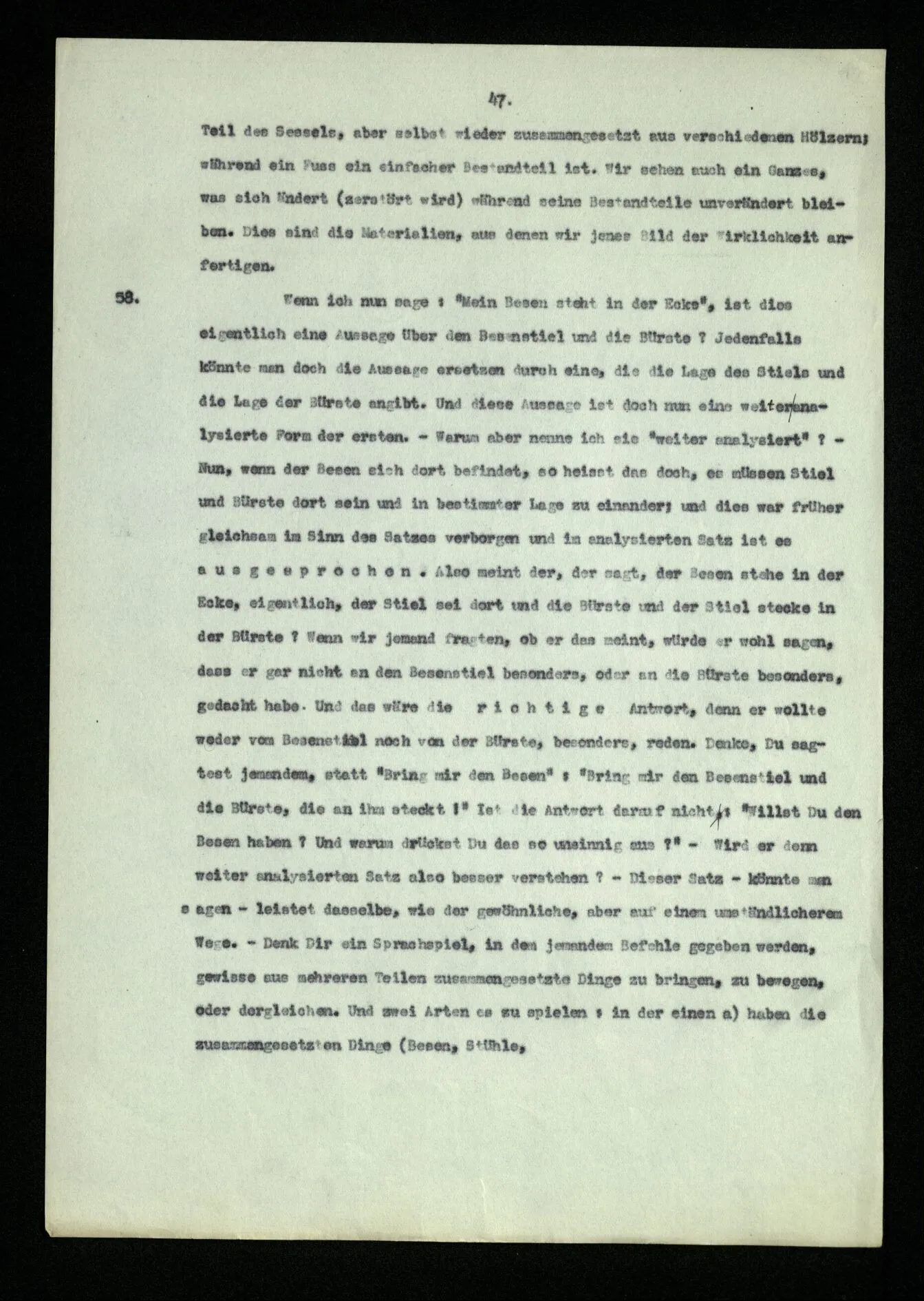 2. Denke nun an diese Verwendung der Sprache: – Ich schicke jemand einkaufen. Ich gebe ihm einen Zettel, auf diesem stehen die Zeichen: “fünf rote Äpfel”. Er trägt den Zettel zum Kaufmann; der öffnet die Lade, auf welcher das Zeichen “Äpfel” steht; dann sucht er in einer Tabelle das Wort “rot” auf und findet ihm gegenüber ein färbiges Täfelchen; nun sagt er die Reihe der Grundzahlwörter – ich nehme an, er weiß sie auswendig – bis zum Worte “fünf” und bei jedem Zahlwort nimmt er einen Apfel aus der Lade, der die Farbe des Täfelchens hat. – So, und ähnlich, operiert man mit Worten. – “Wie weiß er aber, wo und wie er das Wort “rot” nachschlagen soll und was er mit dem Wort “fünf” anzufangen hat?” – Nun, ich nehme eben an, er handelt, wie ich es beschrieben habe. Die Erklärungen haben irgendwo ein Ende. – Was ist aber die Bedeutung des Wortes “fünf”? – Von einer solchen war hier gar nicht die Rede; nur davon, wie das Wort “fünf” gebraucht wird.