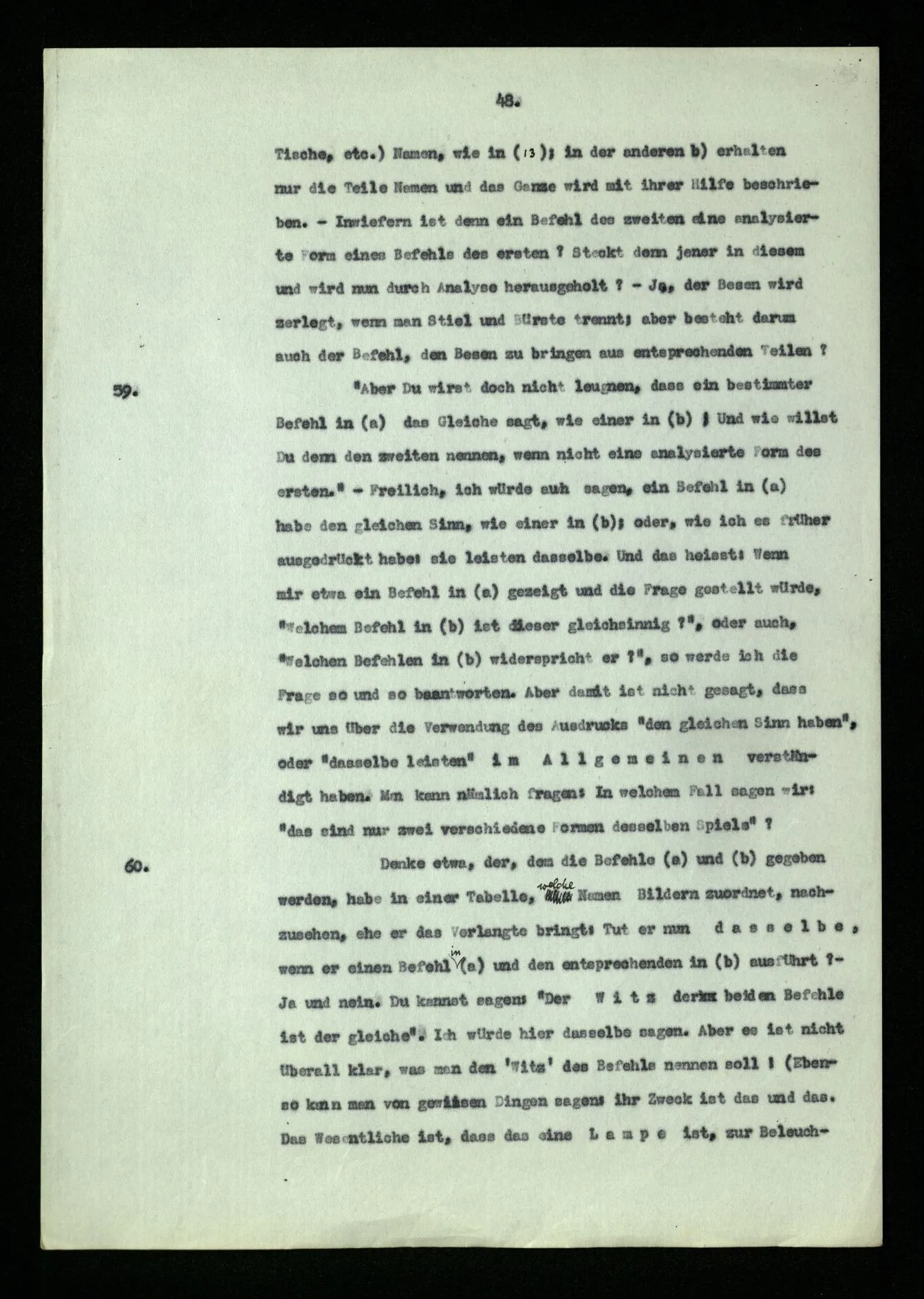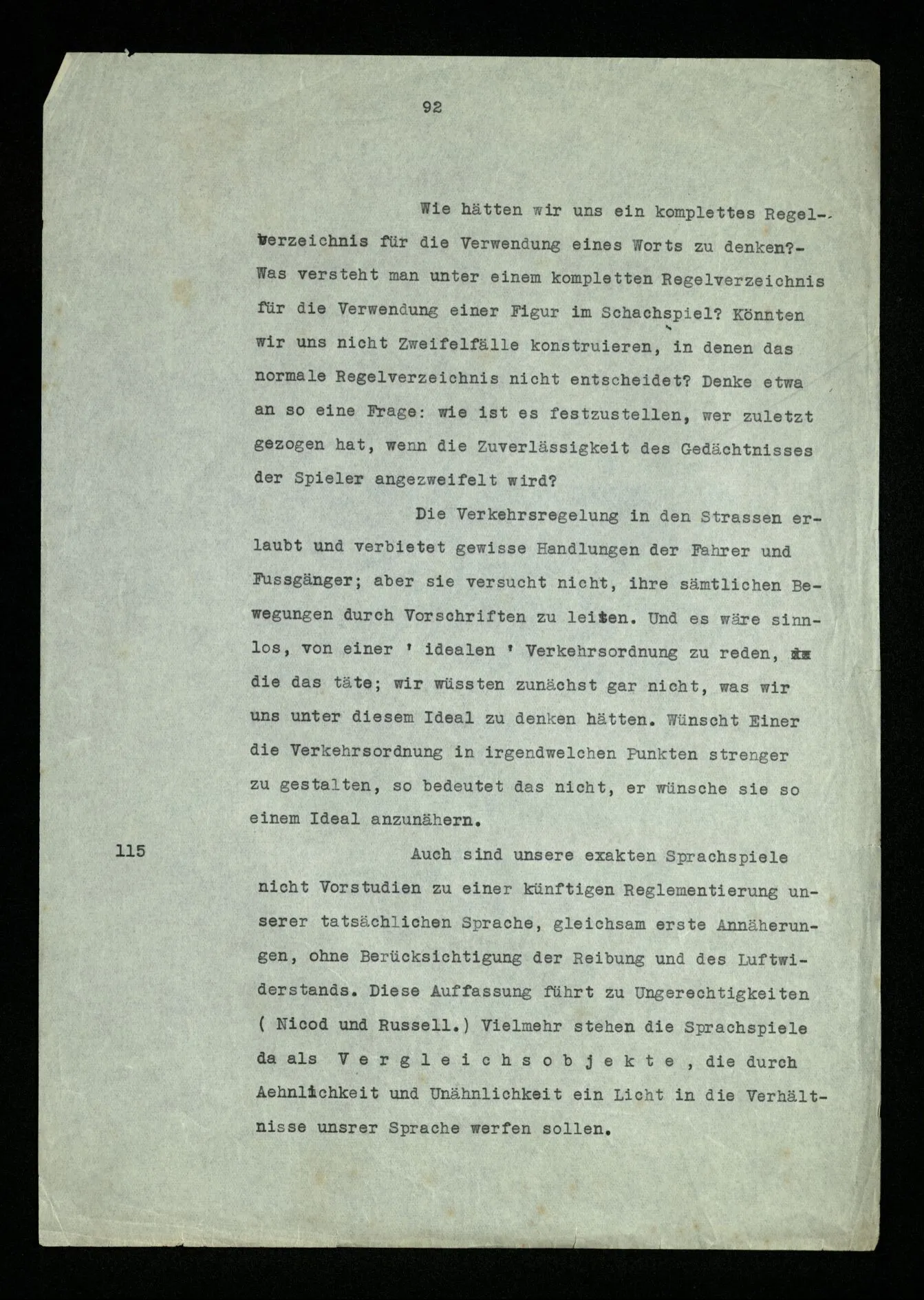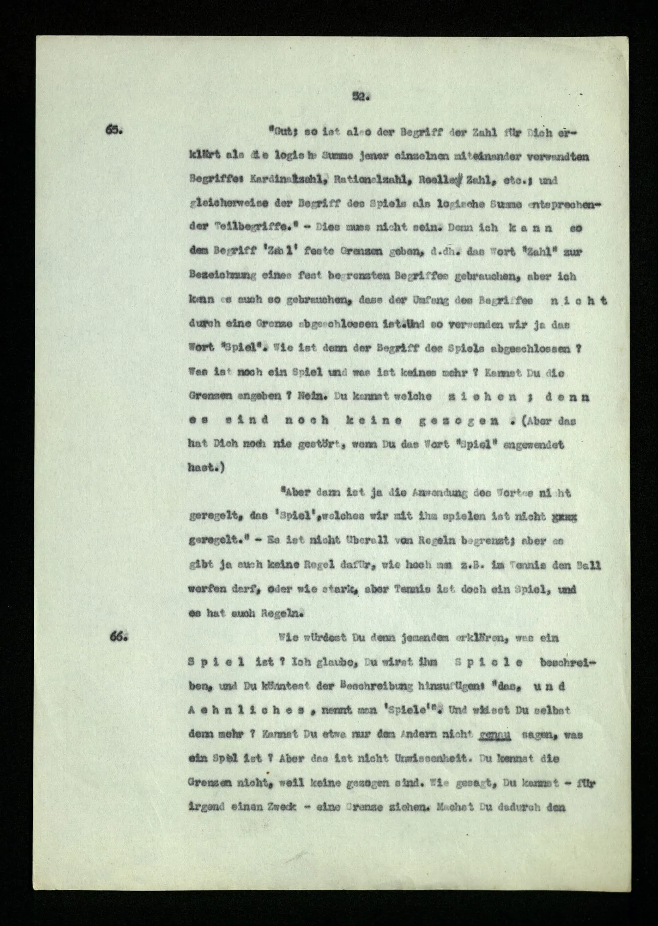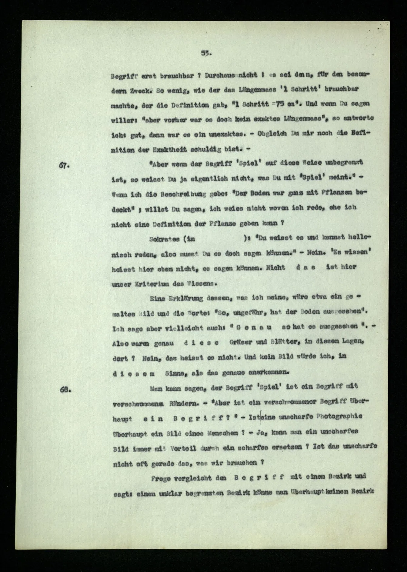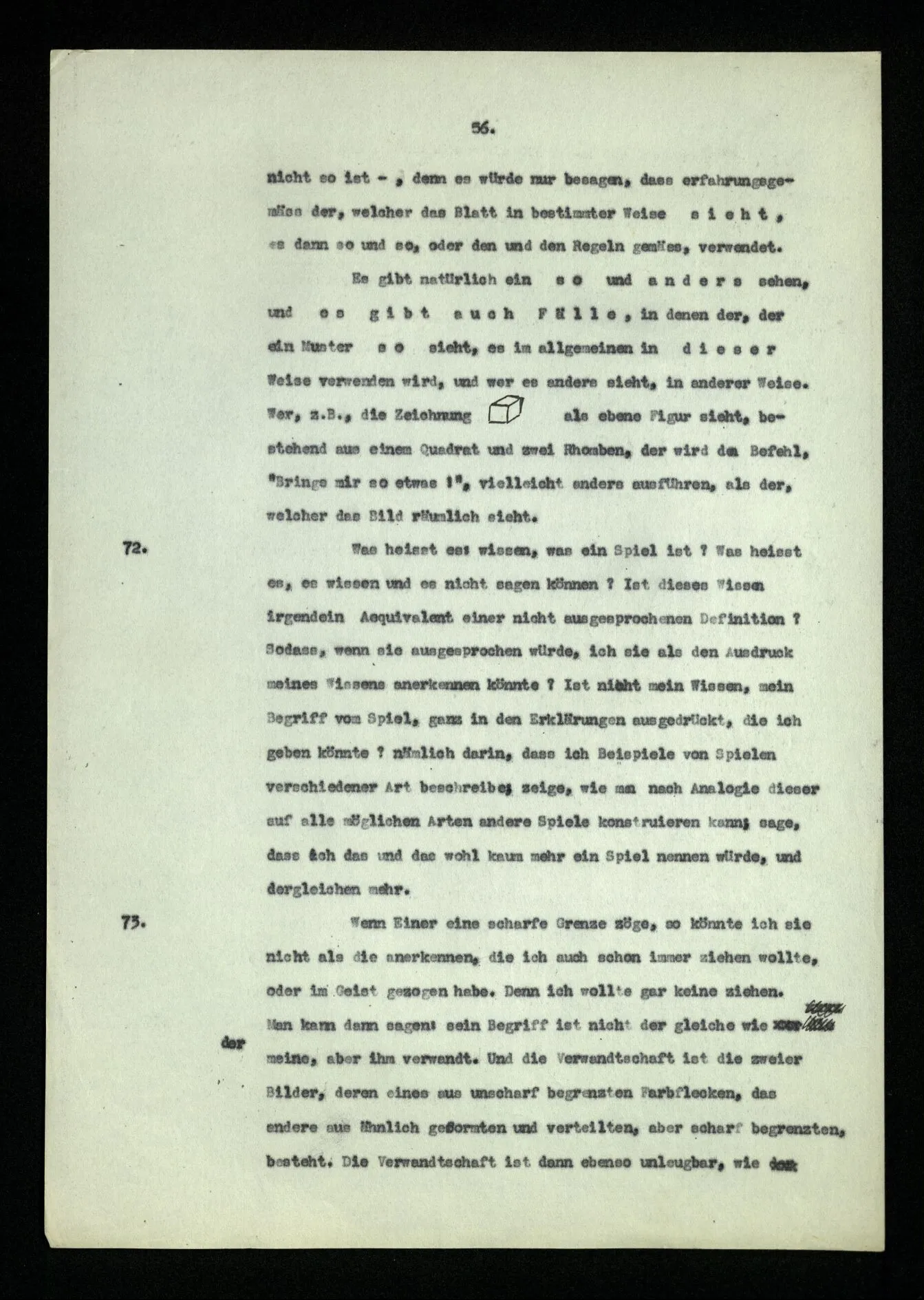 2. Denke nun an diese Verwendung der Sprache: – Ich schicke jemand einkaufen. Ich gebe ihm einen Zettel, auf diesem stehen die Zeichen: “fünf rote Äpfel”. Er trägt den Zettel zum Kaufmann; der öffnet die Lade, auf welcher das Zeichen “Äpfel” steht; dann sucht er in einer Tabelle das Wort “rot” auf und findet ihm gegenüber ein färbiges Täfelchen; nun sagt er die Reihe der Grundzahlwörter – ich nehme an, er weiß sie auswendig – bis zum Worte “fünf” und bei jedem Zahlwort nimmt er einen Apfel aus der Lade, der die Farbe des Täfelchens hat. – So, und ähnlich, operiert man mit Worten. – “Wie weiß er aber, wo und wie er das Wort “rot” nachschlagen soll und was er mit dem Wort “fünf” anzufangen hat?” – Nun, ich nehme eben an, er handelt, wie ich es beschrieben habe. Die Erklärungen haben irgendwo ein Ende. – Was ist aber die Bedeutung des Wortes “fünf”? – Von einer solchen war hier gar nicht die Rede; nur davon, wie das Wort “fünf” gebraucht wird.