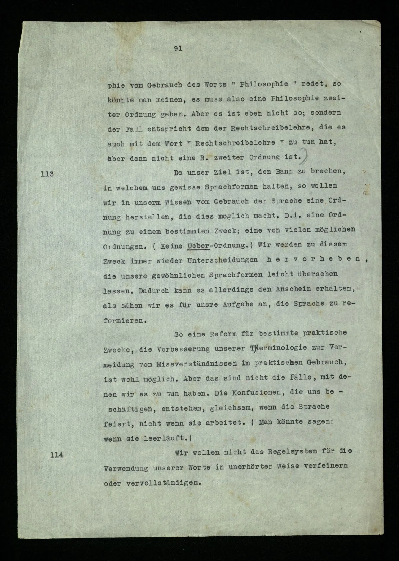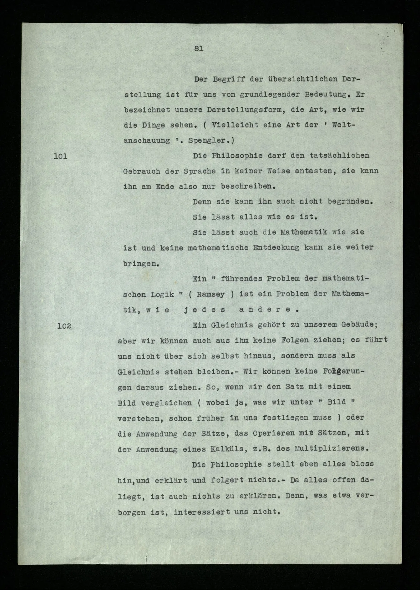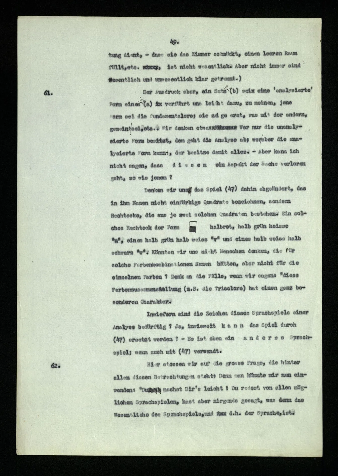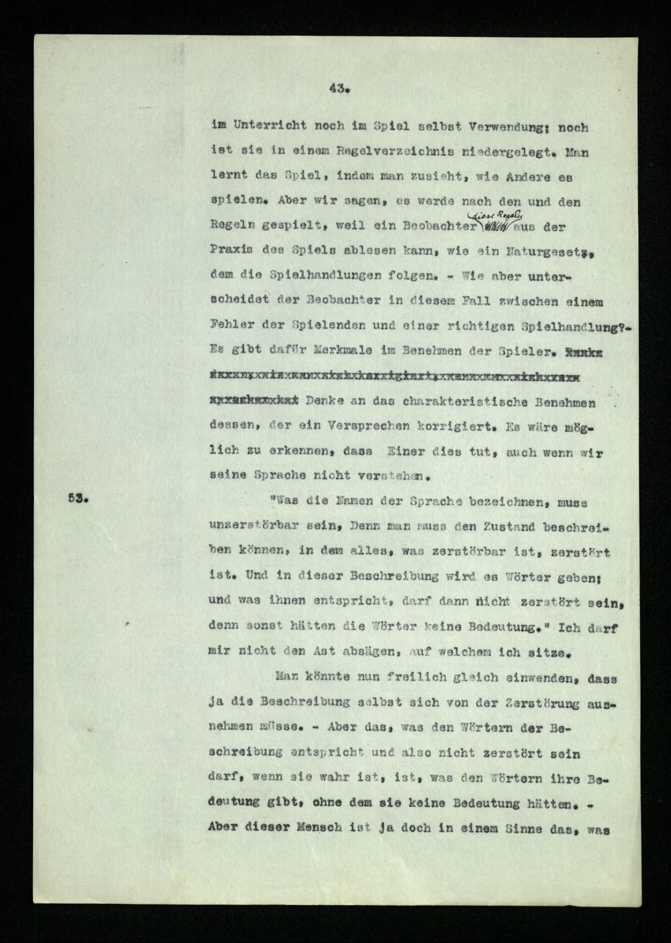 2. Denke nun an diese Verwendung der Sprache: – Ich schicke jemand einkaufen. Ich gebe ihm einen Zettel, auf diesem stehen die Zeichen: “fünf rote Äpfel”. Er trägt den Zettel zum Kaufmann; der öffnet die Lade, auf welcher das Zeichen “Äpfel” steht; dann sucht er in einer Tabelle das Wort “rot” auf und findet ihm gegenüber ein färbiges Täfelchen; nun sagt er die Reihe der Grundzahlwörter – ich nehme an, er weiß sie auswendig – bis zum Worte “fünf” und bei jedem Zahlwort nimmt er einen Apfel aus der Lade, der die Farbe des Täfelchens hat. – So, und ähnlich, operiert man mit Worten. – “Wie weiß er aber, wo und wie er das Wort “rot” nachschlagen soll und was er mit dem Wort “fünf” anzufangen hat?” – Nun, ich nehme eben an, er handelt, wie ich es beschrieben habe. Die Erklärungen haben irgendwo ein Ende. – Was ist aber die Bedeutung des Wortes “fünf”? – Von einer solchen war hier gar nicht die Rede; nur davon, wie das Wort “fünf” gebraucht wird.