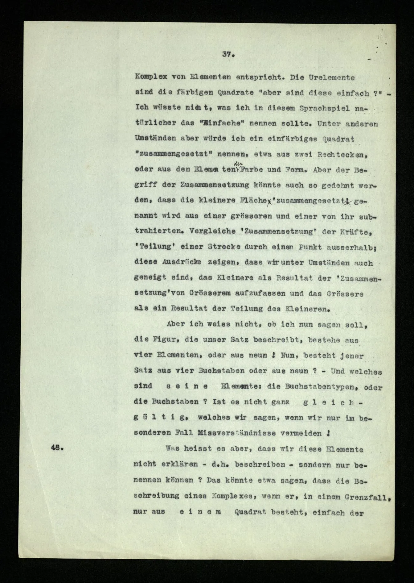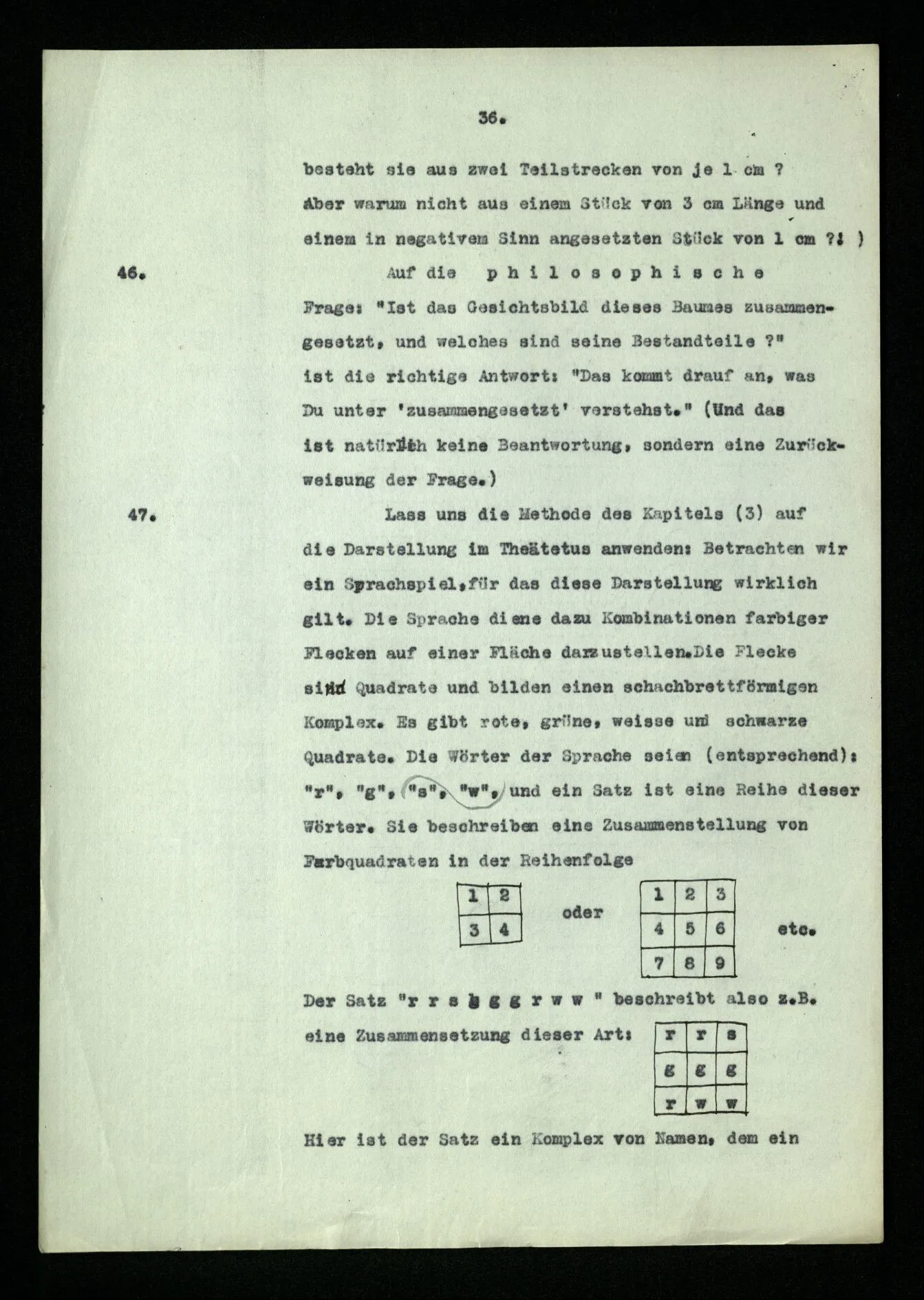 9. Sehen wir jetzt eine Erweiterung der Sprache (3) an: Außer den Wörtern “Würfel”, “Säule”, etc. enthalte sie eine Wörterreihe, die verwendet wird, wie der Kaufmann in (2) die Zahlwörter verwendet, es kann die Reihe der Buchstaben des Alphabets sein; ferner, zwei Wörter, sie mögen “dorthin” und “dieses” lauten, weil dies schon ungefähr ihren Zweck andeutet, – sie werden in Verbindung mit einer zeigenden Handbewegung gebraucht; und endlich verwenden wir noch gewisse Täfelchen in verschiedenen Farben. A gibt nun einen Befehl von der Art: “d Platte dorthin” – dabei läßt er den Gehilfen ein Farbtäfelchen sehen, und beim Worte “dorthin” zeigt er an eine Stelle. B nimmt von dem Vorrat der Platten je eine von der Farbe des Täfelchens für jeden Buchstaben des Alphabets bis zum “d” und bringt sie an den Ort den A bezeichnet. – Bei anderen Gelegenheiten gibt A den Befehl “dieses dorthin” – bei “dieses” zeigt er auf einen Baustein – u.s.w..