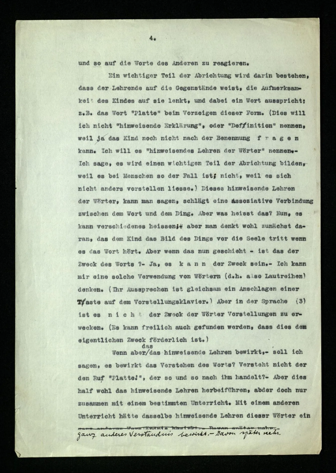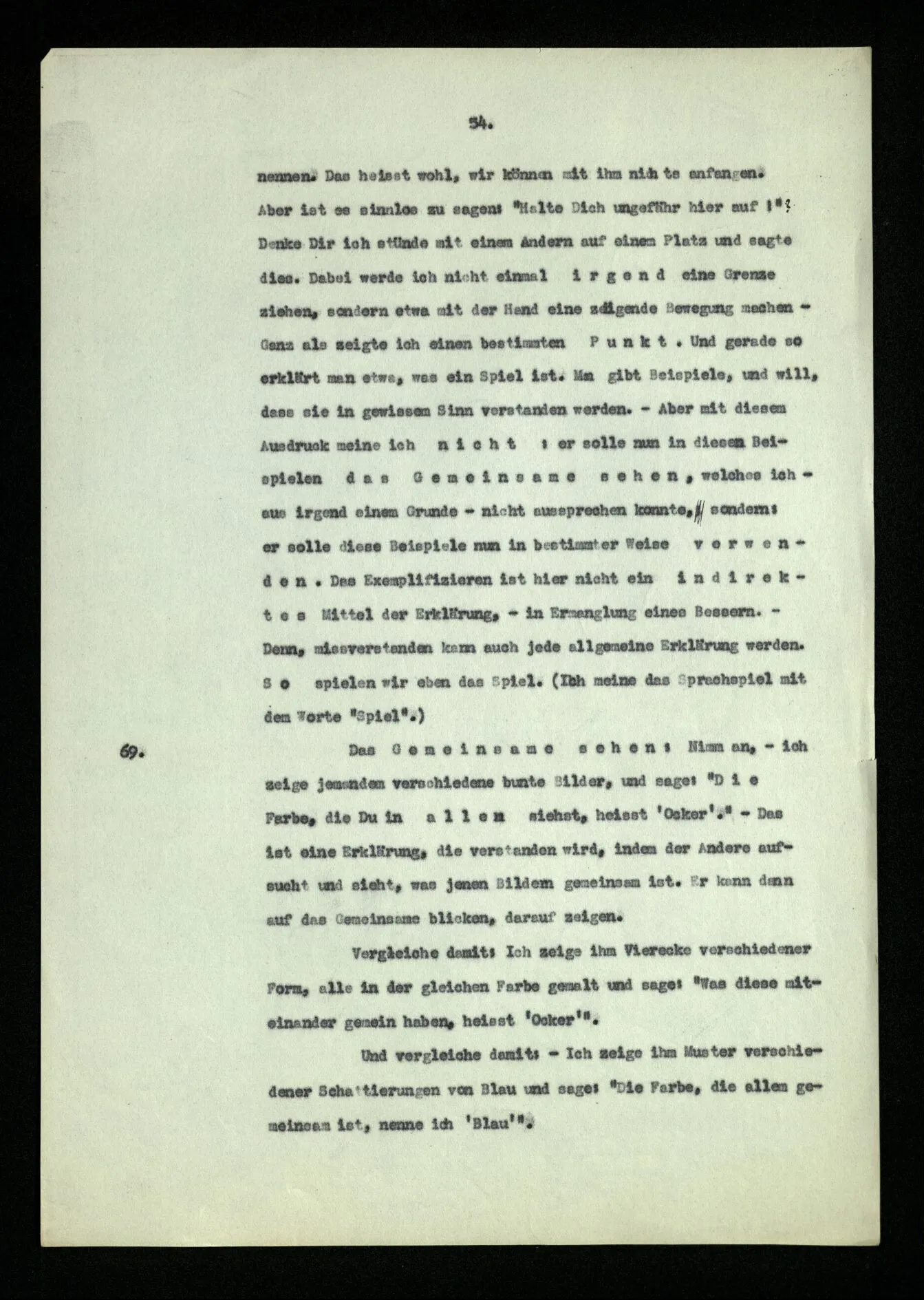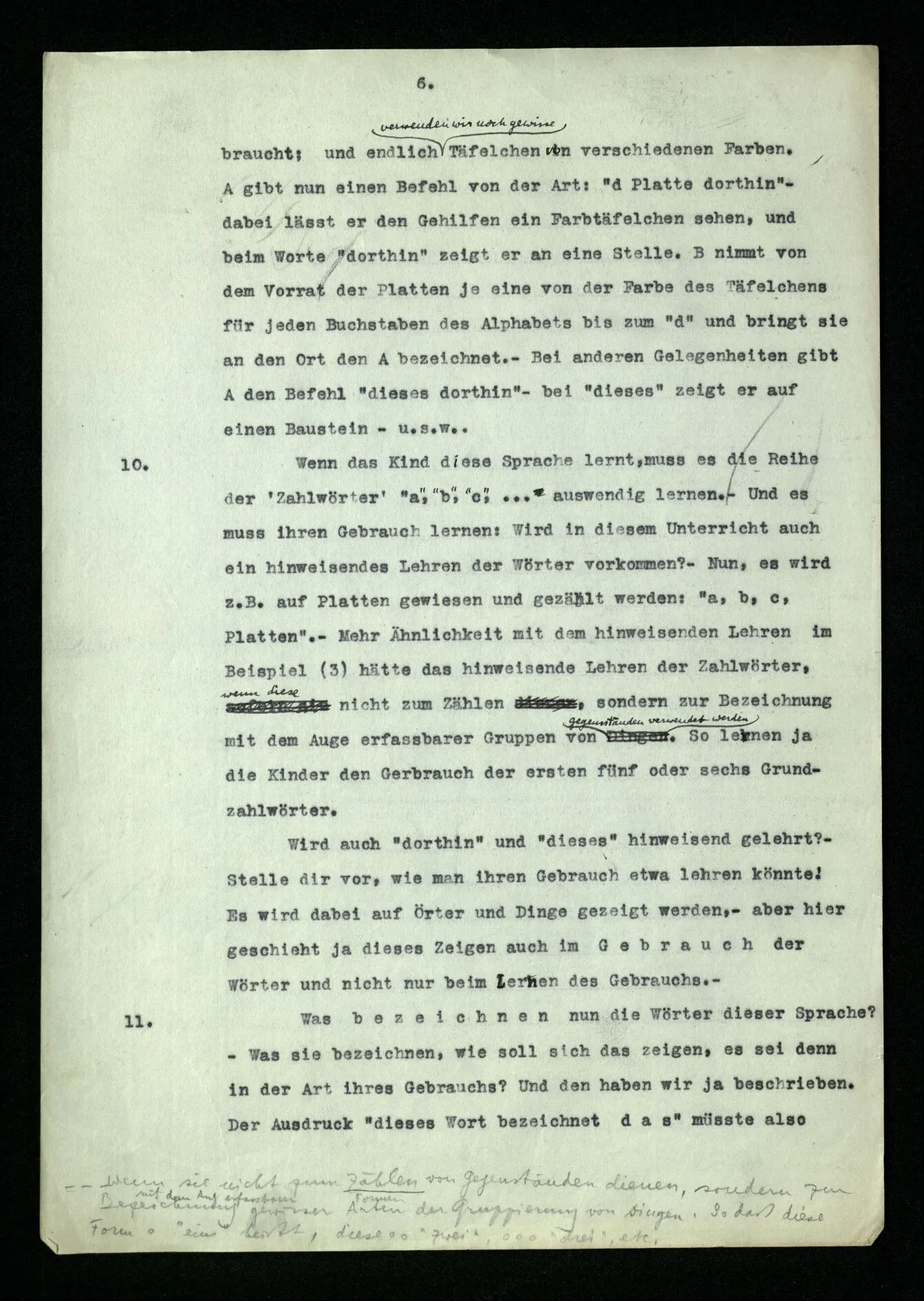10. Wenn das Kind diese Sprache lernt, muß es die Reihe der ‘Zahlwörter’ “a”, “b”, “c” … auswendig lernen. – Und es muß ihren Gebrauch lernen: Wird in diesem Unterricht auch ein hinweisendes Lehren der Wörter vorkommen? – Nun, es wird z.B. auf Platten gewiesen und gezählt werden: “a, b, c, Platten”. – Mehr Ähnlichkeit mit dem hinweisenden Lehren im Beispiel (3) hätte das hinweisende Lehren der Zahlwörter, wenn diese nicht zum Zählen, sondern zur Bezeichnung mit dem Auge erfaßbarer Gruppen von Gegenständen verwendet werden. Wird auch “dorthin” und “dieses” hinweisend gelehrt? – Stelle dir vor, wie man ihren Gebrauch etwa lehren könnte! Es wird dabei auf Örter und Dinge gezeigt werden, – aber hier geschieht ja dieses Zeigen auch im Gebrauch der Wörter und nicht nur beim Lernen des Gebrauchs. –