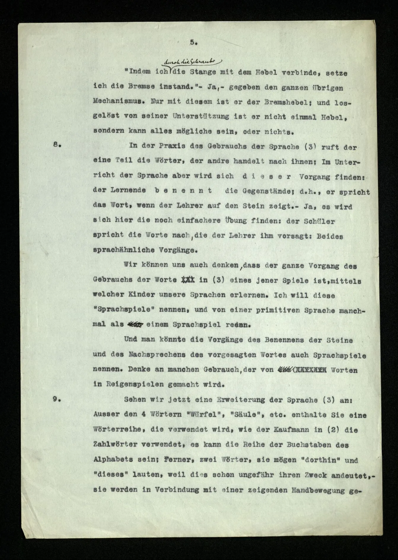 5. Denke dir eine Schrift, in welcher Buchstaben zur Bezeichnung von Lauten benützt würden, aber auch zur Bezeichnung der Betonung und auch als Interpunktionszeichen. (Eine Schrift kann man auffassen als Sprache zur Beschreibung von Lautbildern.) Denke dir nun, daß Einer jene Schrift so verstünde, als entspräche einfach jedem Buchstaben ein Laut, und als hätten die Buchstaben nicht auch ganz andere Funktionen. – So einer – zu einfachen – Auffassung der Schrift gleicht Auffassung der Sprache.