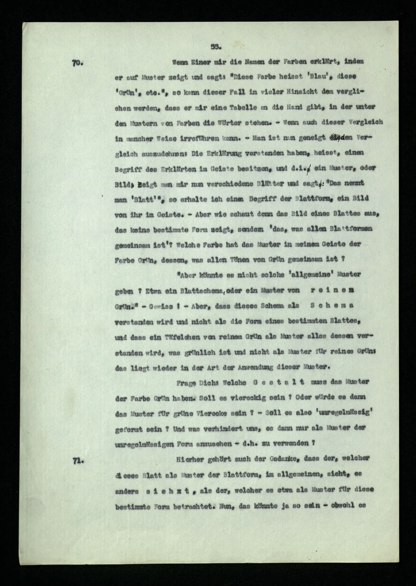 14. Wie ist es mit den Farbmustern, die A und B zeigt, – gehören sie zur Sprache? Nun, wie man will. Zur Wortsprache gehören sie nicht; aber wenn ich jemandem sage: “Sprich das Wort ‘das’ aus”, so wirst du doch dieses zweite “‘das’” in diesem Satz auch noch zum Satz rechnen. Und doch spielt es eine ganz ähnliche Rolle wie ein Farbtäfelchen im Sprachspiel (9); Es ist nämlich ein Muster dessen, was der Andere sagen soll, wie das Farbtäfelchen ein Muster dessen, was B bringen soll. Es ist das Natürlichste und richtet am wenigsten Verwirrung an, wenn wir die Muster zu den Werkzeugen der Sprache rechnen.
