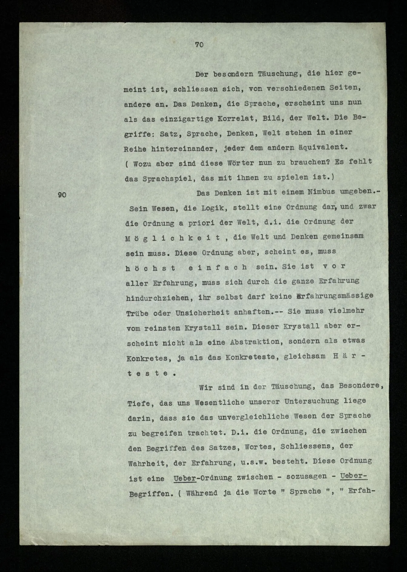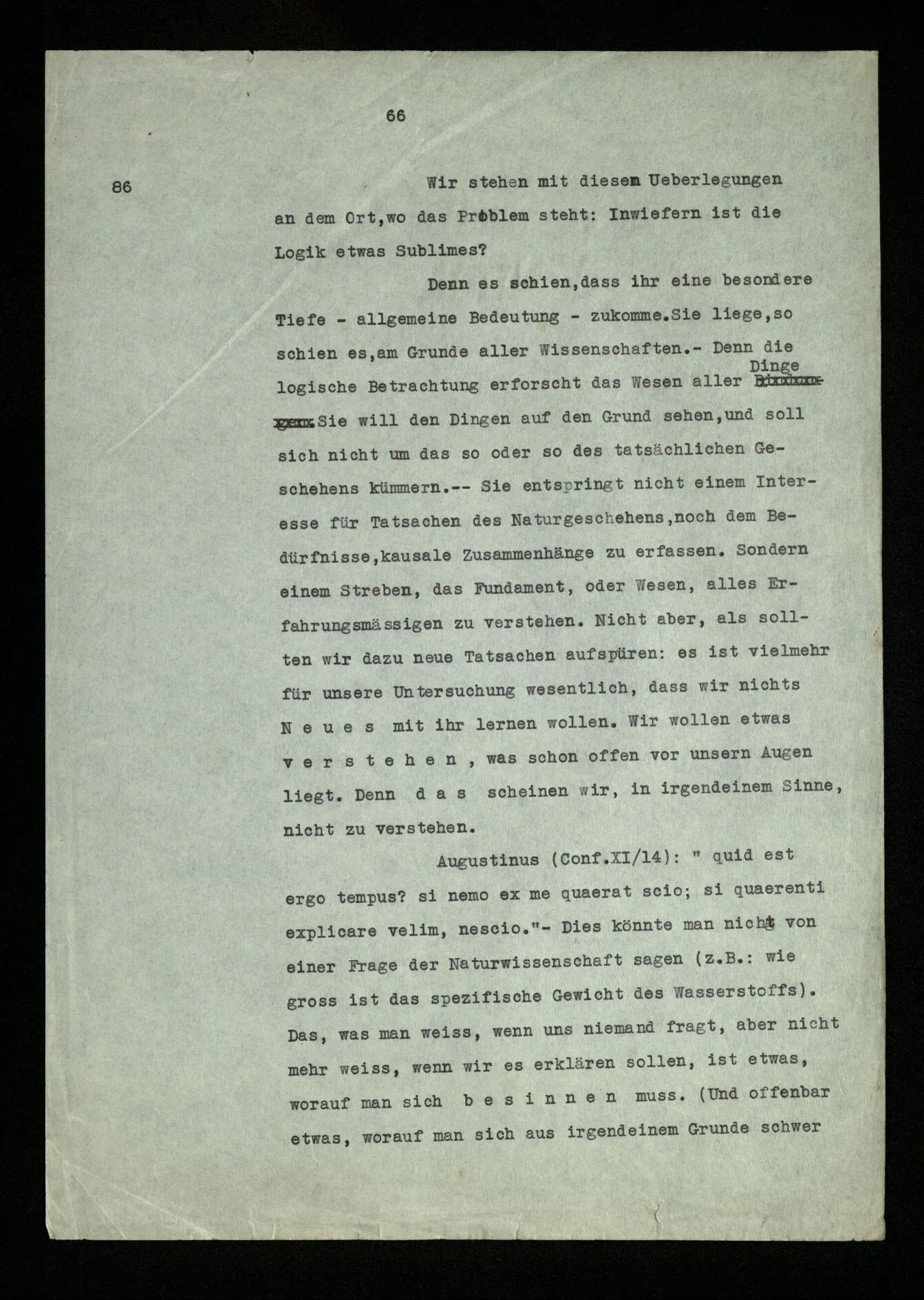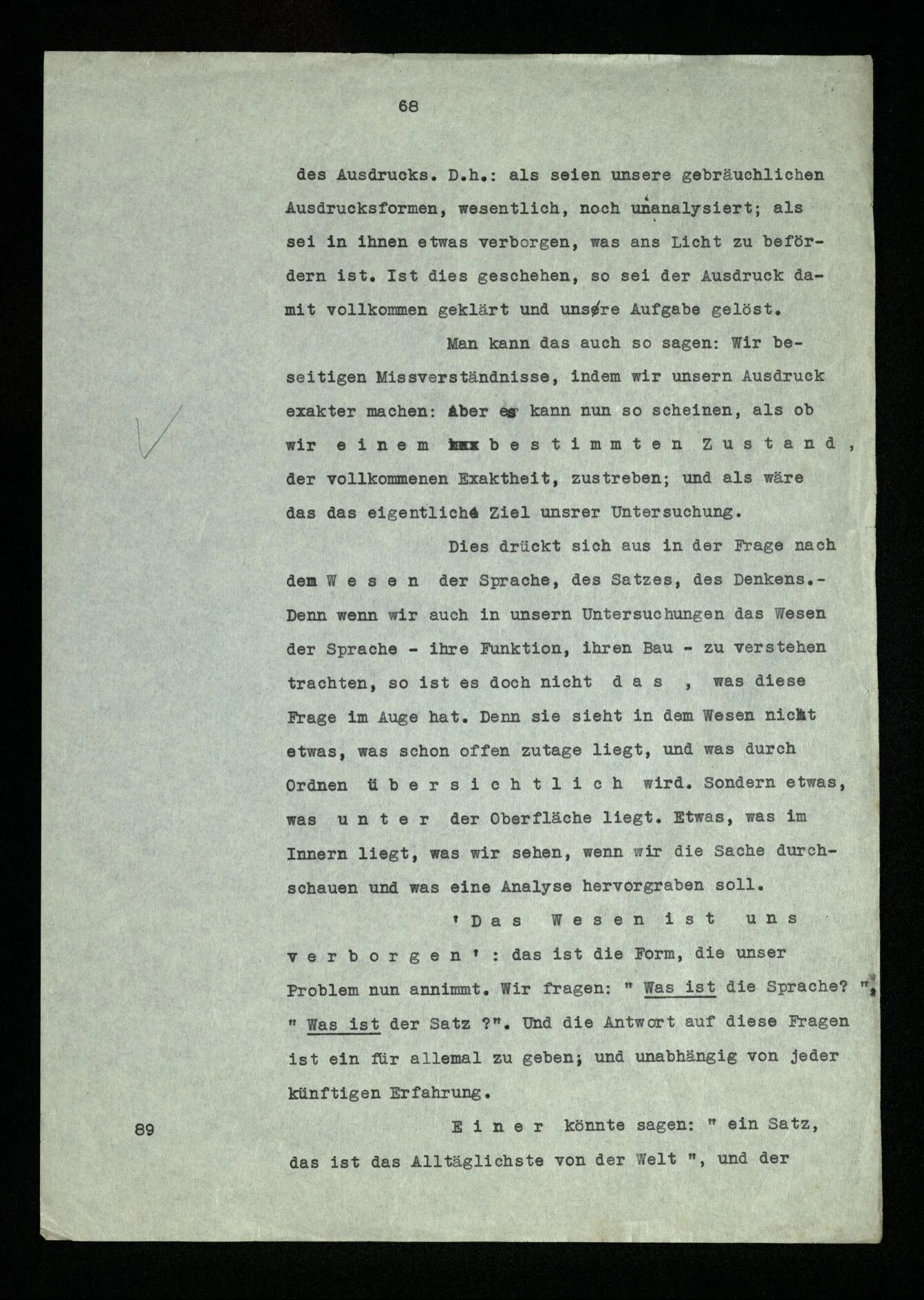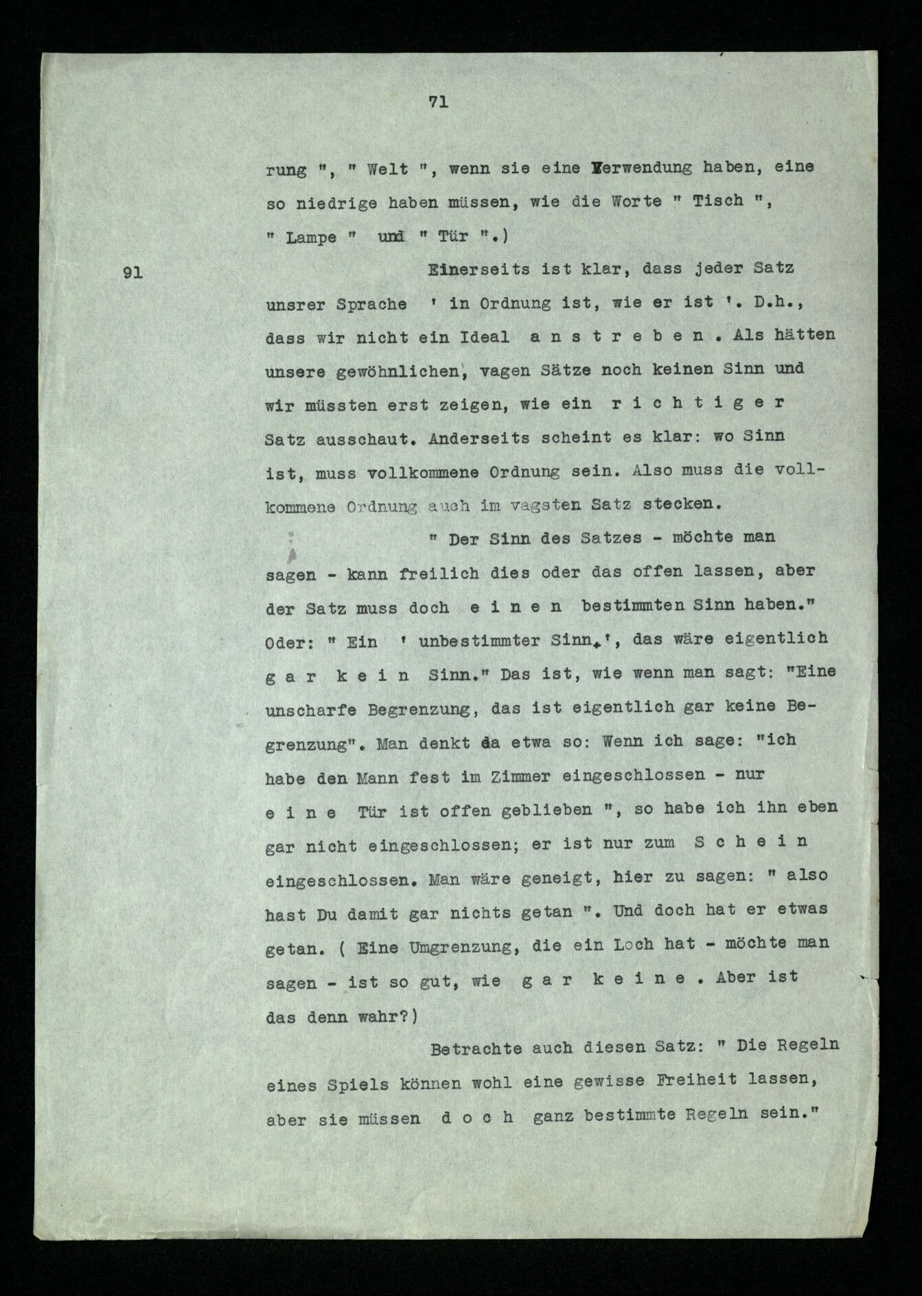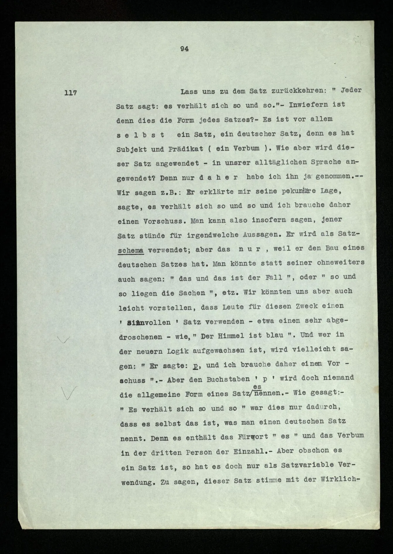 23. Der wichtige Sinn des Fregeschen Behauptungszeichens wird vielleicht am besten dadurch gefaßt, daß wir sagen: es bezeichnet deutlich den Anfang des Satzes. – Das ist wichtig: denn unsere philosophischen Schwierigkeiten das Wesen der ‘Negation’ und des ‘Denkens’ betreffend rühren, im gewissen Sinn, daher, daß wir nicht sehen, daß ein Satz “¬ nicht p”, oder “¬ich glaube p”, mit dem Satz “¬p” wohl “p” gemeinsam hat, aber nicht “¬ p”. (Denn wenn ich jemand sagen höre “es regnet”, so weiß ich nicht was er gesagt hat, wenn ich nicht weiß, ob ich den Anfang des Satzes gehört habe.)