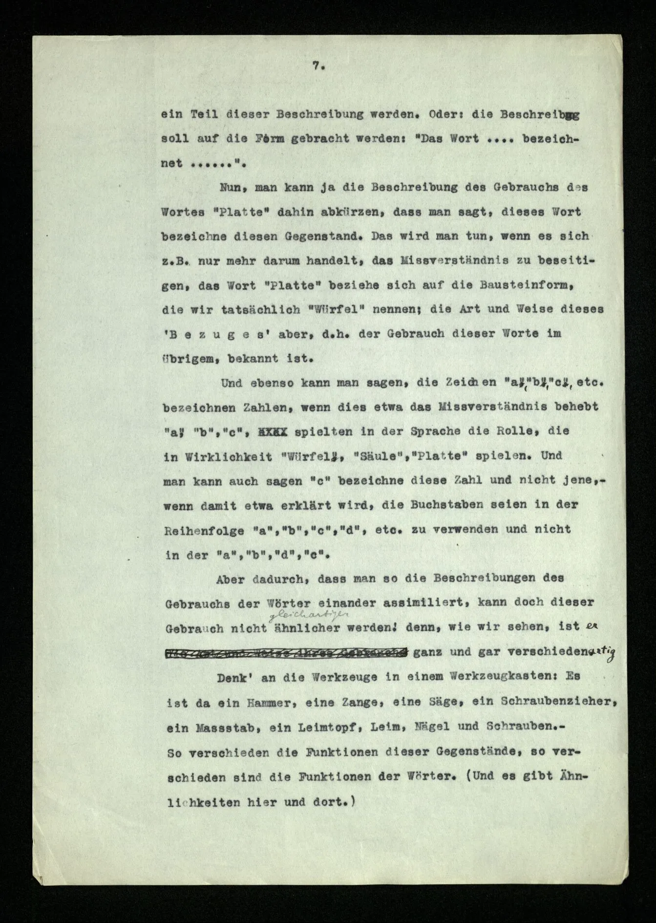 11. Was bezeichnen nun die Wörter dieser Sprache? – Was sie bezeichnen, wie soll sich das zeigen, es sei denn in der Art ihres Gebrauchs? Und den haben wir ja beschrieben. Der Ausdruck “dieses Wort bezeichnet das müßte also ein Teil dieser Beschreibung werden. Oder: die Beschreibung soll auf die Form gebracht werden: “Das Wort … bezeichnet …”. Nun, man kann ja die Beschreibung des Gebrauchs des Wortes “Platte” dahin abkürzen, daß man sagt, dieses Wort bezeichne diesen Gegenstand. Das wird man tun, wenn es sich z.B. nur mehr darum handelt, das Mißverständnis zu beseitigen, das Wort “Platte” beziehe sich auf die Bausteinform, die wir tatsächlich “Würfel” nennen; die Art und Weise dieses ‘Bezuges’ aber, d.h. der Gebrauch dieser Worte im Übrigem, bekannt ist. Und ebenso kann man sagen, die Zeichen “a”, “b”, “c”, etc. bezeichnen Zahlen, wenn dies etwa das Mißverständnis behebt “a”, “b”, “c”, spielten in der Sprache die Rolle, die in Wirklichkeit “Würfel”, “Säule”, “Platte” spielen. Und man kann auch sagen “c” bezeichne diese Zahl und nicht jene, – wenn damit etwa erklärt wird, die Buchstaben seien in der Reihenfolge “a”, “b”, “c”, “d”, etc. zu verwenden und nicht in der “a”, “b”, “d”, “e”. Aber dadurch, daß man so die Beschreibungen des Gebrauchs der Wörter einander assimiliert, kann doch dieser Gebrauch nicht ähnlicher werden: denn, wie wir sehen, ist er ganz und gar verschiedenartig. Denk’ an die Werkzeuge in einem Werkzeugkasten: Es ist da ein Hammer, eine Zange, eine Säge, ein Schraubenzieher, ein Maßstab, ein Leimtopf, Leim, Nägel und Schrauben. – So verschieden die Funktionen dieser Gegenstände, so verschieden sind die Funktionen der Wörter. (Und es gibt Ähnlichkeiten hier und dort.)